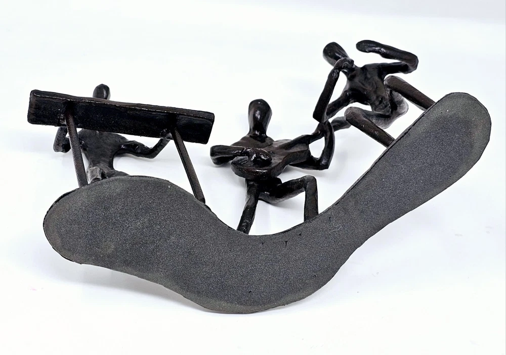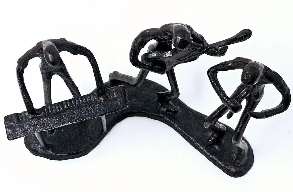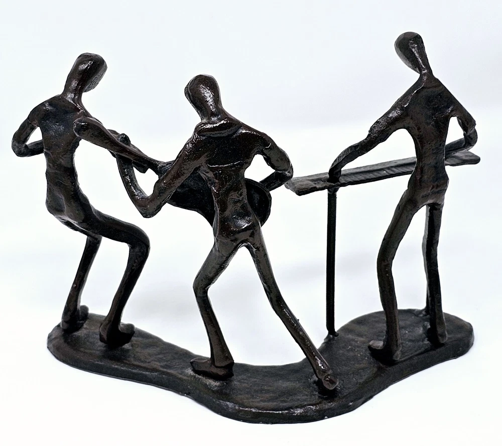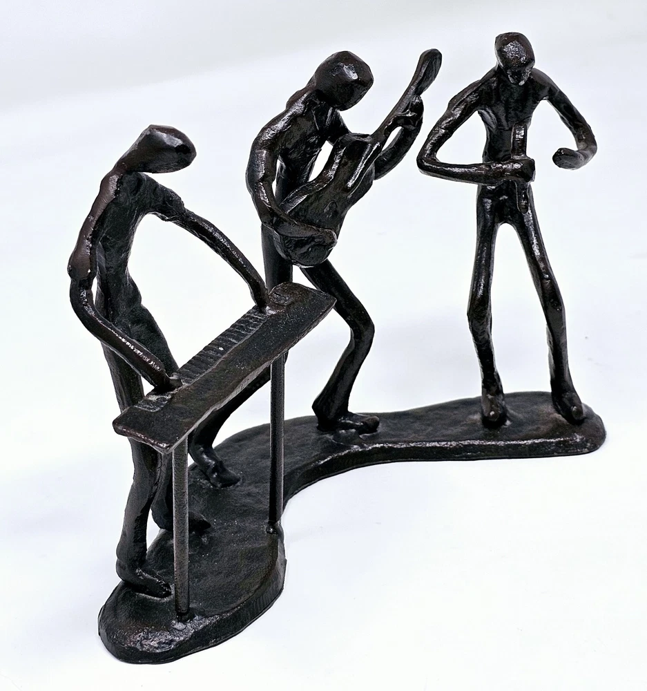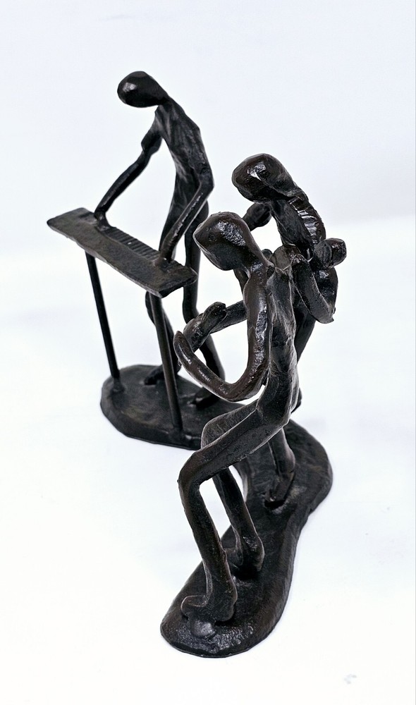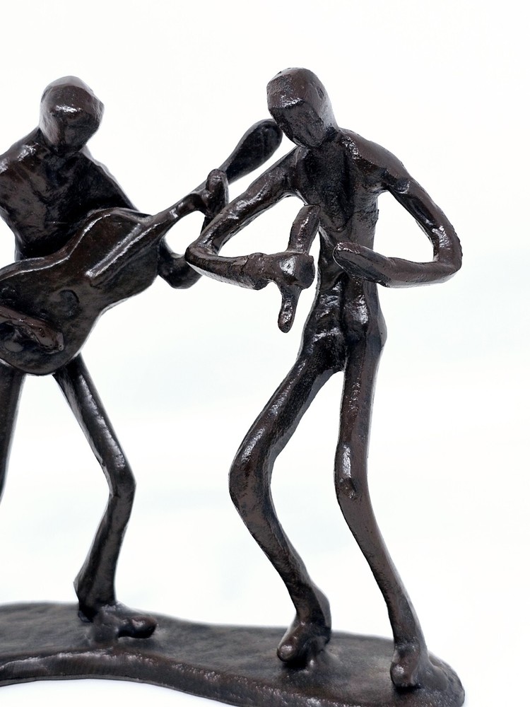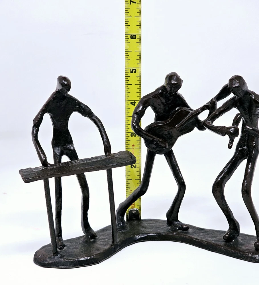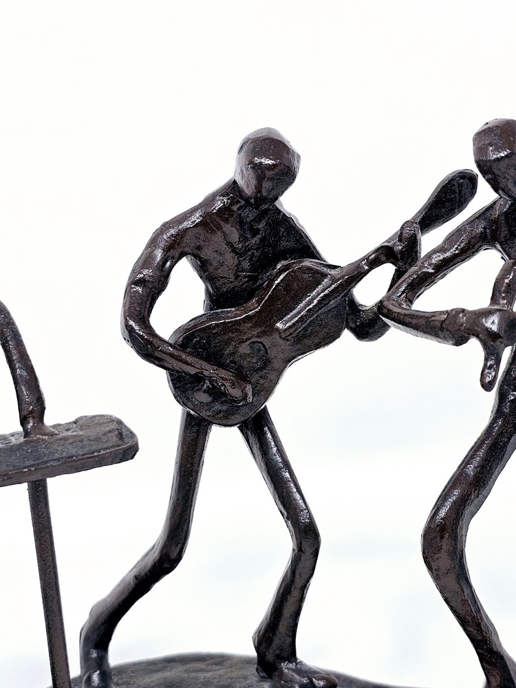 Great condition, no damage seen. Bottom has a protective cloth to prevent scratching on surfaces. This stunning sculpture is a must-have for any art lover or music enthusiast. Crafted from high-quality bronze, this small statue captures the essence of a guitar player, pianist, and singer in a brutalist style that is both unique and striking. Measuring 5 inches in height and 7 inches in length, this sculpture is perfect for display in any space. The intricate details and impressive artistry of this piece make it a true collector's item. Whether you're looking to add to your collection or simply want to enjoy the beauty of this sculpture, it's sure to impress. So why wait? Add this remarkable piece to your collection today!