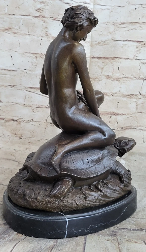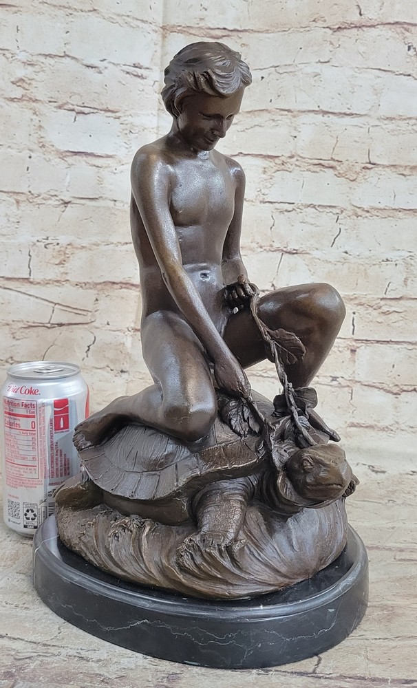 Condition : This sculpture is in a perfect condition. Bronze Dimensions with Marble Base: Height 13" X Width 9" Marble Dimensions: Diameter 9" Height without base:12" Weight:15 LBS Inventory:18Y20525981 Joyful Boy Riding a Turtle by A. Mercie This captivating sculpture depicts a young boy joyfully riding a turtle, showcasing an endearing scene filled with youthful exuberance and playfulness. The artist has meticulously crafted every detail, from the turtle's closed eyes, reflecting its frustration, to the boy's joyful expression as he enjoys the playful ride. The sculpture captures a moment of innocent mischief, with the boy, completely nude, using a rope threaded through the turtle's mouth for a secure grip, showcasing a whimsical interaction between the child and his pet. Detailed and Expressive Craftsmanship The sculpture is a remarkable representation of the bond between the boy and his turtle, highlighting a playful dynamic where the boy seems to take advantage of the turtle's size and slow pace. The expressions on both figures are finely detailed, with the turtle appearing slightly annoyed but compliant, and the boy radiating delight and mischievous energy. This piece beautifully captures the essence of childhood curiosity and the innocent exploration of one's surroundings. Timeless Bronze Artistry Crafted using the ancient "Lost Wax Method," this sculpture is a testament to traditional bronze casting techniques, ensuring high-quality craftsmanship and lasting durability. The piece is handmade in 100% bronze, with a rich patina finish that adds depth and character. It is mounted on a smooth, black round marble base, providing a stable and elegant foundation. Signed by the artist A. Mercie, this sculpture is not only a delightful decorative piece but also a fine example of artistic expression and craftsmanship. Perfect for art collectors and those who appreciate the charm of childhood memories, this sculpture will be a treasured addition to any collection. Signed Mercie Nude Boy Riding Turtle Bronze Sculpture Marble Base Figurine Decor Video will open in a new window Using the eBay App? Paste link into a browser window: [isdntekvideo]