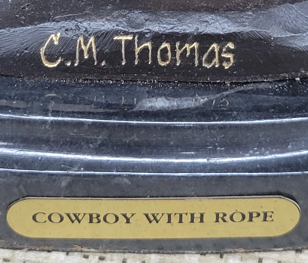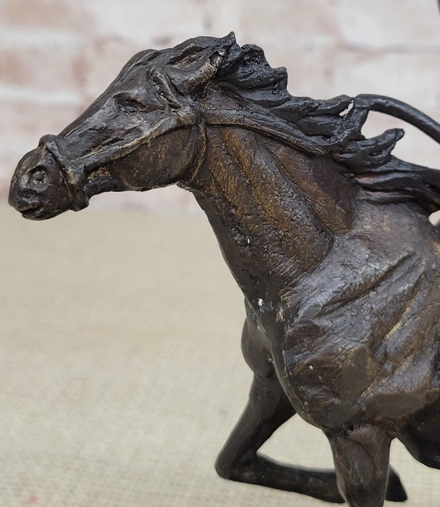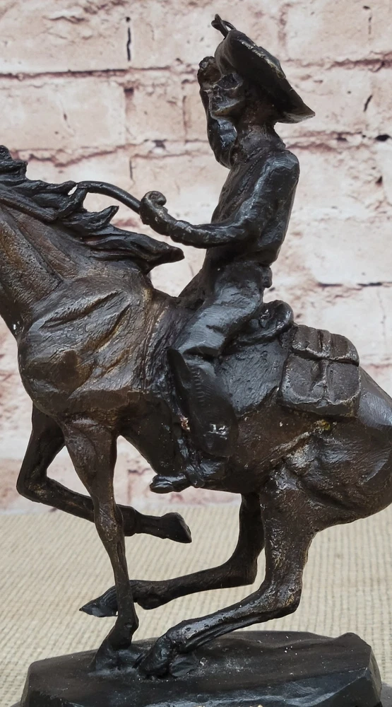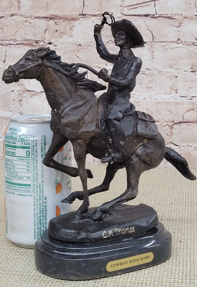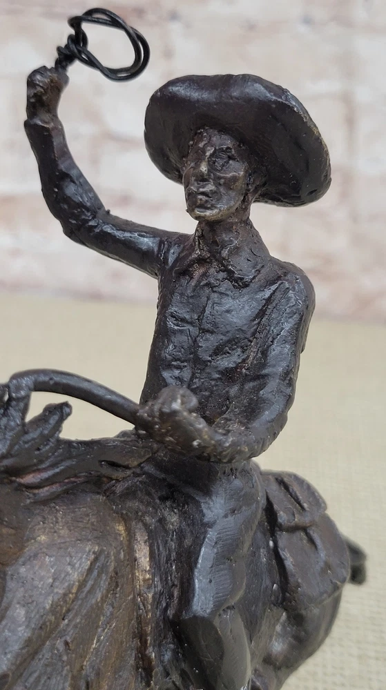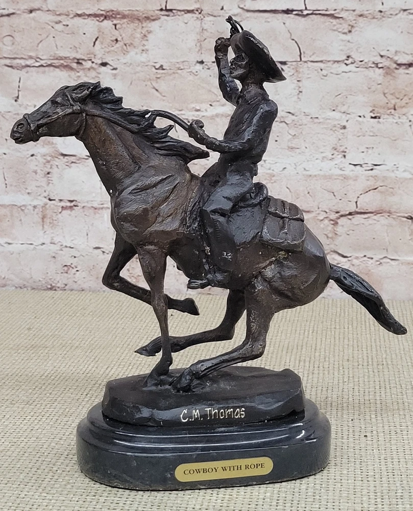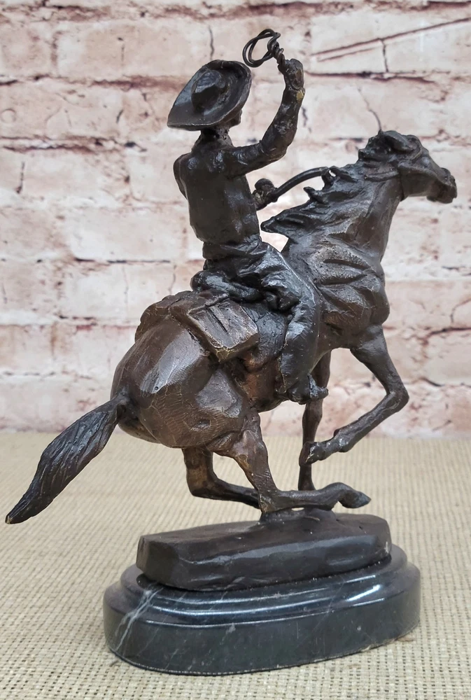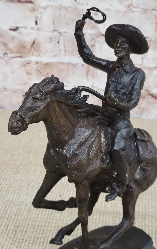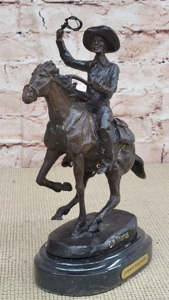 Condition : This sculpture is in perfect condition. Bronze Dimensions with Marble Base: Height 9" x Width 10" Marble Dimensions: Diameter 6" Height without base:8" Weight:7 LBS Inventory:49-631204594 This captivating bronze sculpture immortalizes a fearless cowboy in the midst of a gripping struggle with his untamed stallion. The scene exudes the essence of the Wild West, as the seasoned cowboy demonstrates unwavering courage and determination. Despite the relentless efforts of the bucking horse, the cowboy's grip on the reins remains unbroken. Dressed in classic cowboy attire, complete with a shirt, chaps, and boots, the rider embodies the spirit of the American frontier. The intricately detailed sculpture captures the dynamic movement of both horse and rider. The horse's saddle stays securely in place as it kicks and leaps, while the cowboy's body rolls with the relentless motion. Crafted using the time-honored "Lost Wax Method," this sculpture exemplifies the artist's dedication to preserving the essence of this challenging encounter. The brown patina finish adds depth and character to the piece. Mounted on a black marble base and signed by the artist Thomas, this sculpture stands as a testament to the resilience and indomitable spirit of those who conquered the untamed West. Original Seasoned Cowboy on Horse Western Old West Bronze Sculpture Statue Gift www.bronzhaus.com Video will open in a new window Using the eBay App? Paste link into a browser window: [isdntekvideo]