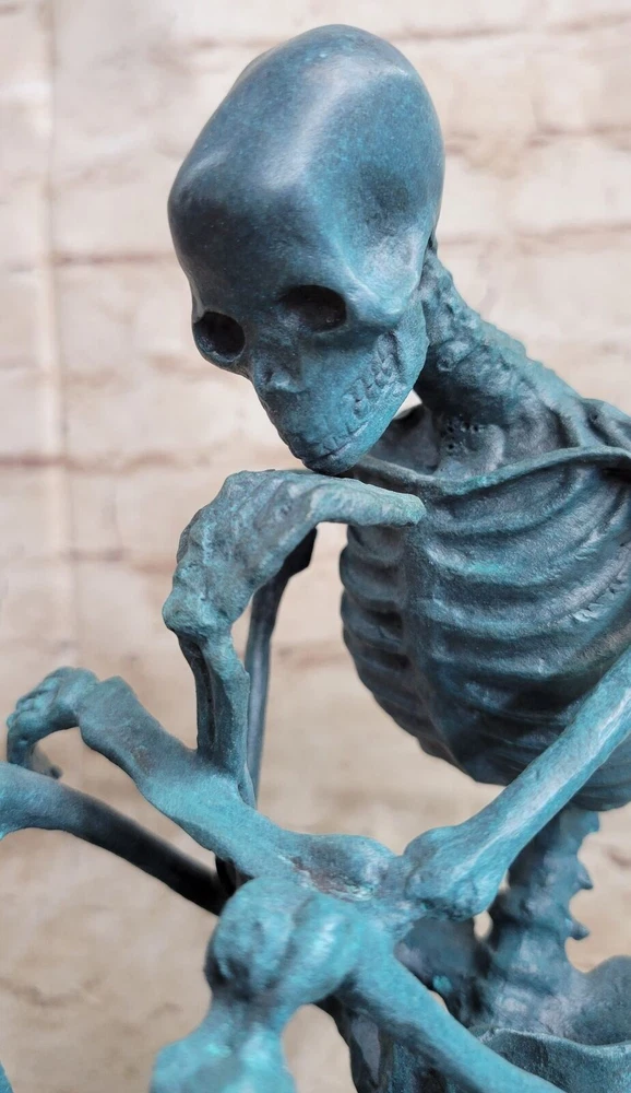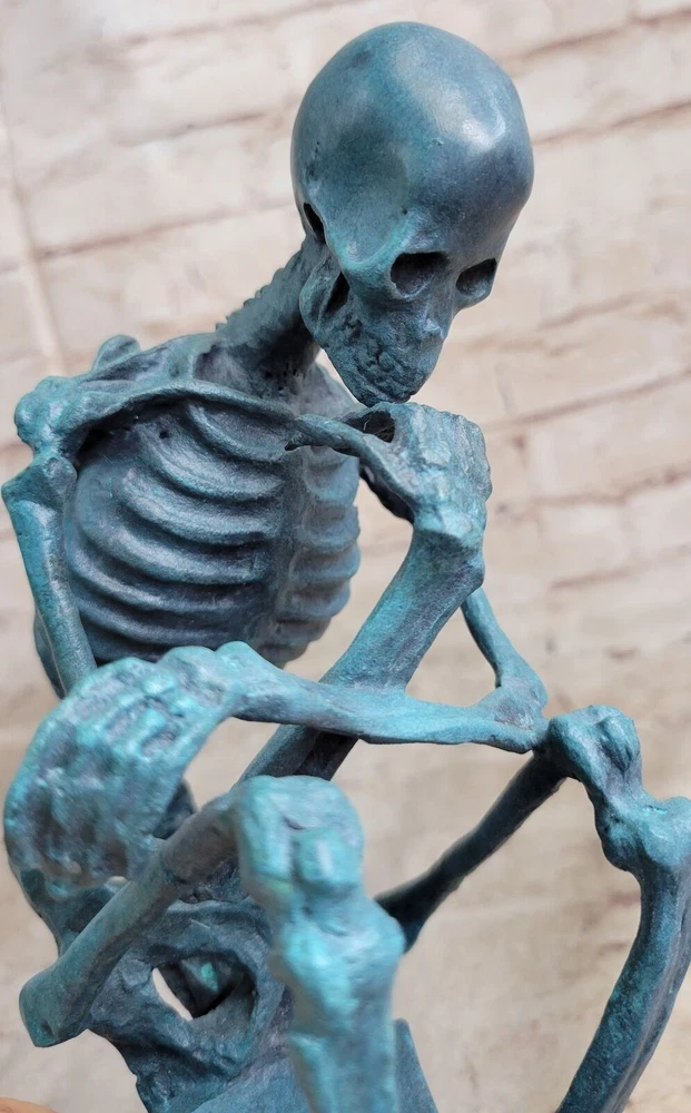 Condition :nbsp; This sculpture is in a perfect condition Bronze Dimensions with Marble Base :Height 10" X Width 8" Marble Dimensions:5" X 5" Height without base:9" Weight:10 LBS Inventory:63DS055C5636 Introducing a captivating bronze sculpture inspired by Auguste Rodin's iconic masterpiece, The Thinker. This rendition offers a unique twist, presenting a skeletal version of the renowned figure. Originally titled The Poet, The Thinker was intended to depict Dante contemplating a scene from his Divine Comedy. However, Rodin's vision transcended its initial context, embracing a more universal theme. This sculpture captures the essence of introspection and the internal struggle faced by individuals deep in thought. The skeletal figure is depicted in a stoic and contemplative pose, with one hand resting on the chin and the other elbow supported by the knee. The crouching position allows the sculpture to survey its surroundings with a profound and reflective gaze. The intricate details of the skeleton, from the curves of the spine to the exposed ribcage, are meticulously crafted, showcasing the artist's attention to anatomical accuracy. Crafted with utmost care, this sculpture is cast in 100% bronze using the revered "Lost Wax Method," ensuring its durability and timeless appeal. Mounted on a sturdy marble base, the sculpture exudes a sense of stability and elegance. It is signed by the esteemed artist Milo, a testament to its artistic value and authenticity. This thought-provoking sculpture serves as a reminder to embrace contemplation and the power of deep thinking, making it a remarkable addition to any collection. The Thinker Thinking Man Skeleton Bronze Metal Statue Sculpture Figure on Marble Base DS-055C Video will open in a new window Using the eBay App? Paste link into a browser window: [isdntekvideo]