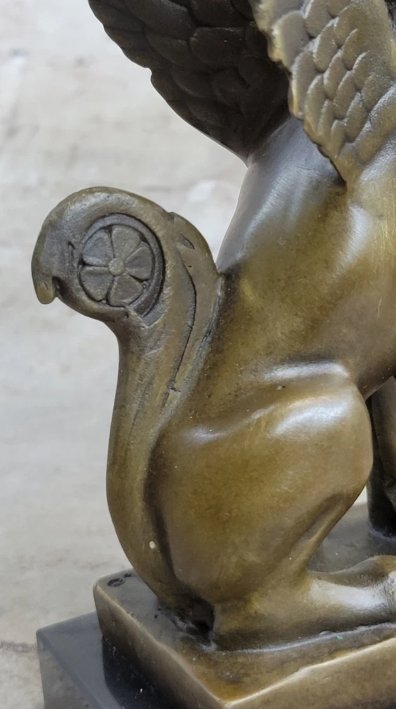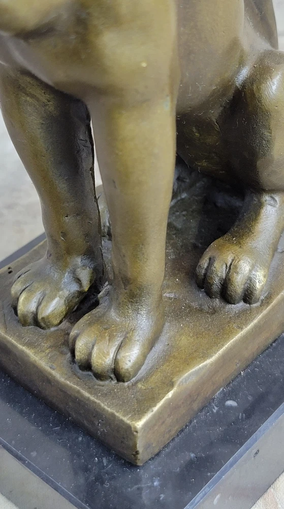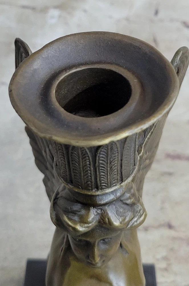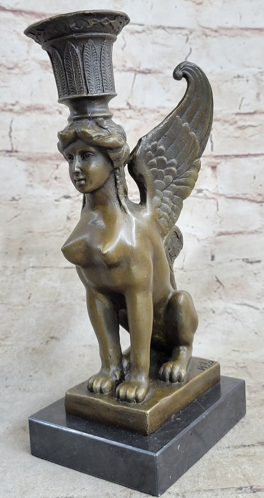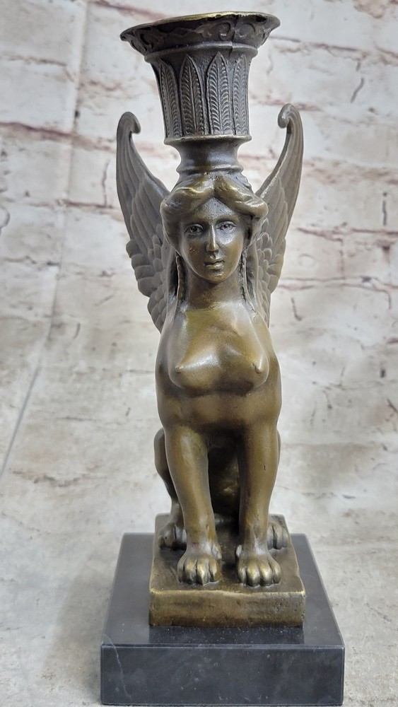 Condition :nbsp; This sculpture is in a perfect condition. Bronze Dimensions with Marble Base: Height 9" X Width 4" Marble Dimensions:4" X 3" Height without base:8" Weight:5 LBS Inventory: 67CH0034656 This exquisite candle holder features the Sphinx, a legendary creature from Greek mythology known for her riddles and deadly embrace. Depicted with the body of a lion and the head of a woman, the Sphinx is captured in stunning detail in this bronze sculpture. Her golden bronze skin and long hair tresses add to her allure and the dark brown and gold patina finish gives the piece a timeless quality. As a nod to the Greek origin of the Sphinx, this sculpture is created using the ancient lost-wax casting method, which was first developed in Greece over 2500 years ago. The name "Sphinx" comes from the Greek word "sphiggo," meaning "to strangle," referencing the Sphinx's reputation for killing those who could not solve her riddles. This handcrafted candle holder rests on a unique pedestal, with the Sphinx's body forming the feet of the base. The piece is signed by the artist Milo, ensuring its authenticity and adding to its value as a stunning work of art. Nude Female Sphinx Candle Holder Candelabra Bronze Statue Sculpture Figure CH-OO3 Video will open in a new window Using the eBay App? Paste link into a browser window: [isdntekvideo]