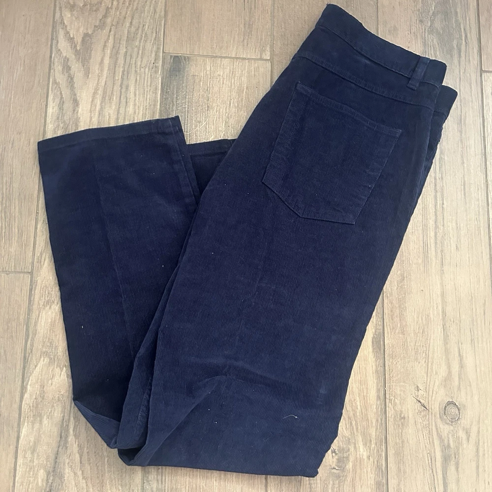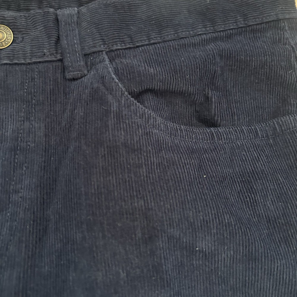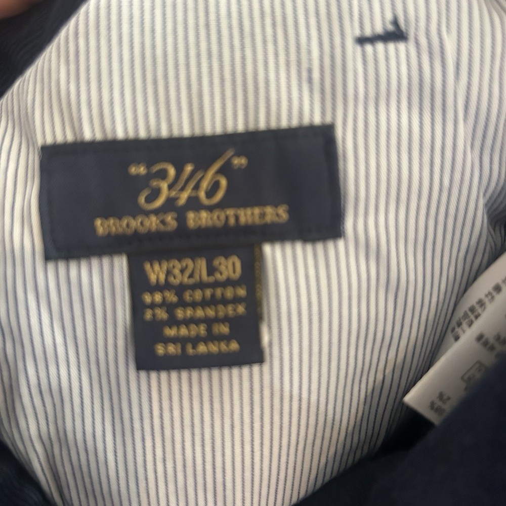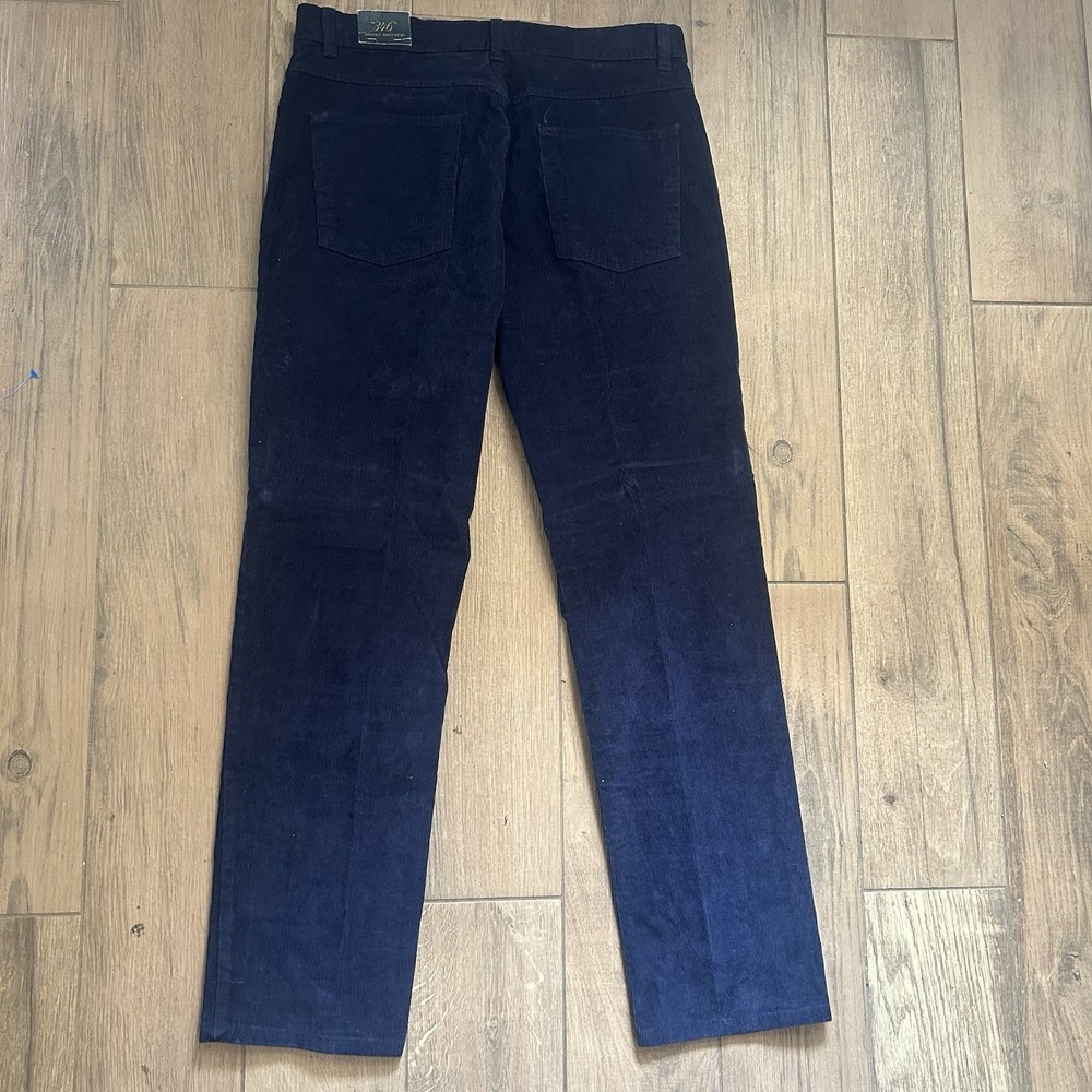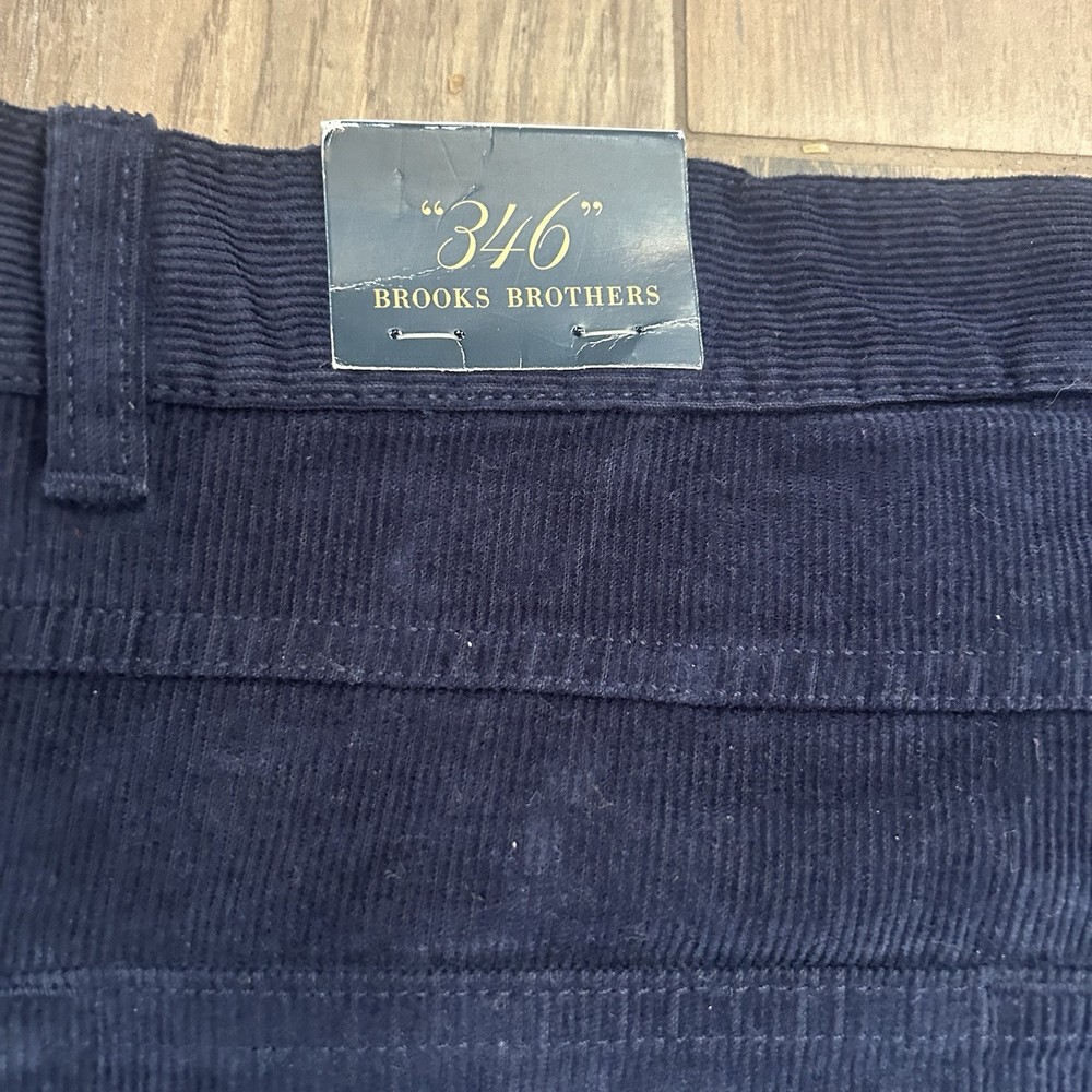 The product is a pair of Brooks Brothers men's pants in a dark navy blue corduroy material, featuring a Clark fit. These flat front pants have a zip closure, button accents, and a straight leg style. They are designed for a regular fit, size 32 waist, and a 30-inch inseam, making them suitable for travel, casual, and business occasions. With their vintage appeal and preppy style, these dress pants offer comfort, stretch, and pockets for added functionality. Ideal for the city dweller looking for a classic yet modern wardrobe staple.