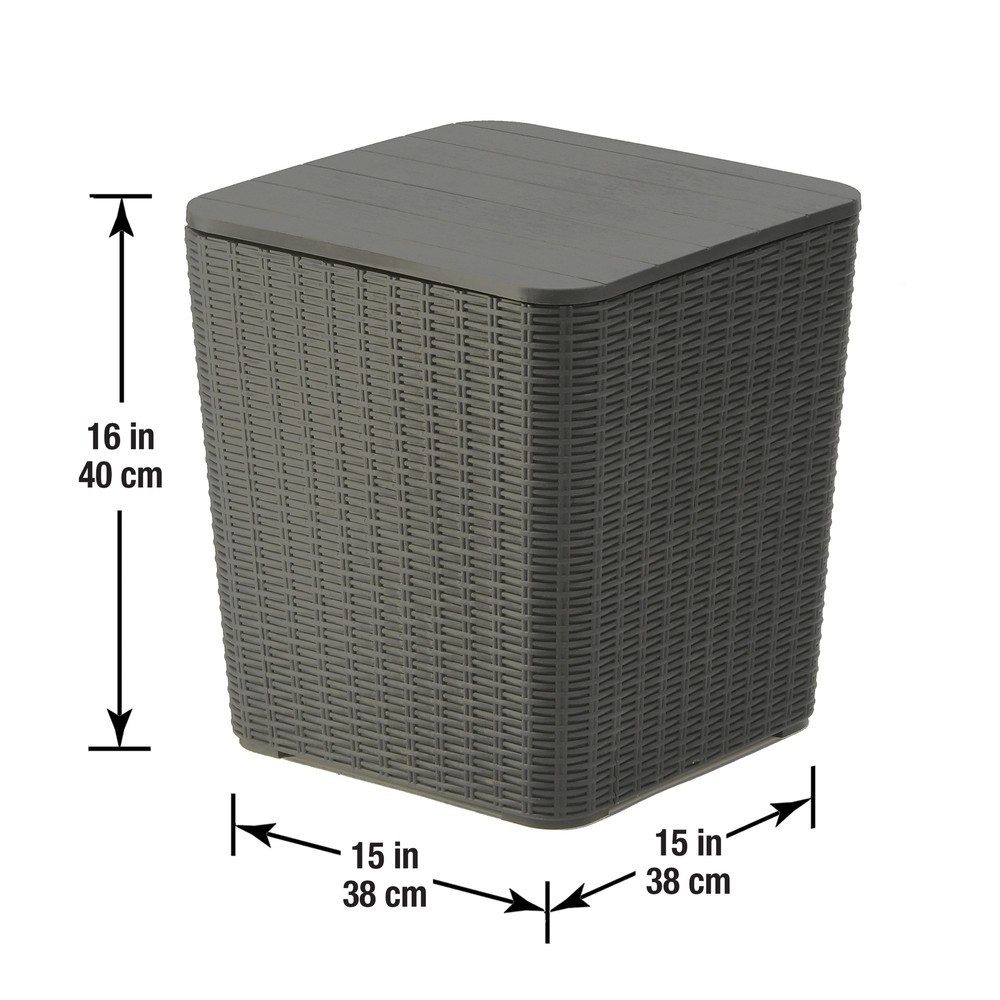 The Arendal Collection Wicker Texture All-Weather Storage Box is constructed with high-strength injection-molded polypropylene material that is durable, weather-resistant, and long-lasting. Its appealing wicker weave texture and removable lid make for easy interior access, and its lightweight material allows for easy transport. With an 11-gallon capacity, this box is perfect for storing and keeping dry pillows, blankets, toys, or towels. Simple assembly required.Features: High-strength injection-molded polypropylene material Wicker weave texture Removable lid for easy interior access Lightweight material for easy transport 11-gallon capacity for storing and keeping dry items Simple assembly requiredAdditional Details: Dimensions: 20"L x 15.5"W x 12.7"H Weight: 4.2 lb. Free Shipping Over $49.99* Details Arendal Collection Wicker Texture All-Weather Storage Box by National Tree Product Description: The Arendal Collection Wicker Texture All-Weather Storage Box is constructed with high-strength injection-molded polypropylene material that is durable, weather-resistant, and long-lasting. Its appealing wicker weave texture and removable lid make for easy interior access, and its lightweight material allows for easy transport. With an 11-gallon capacity, this box is perfect for storing and keeping dry pillows, blankets, toys, or towels. Simple assembly required. Features: High-strength injection-molded polypropylene material Wicker weave texture Removable lid for easy interior access Lightweight material for easy transport 11-gallon capacity for storing and keeping dry items Simple assembly required Additional Details: Dimensions20"L x 15.5"W x 12.7"H Weight4.2 lb.
