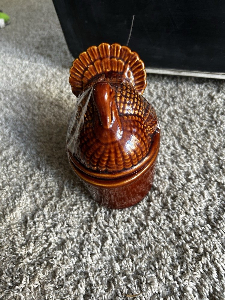 Elevate your Thanksgiving table with the World Market Turkey Ceramic Covered Dish, a perfect blend of functionality and festive charm. This brown glazed, textured dish measures 5 inches, making it an ideal size for your holiday feast. Crafted from high-quality ceramic, it promises durability and a touch of elegance to your seasonal celebrations. With its unique design, this covered dish is not just a practical piece for serving but also a collectible that can be cherished year after year. This dish is in great condition and is very gently used.