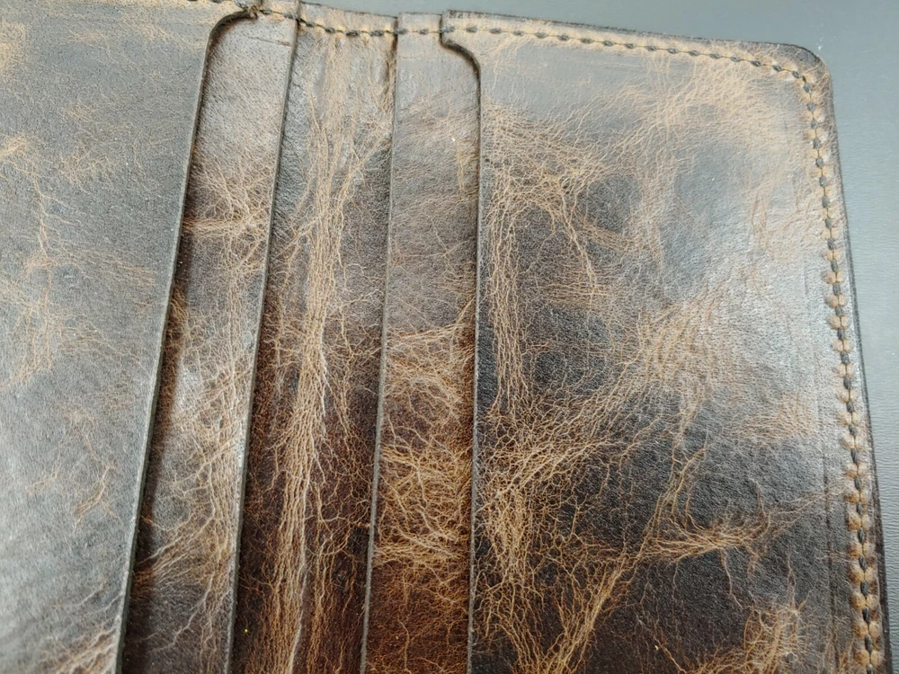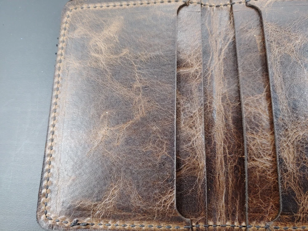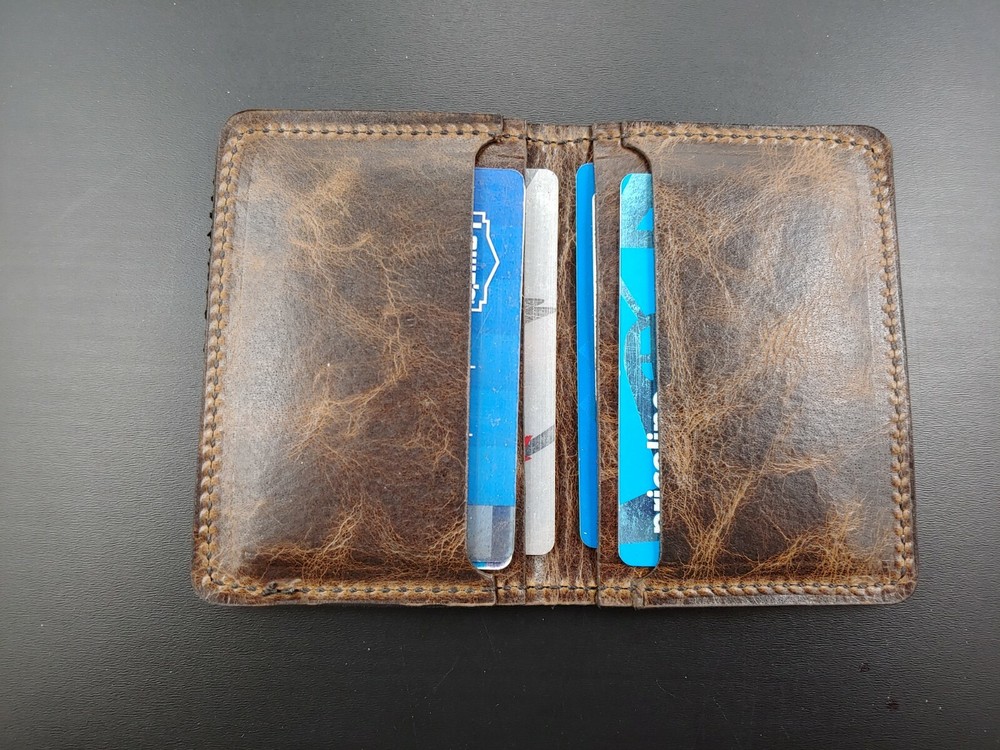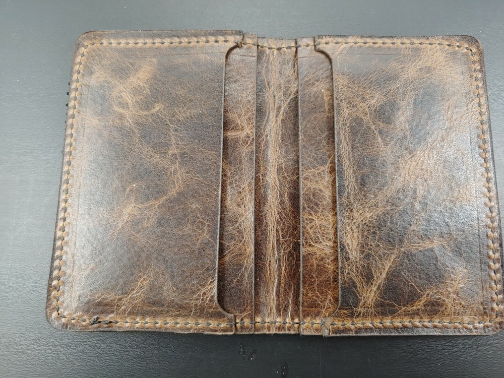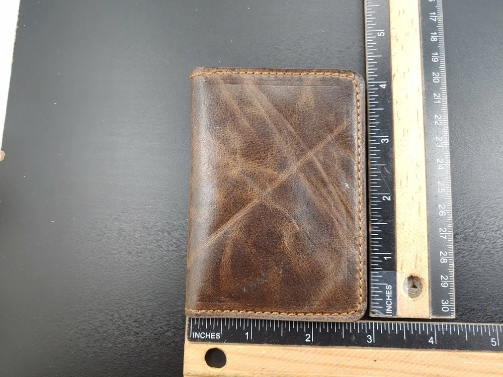 NEW REAL CAMP FIRE BROWN LEATHER Handmade MILLENNIAL Credit Card case ALWAYS overbuilt NEVER overpriced. Will hold business cards, credit cards and your ID's. Completely finished Interior with FINE camp fire BROWN leather Machine sewn will NEVER come apart Made in Ocala, Fl. U.S.A. Each case is unique and Hand made by us. 4 credit card slots Can hold up to 12 credit cards Heavy duty construction. Millennial style wallet Measures (6 x 4 1/4 inches open),(3 x 4 inches closed). Truly a work of art. Hand Made and stored in a smoke free environment. No two cases alike! One of a kind! See all the photos tells all. Credit cards are NOT included. FREE SHIPPING!