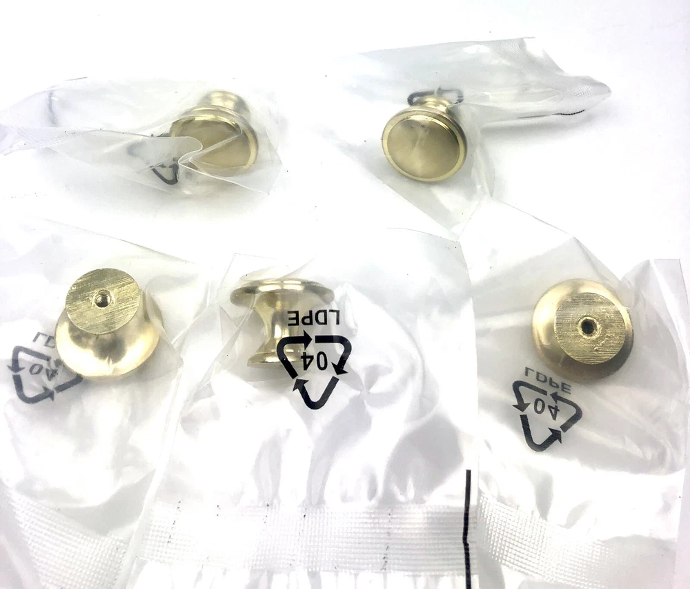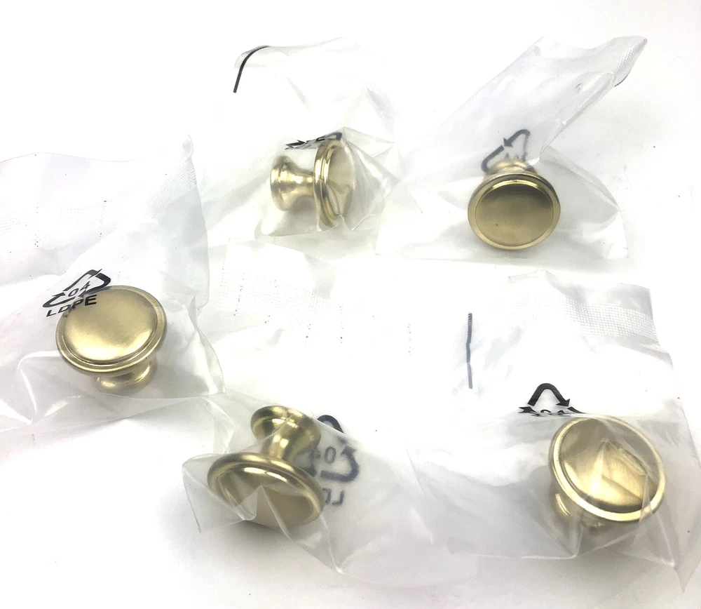 Brushed Brass Round Drawer Pulls Knobs 1” Set of 5 New. No screws