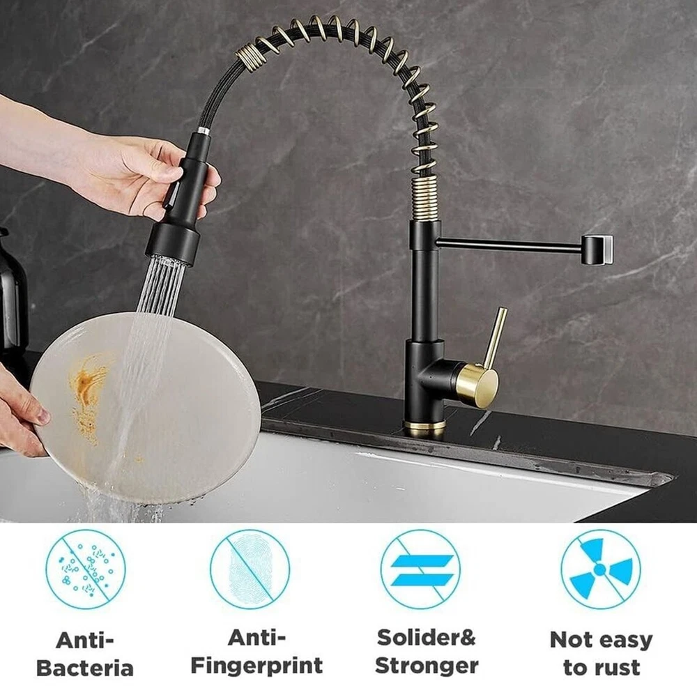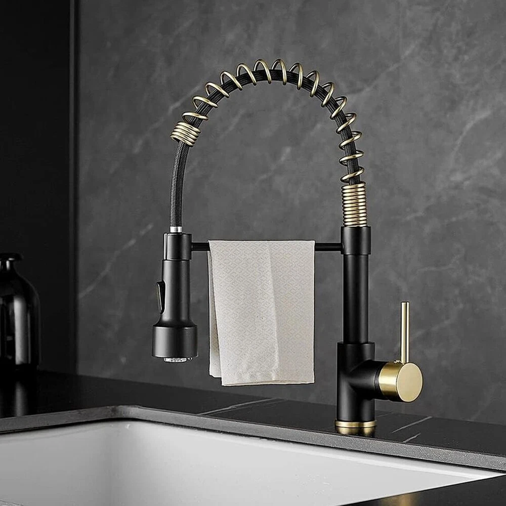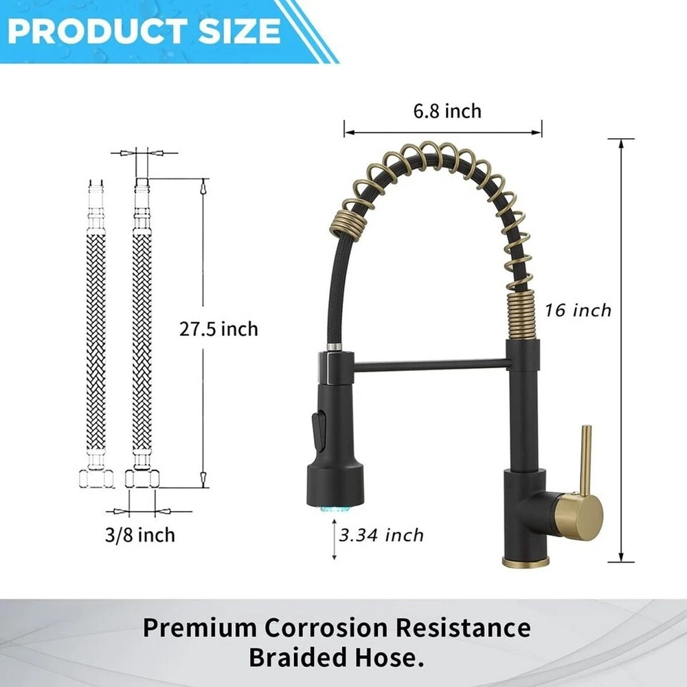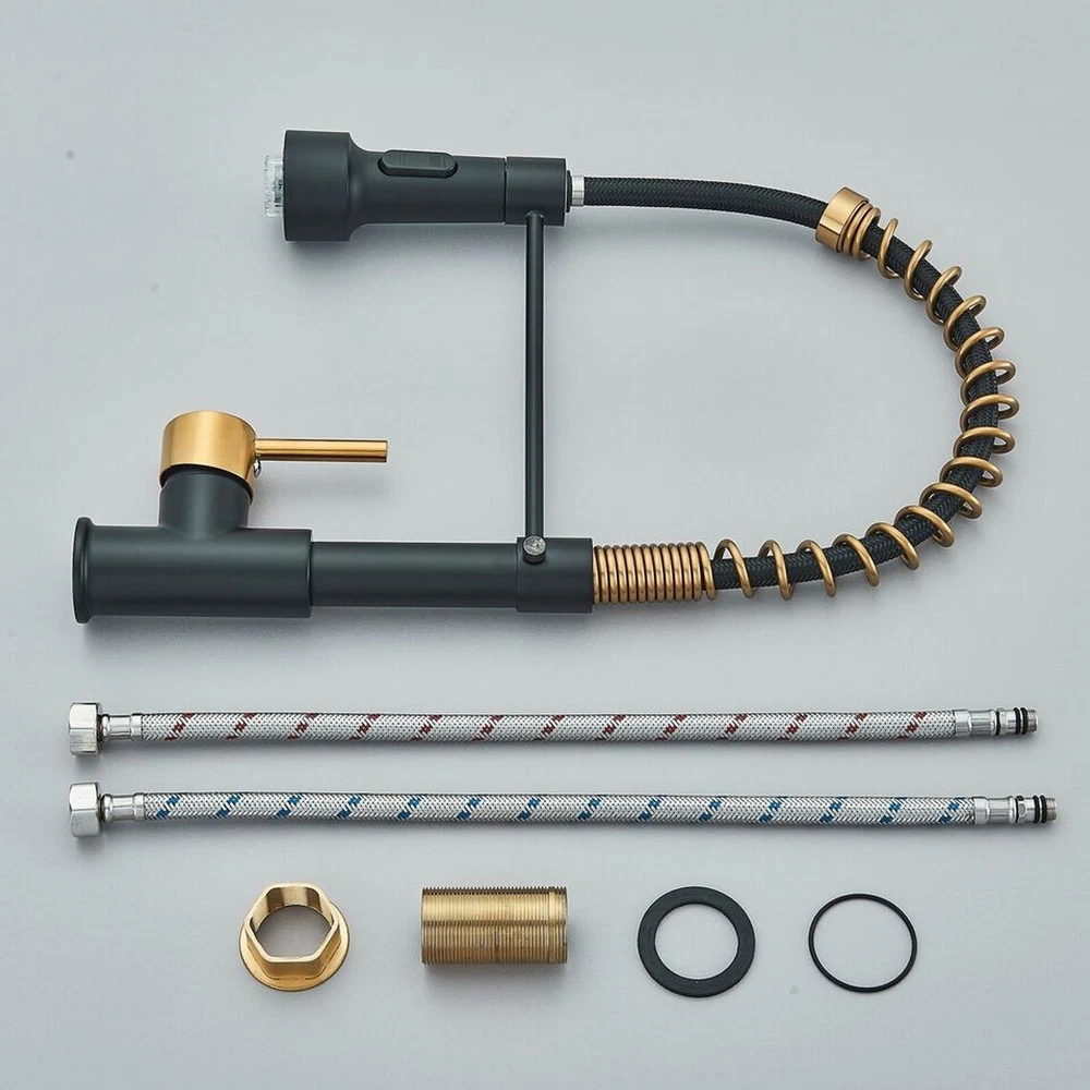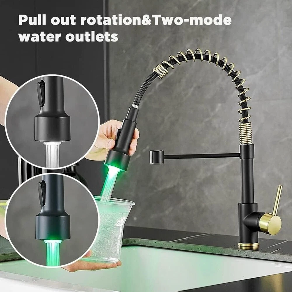 Product Description Function: Kitchen Sink Faucet Feature :Swivel Spout,pull down sprayer Finish: Brushed Gold Black Number of Handles: Single Handle Installation Holes: One Hole Valve Type: Ceramic Valve Faucet Body Material: Brass Faucet Spout Material: ABS Faucet Handle Material: Brass With 2 pipes for cold and hot water(40cm) Water Feature:Mix Hot and Cold Water Pressures:Minimum 0.5 bar, 1.0 bar recommended Water Flow: 1.8 GPM 5 Years warranty Safety first - all bathroom faucet and commercial faucets designed for drinking water use are fully compliant with the latest federal and state lead-free standards Easy to install LED works by water flow,No battery is needed. 3 LED colors will change when water temperature change ,red,blue,green Swivel Spout can make the faucet fit for double bowl kitchen sink 360 degree rotation PACKAGE CONTENT 1 × kitchen faucet 2 × supply hoses,40 cm (if you need longer supply hose,please contact us) Mounting accessories Payment Only PayPal is Accepted. Immediately payment is required after the Winning Bid or Buy it Now Shipping Usually shipment can be arranged within 1 working days after receiving payment. We usually ship by Fedex ,UPS,China Post. Usually the delivery time is 7-20 days. Remote areas will needs extra shipping cost and more time. We ship according to the address on PayPal. (After you make the payment, PayPal will send us an email automatically, informing us the payment and shipping address.) So please make sure your address on PayPal is the right one.We do not ship to PO.BOX address Mail transit time is best estimated, but not guaranteed. As transit time varies. Contact us Shipping damage has to be reported within 7 business days of which the product was delivered. If you have any questions, please be free to contact with us by eBay massage,we will answer your questions ASAP. Feedback I describe items as well as I can. If I have missed something, please let me know. Please e-mail me before leaving feedback if you are unhappy with your item, so we can work it out. International Buyers – Please Note: Import duties, taxes, and charges are not included in the item price or shipping cost.