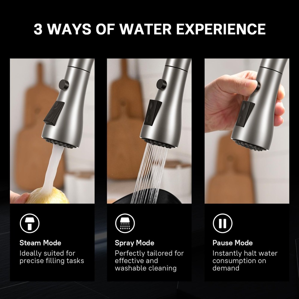 Single Handle High Arc Brushed Nickel Pull Out Kitchen Faucet,Single Level Stainless Steel Kitchen Sink Faucets with Pull Down Sprayer,Suitable for Laundry Rv Bar Sleek Design---Tulip kitchen faucet design make your kitchen room simple and fresh, easy to match most sink. Multifunctional Outlet Water Effect---3 way spray setting(STREAM,SPRAY,PAUSE),stream for filling water, spray for rinsing, pause for avoiding splashing in multitask mode.CEC listed. Flow Rate: 1.8 Gallons Per Minute. Easy to Install---Pull down hose and water Line hose altogether preinstalled in kitchen faucet to save much time under the sink,no require plumber,finish DIY installation less than 30 minutes. Easy to Operate---Single handle control water temperature and flow volume easily,high arc 360 degree swivel spout supply full range washing access, sprayer head always retract back to spout after each use. Easy to Maintenance---Superior finish prevent dirty from sticking to faucet surface, clean faucet by cloth is enough in Daily Use. Shipping We offer FREE shipping on all orders! We ship within Three business days of payment, usually sooner. We use a selection of shipping services such as UPS, FedEx, USPS etc. We only ship to the lower 48 states, no APO/FPO addresses or PO Boxes allowed. Local pickups and combined shipping options are not provided at this time. Return You can return a product for up to 30 days from the date you purchased it. Any product you return must be in the same condition you received it and in the original packaging. Please keep the receipt. Payment We accept payment by any of the following methods: PayPal Please pay as soon as possible after winning an auction, as that will allow us to post your item to you sooner! Feedback Customer satisfaction is very important to us. If you have any problem with your order, please contact us and we will do our best to make you satisfied. Contact Us If you have any queries, please contact us via ebay. We usually respond within 24 hours on weekdays. Please visit our eBay store to check out other items for sale! Thank you for shopping at our store.