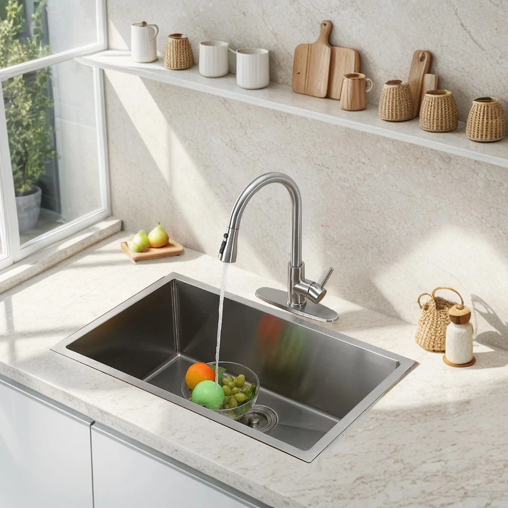 Kitchen Faucet with Pull Out Sprayer, Brushed Nickel Kitchen Faucets with Pull Down Sprayer, High Arc Single Handle Stainless Steel Sink Faucets 1 or 3 Hole, Kitchen Sink Faucets for Farmhouse Camper Laundry Rv Bar Multifunctional Sprayer: Pull out kitchen faucet with 3 setting modes: Stream, Spray, Pause. 360° rotation spray head, and a single handle for efficient sink coverage and effortless control. Reliable Quality: Commercial SUS 304 stainless steel construction forged products. It provides a superior anti-corrosion and anti-rust finish that prevents dirt such as fingerprints or water stains from adhering to the faucet surface.Flow Rate: 1.8 Gallons Per Minute, saving 20% water. Simple to Install: all mounting instruction included. The faucet is suitable for single hole or three hole sink, no plumber and special tools are required, follow the installation manual allows you to complete the DIY installation in about 20 minutes. Easy to clean: Stains of pull-down sprayer kitchen faucets can be wiped off with just one wipe, and faucets looks like new after long-term use, Elegant Faucet and reliable customer service: This sink faucet features a minimalist design suitable for any setting and comes with a three-year limited, free parts replacement. Buy with confidence and happy to contact anytime.