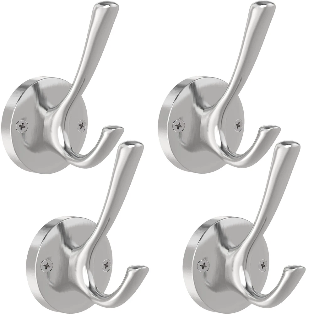 Product Information: Quantity: 4 packs Material: high quality zinc alloy Color: Brushed Nickel Hook size: base diameter 2.28inch; hook size 3.85 inchx2.56inch; Distance between the screw holes is 1.67inch. Screw length: long screw length 0.98inch; short screw length 0.63inch Max Weight: 40 lbs One Hook Weight: 4.3 oz Features: This heavy-duty coat hook design is very fashionable and textured, just like a fine item of life. Stylish and beautiful in bathrooms, bedrooms, closets, hallways, entryways. And it's very practical, strong and durable, holding up to 40 pounds when mounted to a wall, solid wood, or studs. Hanging keys, towels, coats, hats, purses, backpacks, it's all easy to do. Coat hooks bring stylish style and neat organization to your space no matter where you use it. Also great for outdoor use. You will receive: 4-pack double wall hanging hooks, equipped with 8 long screws, 8 short screws, and 1 manual. Installation steps: Step 1: Mark the 2 mounting holes. Step 2: Put the screws in the appropriate places. Step 3: You can use a screwdriver or drill to lock the screws to the wall or board. Refer to our actual guidance notes for specifics 【Great quality material and sturdy】This heavy duty Brushed Nickel wall hooks are made of high quality solid zinc alloy, have thicker hook base, hard, durable and rust-proof, strong enough to hang 40 lbs items, suitable for hanging heavy objects such as clothes, backpack,towel,flower basket,key, or jewelry . 【Easy to install】Each wall hook need 2 screws and is provided with 4 mounting screws to meet different installation needs, long screws 0.98inch x2 (plastic anchor included), short screws 0.63inch x2, can be mounted directly on a wall, closet, garage or wood panel 【Fashionable and protective clothing】 The appearance is fashionable and exquisite , and feel very smooth and comfortable when you touch it. The smooth curved edge can effectively protect your hands and clothes from being scratched. 【The application is very wide】It is designed as double hooks, both top hook and bottom hooks can hang clothes. Can be used in the room, bathroom, living room, bedroom, office, and perfect for hanging towels, robes, jackets, wallets, key,backpacks and other items to keep your room neat and beautiful. Suitable for outdoor use. 【Product details】 The package contains 4 double hooks wall mounted, with 8 long screws and 8 short screws, and 1 manual. Base diameter: 2.28". Hook size is 3.85" X 2.56", The distance between the screw holes is 1.67inch.