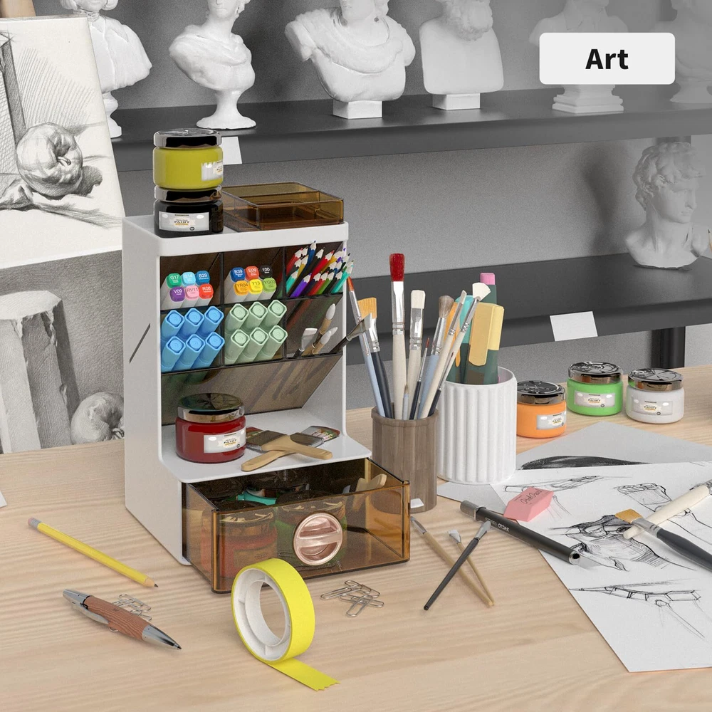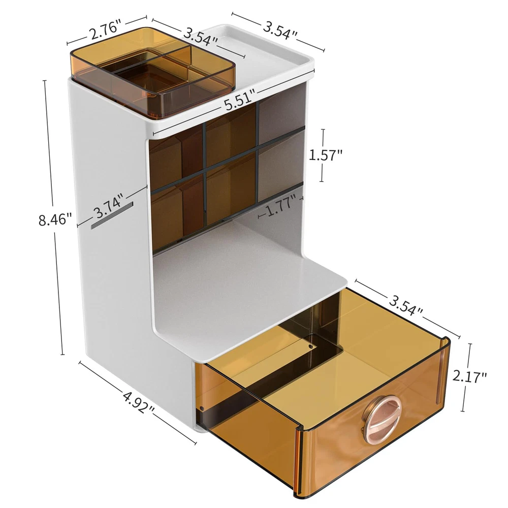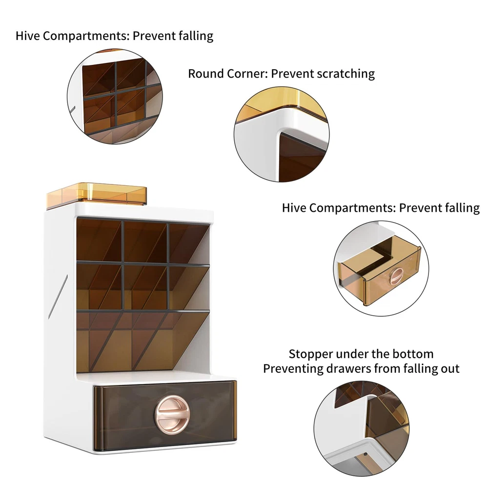 ✏ 【Unique Design】The desk organizer contains 6 hive compartments and 1 drawer, and there's a small tray on the top. The size of each hive compartment is D3.74" x W1.77" x H1.57", and the drawer is D4.72" x H2.17" x W5.12". The hive design makes the organizer more steady, you don't worry about other supplies falling out when you take one out of it. ✏ 【Make Your Desk Tidy】Are you still struggling with how to organize your cluttered table? Why not try this desk organizer? Just a small caddy can organize most of your supplies, such as pens, clips, scissors, erasers, tapes, charging cable, and so on. Keep your desktop free from mess! Keep yourself working in a tidy environment everyday! ✏ 【Great Material】The desktop organizer is made of premium plastic with a sturdy structure and no odor. It can organize your desktop without impacting your work environment. Each corner of the organizer features a rounded design, the drawer and the hive compartments have a polished finish. These will protect your fingers from scratching when you take accessroies from it. The bottom of the drawer is designed to prevent the drawer from falling off, so that the drawer can be pulled out smoothly without slipping. ✏ 【Nice Gift for Your Family and Friends】Are you still getting clothes, jewelry, cosmetics as gift? Whether it's a birthday, Mother's Day, Thanksgiving Day, or any other holidays, this desk organizer is a nice choice for a gift! It will give your husband a neat wrok desk, your wife a neat vanity table, and your sons and daughters a neat study table! ✏ 【Commitments to Customers】Please email us immediately if you have any questions with our products, whether before or after the purchase. We will solve your problem within 24 hours.