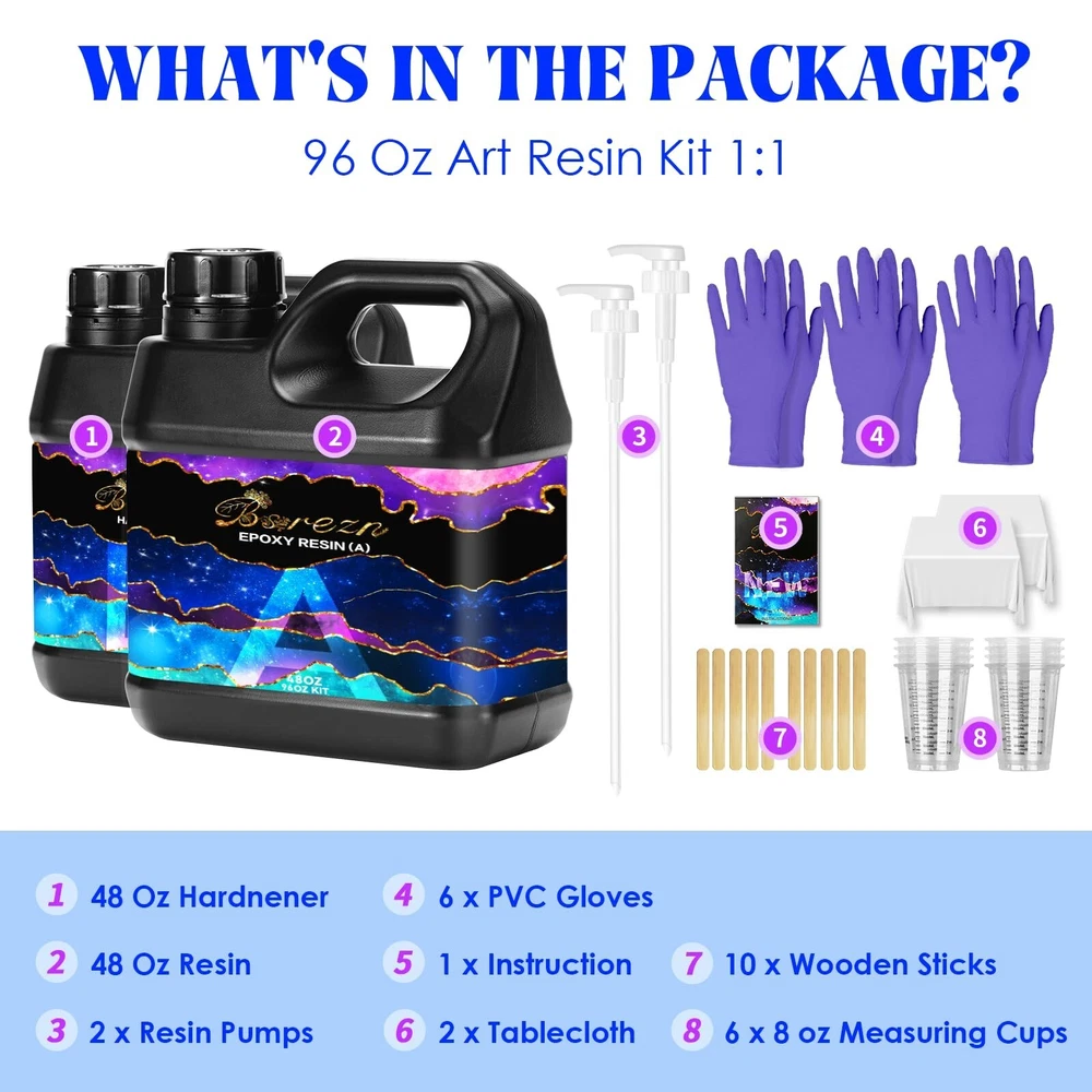Bsrezn Epoxy Resin Kit - 96 oz with Pumps, 1:1 Mix Ratio, Crystal Clear, Bubble-Free, High Gloss Finish for Coating, Casting, Art, Jewelry, and DIY Projects (48 oz x 2) Product Details Size: 96 Oz Kit Brand: Bsrezn MPN: BS-AB96K-X UPC: Does not apply EAN: Does not apply Brand: Bsrezn Unit Count: 96.0 Fluid Ounces Manufacturer: Bsrezn Package Dimensions : 9.21 x 8.7 x 5.67 inches; 7.36 Pounds Date First Available : November 27, 2024 Manufacturer : Bsrezn Best Sellers Rank: #24,747 in Arts, Crafts & Sewing (See Top 100 in Arts, Crafts & Sewing) #257 in Sculpture Molding & Casting Products #257 in Sculpture Molding & Casting Products Customer Reviews: 4.5 4.5 out of 5 stars 728 ratings Crystal Clear: Being clear and Resistant to Yellowing of the epoxy resin and hardener can make your art works like tabletop more attractive and more likeable. Friendly Smell: You can create freely in a Low-Odor environment with 2 Part Resin, which greatly reduces the discomfort caused by unpleasant smell. Upgraded Formula: Bsrezn 2 part epoxy resin kit use high-grade raw materials and is formulated with an exclusive formula, which can significantly reduce the bubbles of epoxy resin. Creative Application: With Less Bubbles and Self Leveling, it is perfect for home decor,bar top, table top,floor,countertop,floor, making jewelry,ashtrays,etc. Most importantly, you can send these ideas to your lover. Exclusive Service within 24 Hours: Your satisfying shopping experience is our starting point. You enjoy our most professional customer service. Welcome to consult! Welcome to click 'Add to Cart' to experience premium products and services.