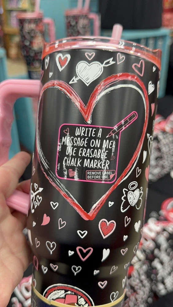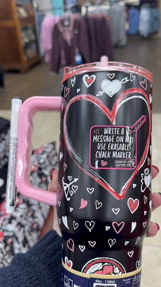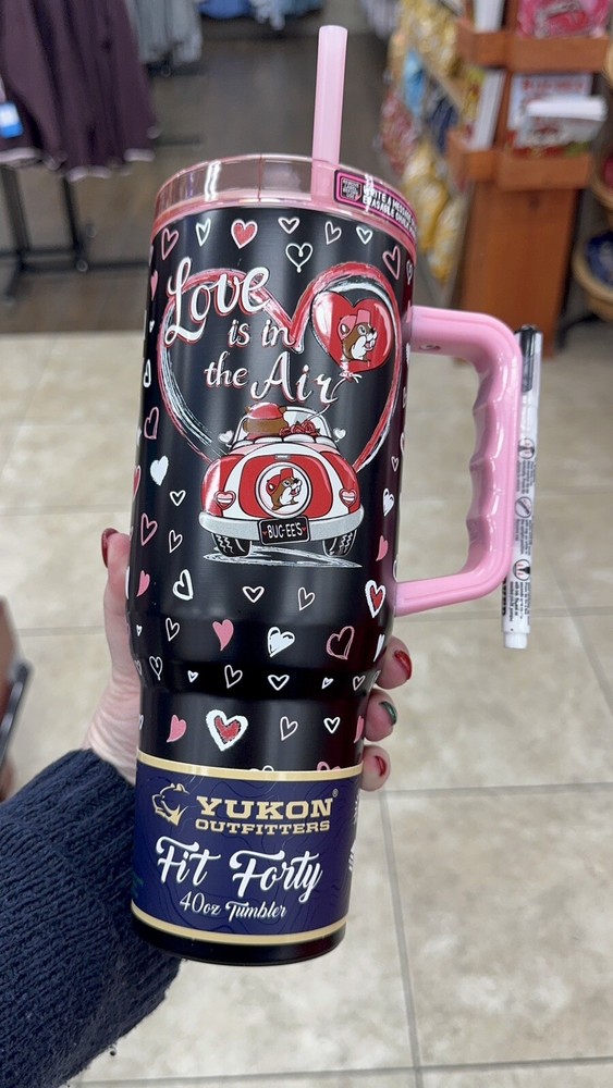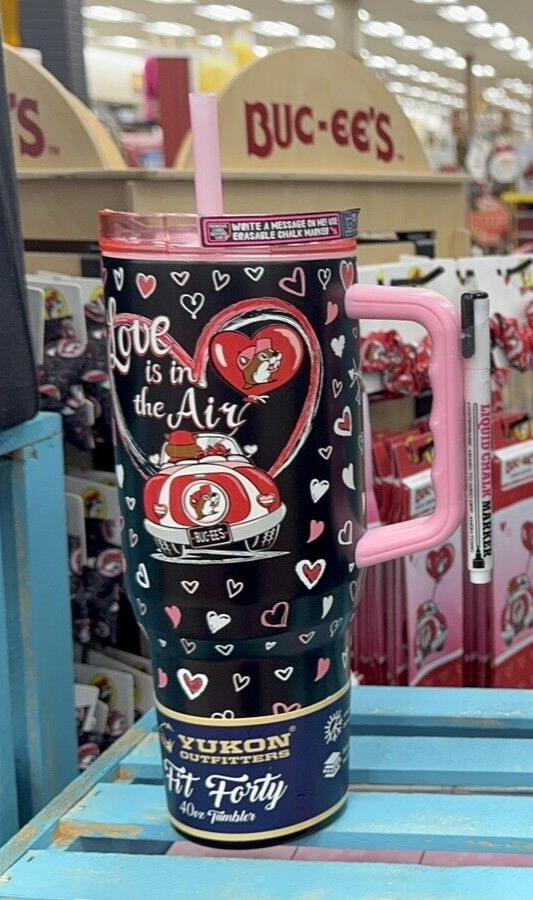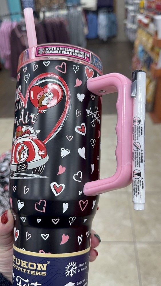Get ready to fall in love with the BUCEE'S VALENTINE'S DAY 2025 Tumbler that includes an ERASABLE CHALK MARKER so you can write a message to personalize for yourself or the one you love! This is the best gift for a Buc-ee lover! It is fun and functional 40 oz stainless steel tumbler that keeps your beverages hot or cold. The vibrant, multicolor design features the beloved Buc-ee character with "LOVE IS IN THE AIR" messaging. The tumbler comes with BPA-Free Plastic construction, ensuring durability and safety. Yukon Outfitters has included a convenient cup lid, straw, and an erasable chalk marker for easy use and customization. This tumbler is perfect for everyone, from kids to adults, and is easy to care for with simple hand wash instructions. Enjoy your favorite drinks with this Valentine's Day themed Buc-ee tumbler.