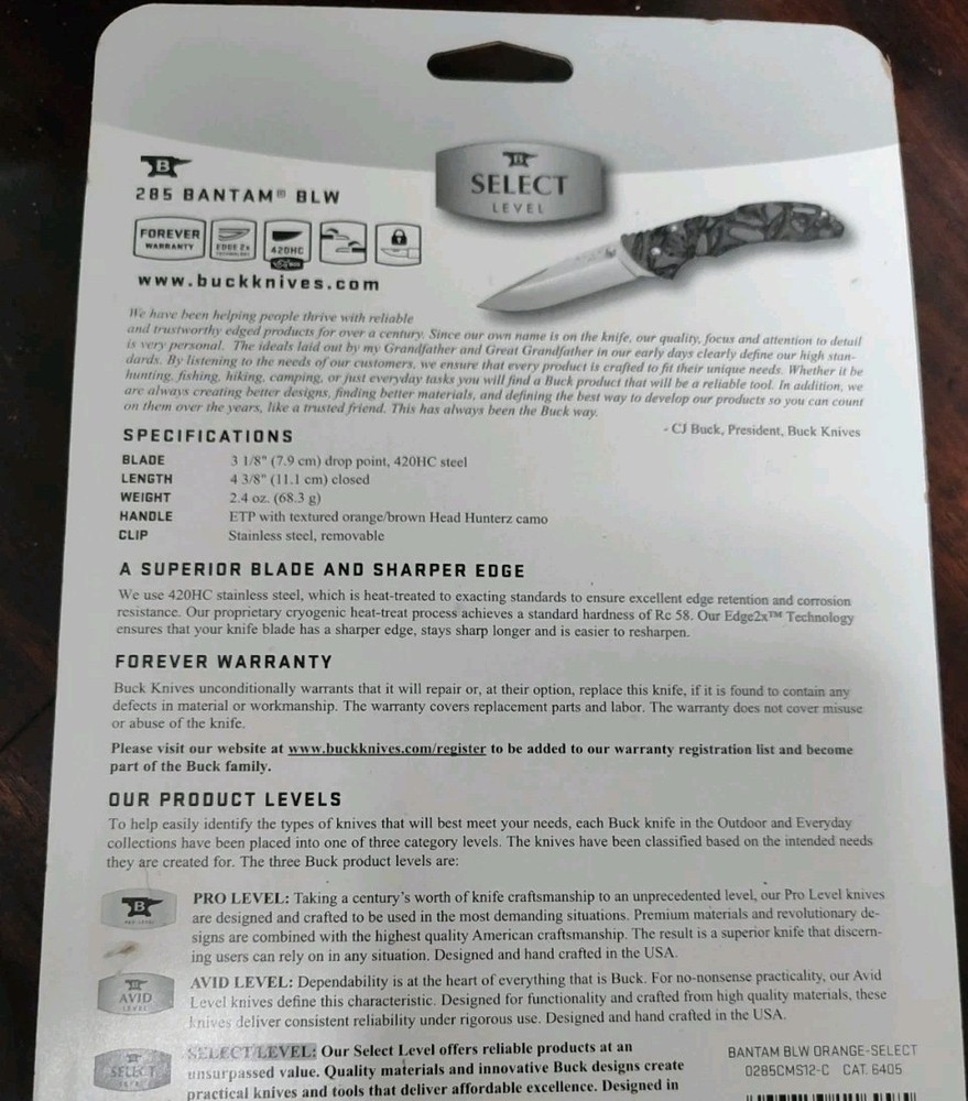 The Buck 285 Bantam Orange Select Knife is a modern folding pocketknife featuring a stainless steel drop point blade with a plain edge. This knife has an ambidextrous lockback mechanism for secure locking when in use. The orange fiberglass handle adds a pop of color and durability to the design, making it a standout in the Bantam product line. With a blade range of 2.76 to 4 inches, this Buck 285 Bantam is a reliable and original choice for everyday carry or collectible purposes.