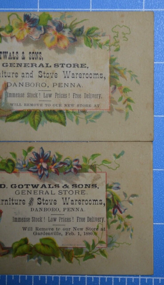 Description: Bucks County Danboro PA D. Gotwals & Sons, General Store Trade Cards. This lot includes two cards, as pictured. Undated, but old. Questions and offers welcome. Please review entire listing (including condition, title, pictures, description, and terms) before committing to purchase this listing. Before agreeing to purchase this listing, make your own determination on condition of the item(s) being offered in this listing. Pictures are part of the description and are provided to help illustrate condition. Since descriptions and opinions of condition can vary, seller provides prospective buyers with the ability to request more information and additional pictures before the close of this listing. When in doubt, please contact Taggart Neveling Books Ephemera, LLC "the seller" through eBay before you bid or agree to purchase this listing. This helps ensure a smooth transaction, one where Taggart Neveling Books Ephemera, LLC gets a sale and the buyer gets the item(s) they want to purchase. Condition & Disclosure of All Faults: All items appearing in this listing are pre-owned and are sold "AS-IS" and "WITH ALL FAULTS." No warranties, express or implied, are made in connection with this listing. Additionally, all other warranties not specifically listed above, are also disclaimed. Since the seller, Taggart Neveling Books Ephemera, LLC, does not provide any warranties with this listing, to the fullest extent allowed by law no sale shall be deemed invalid. A written description and uploaded pictures are offered to help provide a general idea of condition. Pictures are part of the description, but may not show every defect or flaw of an item or collection of items. The written description offered in this listing may not state every single defect or flaw in condition associated with item or items offered in this listing. However, Taggart Neveling Books Ephemera, LLC "the seller" offers potential buyers the ability to submit questions before agreeing to purchase this listing. Buyer agrees that a failure to exercise this option is not sufficient cause to initiate a return. Since Taggart Neveling Books Ephemera, LLC offers potential buyers the ability to submit questions before agreeing to purchase this listing, by bidding or agreeing to purchase this listing, buyer agrees seller has provided sufficient legal disclosure of all defects and faults, even if such defects and faults are not specifically identified in the written description or shown in the uploaded images. All statements and descriptions about age, authenticity, condition, fitness for a particular purpose, or origin of items offered in this listing, as well as those made in response to questions about this listing, reflect the opinion of the seller and are NOT offered as statements of fact. By bidding or agreeing to purchase this listing, the buyer agrees that to the fullest extent allowed by applicable law, Taggart Neveling Books Ephemera, LLC "the seller" will not be liable for any defect, error, or omission in this listing. By bidding or agreeing to purchase this listing buyer agrees to have performed all due diligence beforehand. By bidding or agreeing to purchase this listing buyer agrees all items offered in this listing may require cleaning, conservation, or repair. By bidding or agreeing to purchase this listing, buyer agrees ALL SALES ARE FINAL. NO REFUNDS. NO PARTIAL REFUNDS. NO RETURNS. NO EXCHANGES. Digital Photos and on Screen Viewing: Cameras and computers sometimes display colors differently. Colors, when viewed on a computer screen, can be lighter or darker than the actual item(s) that is being photographed. Please keep this in mind when you place your bid. Please also note: No display props or materials (tape measures, stands, or other items that may be used to help display a listing) are included. Taggart Neveling Books Ephemera, LLC welcomes questions, but asks all potential buyers to submit questions at least one day before the close of this listing. This helps ensure there will be enough time to respond to questions before the close of the listing. Payment Policy: Payment is due within two days of the close of a listing. If a listing remains unpaid for three or more days the issue will be reported to eBay. Failure to pay for an item in a timely fashion may result in a buyer being blocked from both current and future listings offered under this user ID. Sales Tax, Use Tax, Other Taxes: Since tax laws vary by state, you may be responsible for remitting sales or use tax to the appropriate state agency. The bidder, by bidding, agrees that if any sales or use tax (or any other tax) is due on the item(s) purchased, it is to be paid and remitted to the appropriate agency by the buyer and not the seller. Please note that eBay has largely automated this process. However, if there is any error in eBay's collection or the calculation of tax due, the buyer agrees, to the fullest extent allowed by law, to pay the correct amount to the appropriate agency and to not hold the seller responsible for covering any additional amount of tax due. Shipping Policy: Shipping Cost for this listing (Within Continental US): Item will ship for $4.95, with tracking, to continental US. Please note: No in-person pickups or deliveries are offered with this listing. Delivery for this listing will only be made via USPS mail. In listings without free shipping offered, total shipping cost includes all aspects of shipping, such as packing materials, time to pack the listing(s), time and expense incurred to get the listing(s) to the post office, and lastly postage. Postage is just one aspect of shipping cost. Please keep this in mind if you happen to see an instance where the shipping cost charged was higher than the postage cost. Time to Ship: All orders will ship within five business days. This means your order will ship, once it is paid for, within five business days. Additionally, orders will be tracked and tracking information will be uploa