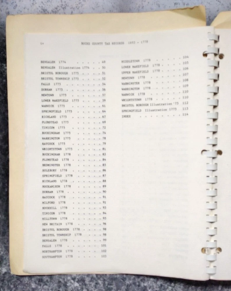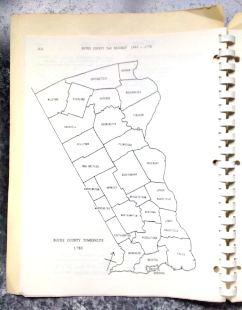 Bucks County Tax Records 1693 - 1778 compiled by Terry McNealy and Frances Wise Waite published by the Bucks County Genealogical Society 2nd printing 1983. 163 page 9 1/2 by 12 inch spiral softcover. lots of genealogical information