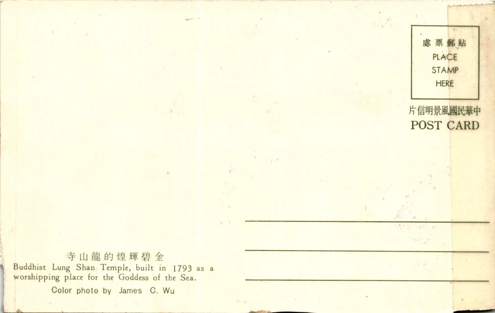 MAKE AN OFFER. THE MORE YOU BUY THE BETTER DEAL I WILL ACCEPT The postcard features a color photo of the Lung Shan Temple, a Buddhist temple built in 1793 in honor of the Goddess of the Sea. The temple is located in Taiwan and is a significant religious and cultural site in the country.