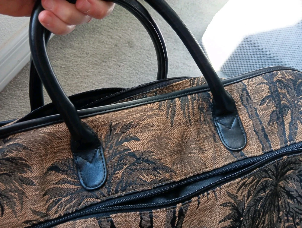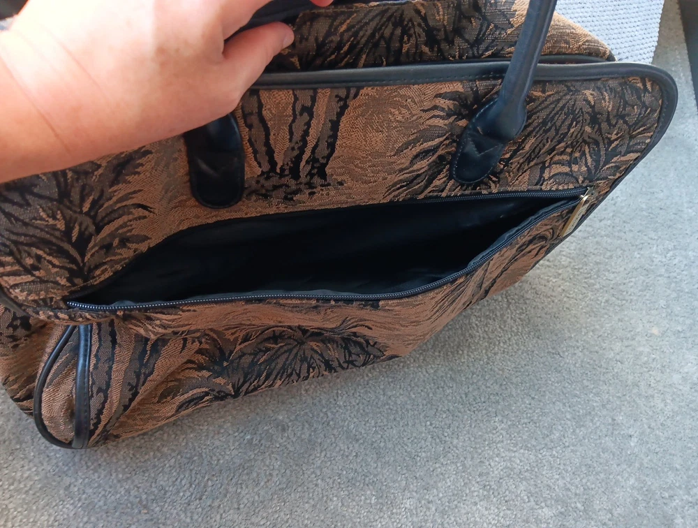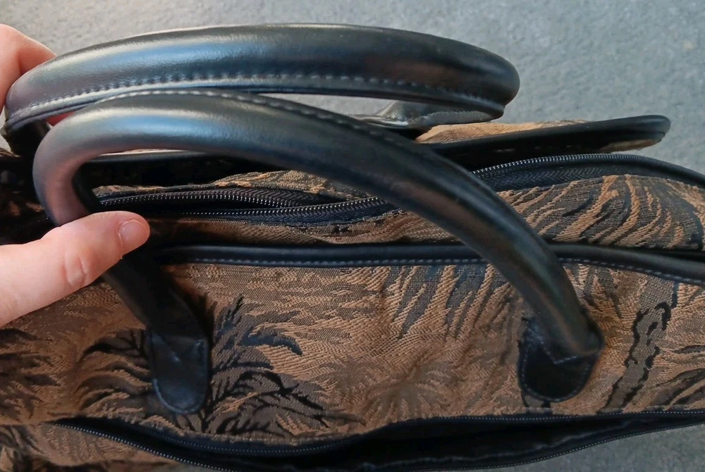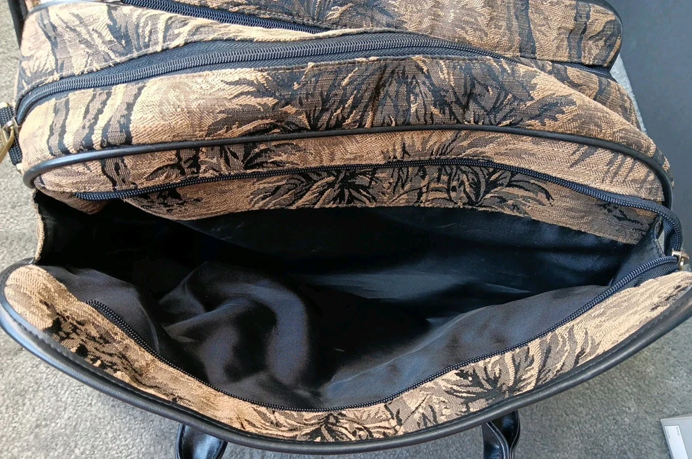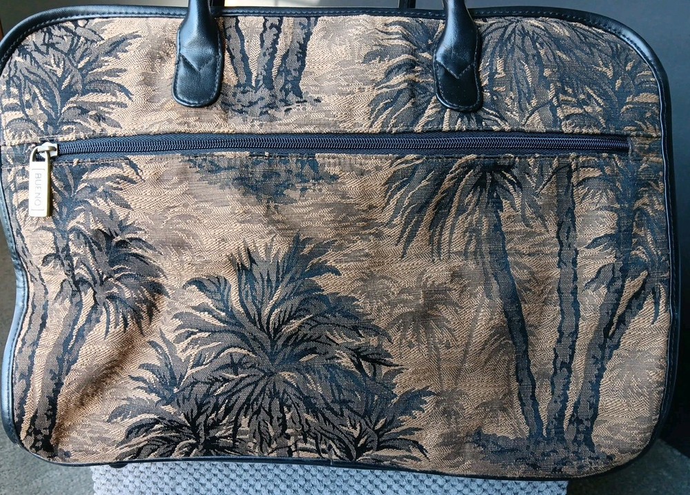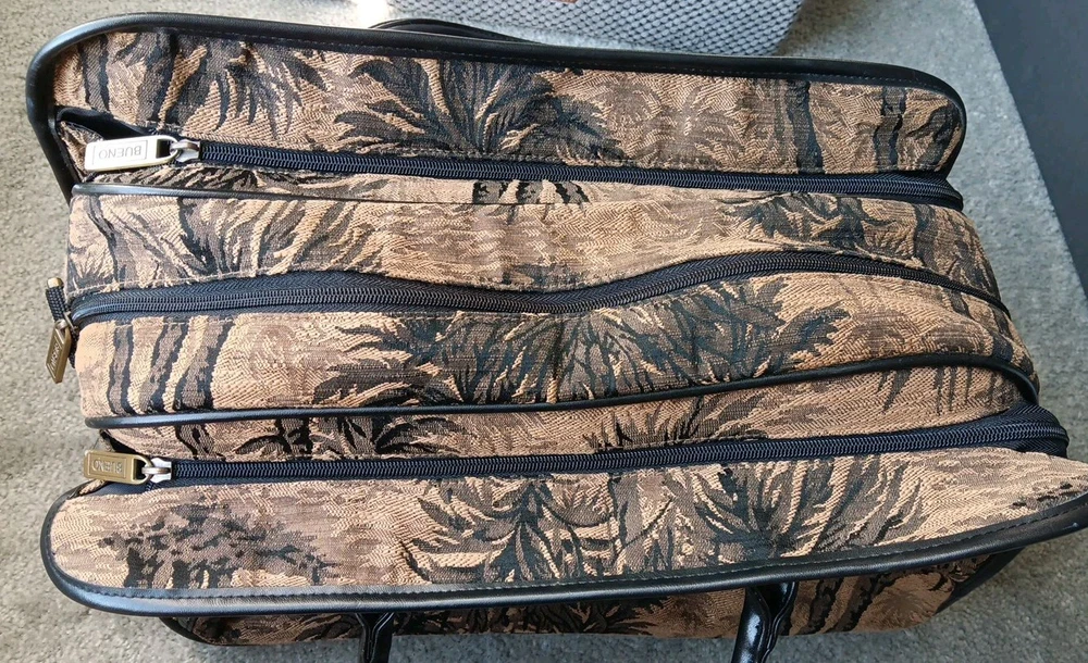 Nice size pre-owned overnight, carry-on, weekend bag by Bueno. It has many compartments and pockets. It's a bronze tone of brown with black trim and tropical/palm tree pattern. Good condition handles. It is missing the shoulder strap. There's is minor wear to the bottom. Please see photos. Please message me for additional photos or information.