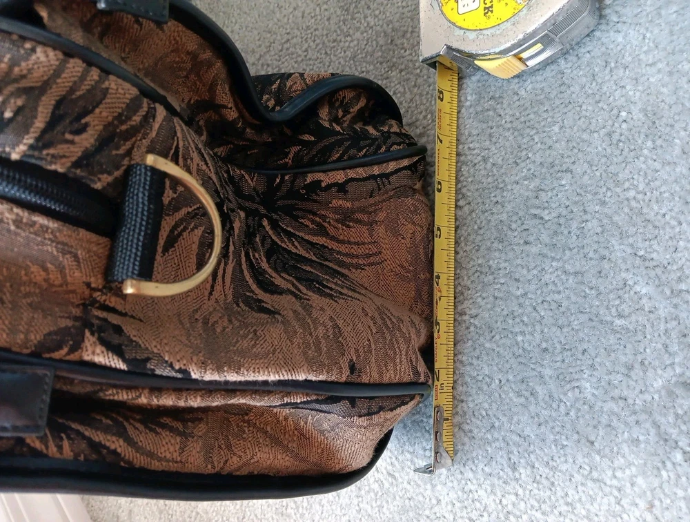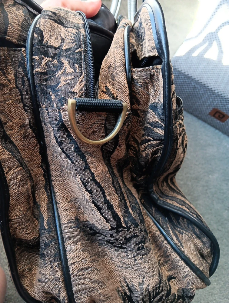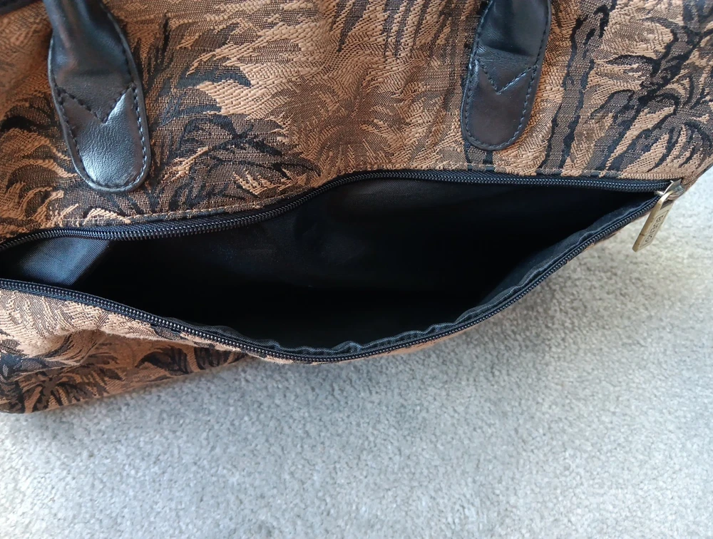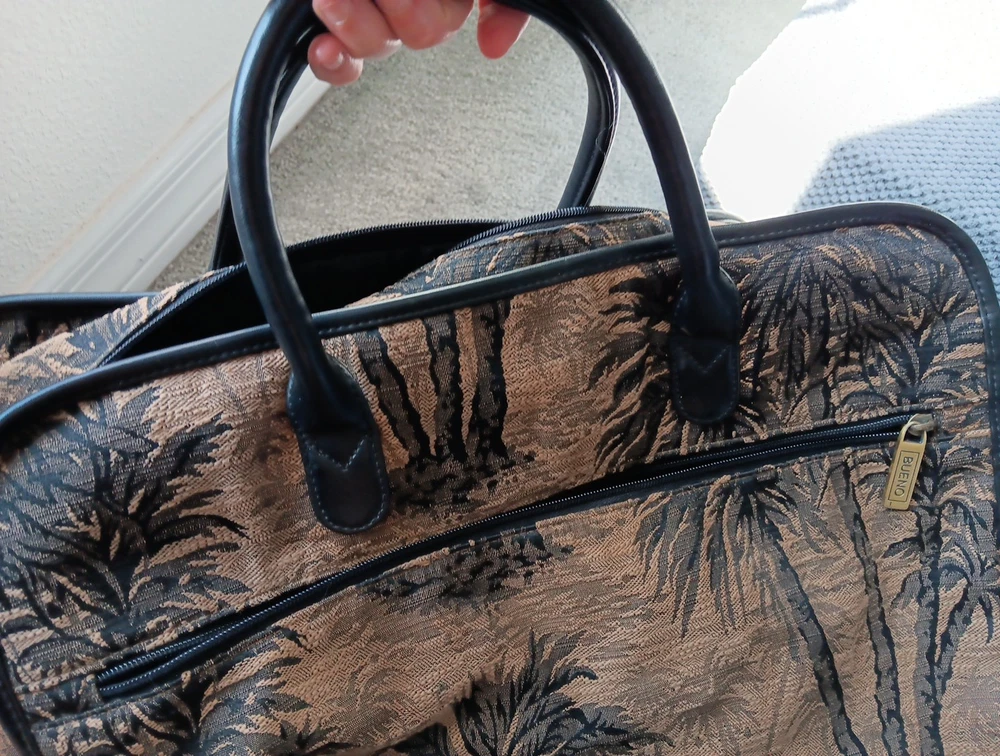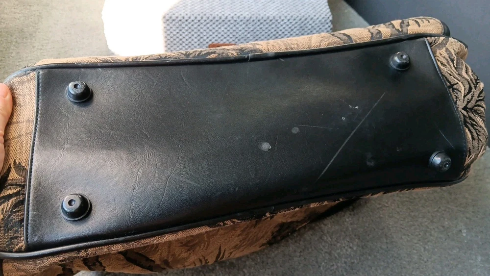 Nice size pre-owned overnight, carry-on, weekend bag by Bueno. It has many compartments and pockets. It's a bronze tone of brown with black trim and tropical/palm tree pattern. Good condition handles. It is missing the shoulder strap. There's is minor wear to the bottom. Please see photos. Please message me for additional photos or information.
