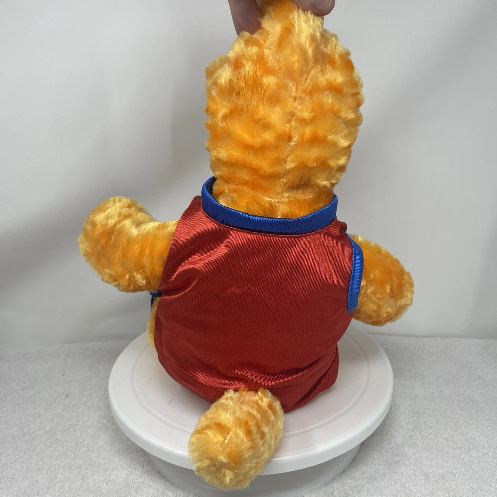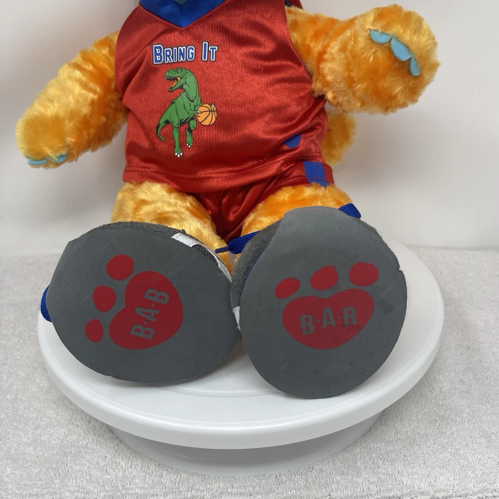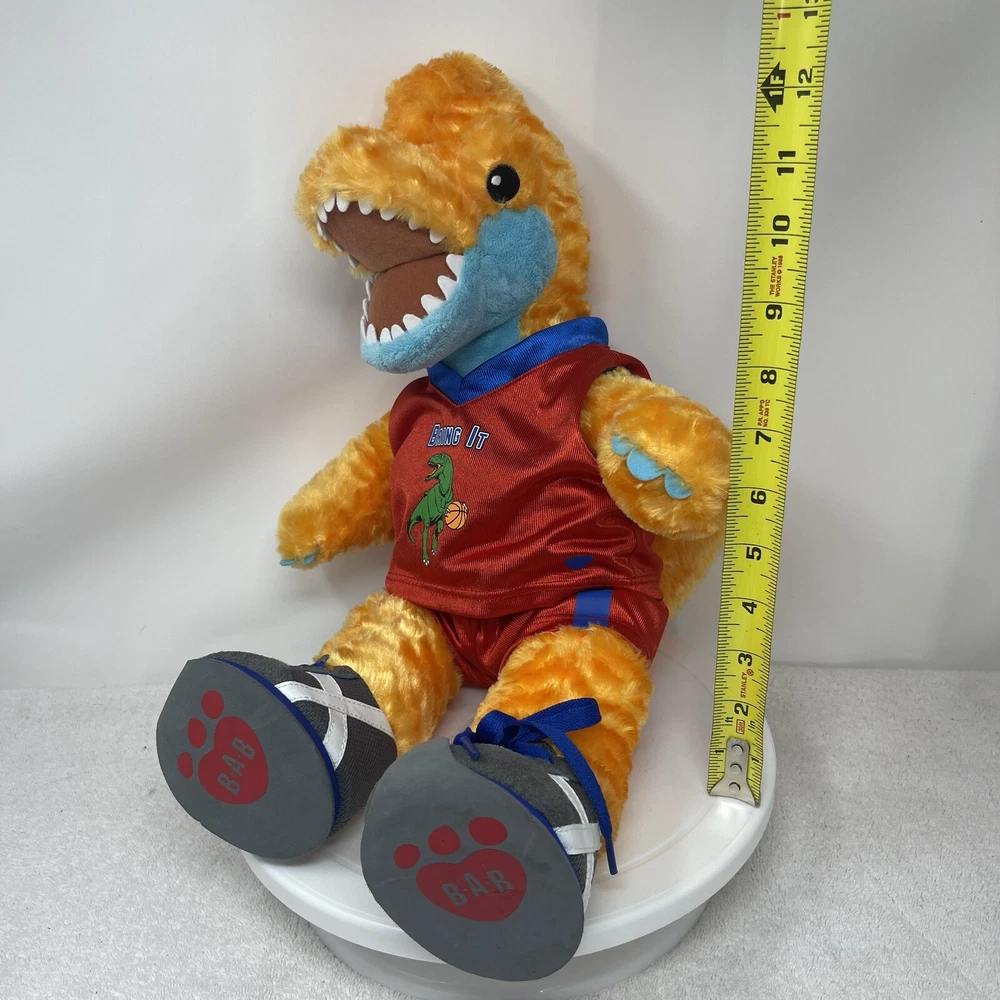 This Build-A-Bear Workshop plush toy is a limited edition Brachiosaurus dinosaur character dressed in a basketball-themed outfit. The 18-inch orange plush bear features a blue shirt, shorts, shoes, and jersey, making it an adorable and unique addition to any plush toy collection. With machine washable material and a retired status, this 2019 release is perfect for dinosaur enthusiasts or fans of Build-A-Bear Workshop's special editions. FULLY CLOTHED RARE