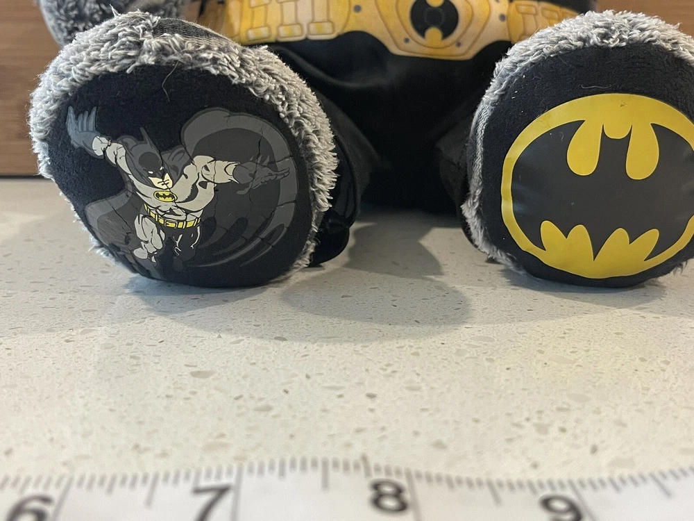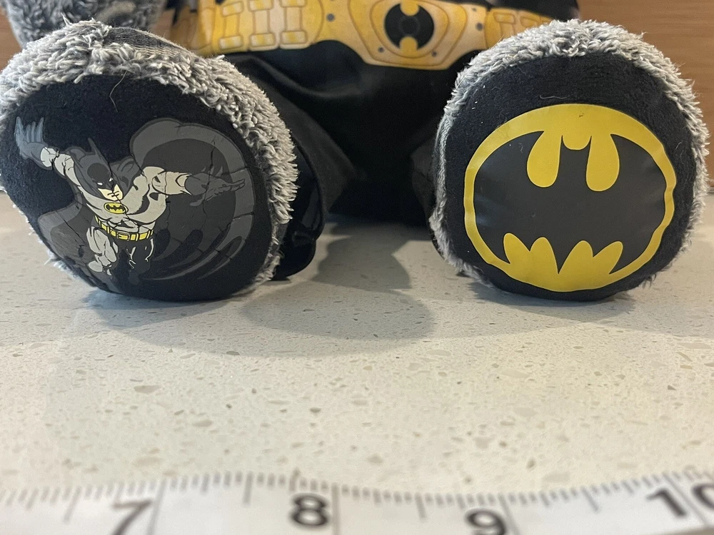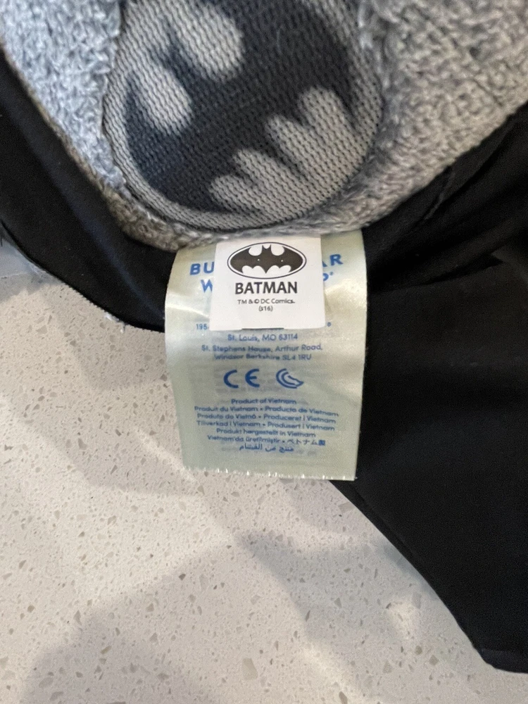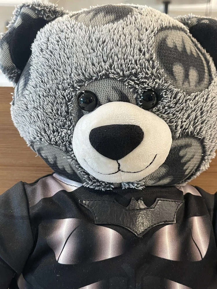 This Build-A-Bear Workshop plush bear is the perfect addition to any superhero fan's collection. With a gray color and 17" size, this retired 2016 Batman Teddy Bear Stuffed Plush is a must-have for any occasion. The bear comes without packaging and is sold as a single unit. Featuring black eyes and a DC Comics collection, this plush bear is made of high-quality materials and weighs 13 oz. It is suitable for ages 3+ and is perfect for any antique or vintage collector. This bear is not personalized and is not signed, but it is still a great addition to any collection. This comes with the bear and the Batman suit. From a smoke-free home.