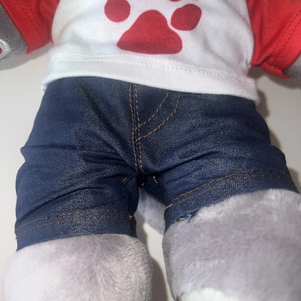 This is a 12" Build-A-Bear Workshop plush bear named Wiley the Wolf from the Great Wolf Lodge franchise. The bear has green eyes and comes with a shirt and pants. It is not antique or vintage, and is suitable for children aged 3-4 years. This non-signed bear is gray in color and is not personalized. It is an original creation, not a licensed reproduction, and is made of plush material. The bear is from China and does not come with packaging.