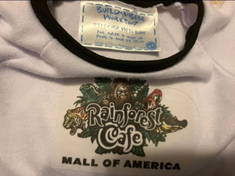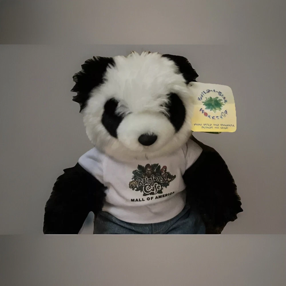 The product is a Build-A-Bear Workshop plush black and white panda bear with Rain Forest clothing from the Minneapolis Mall included. Suitable for kids aged 5-7 years. It is part of the Family & Friends theme. The bear is made of cloth material and is part of the Build-a-Bear franchise. The item is preowned but still has tags attached.