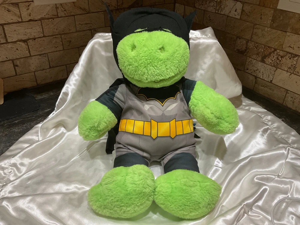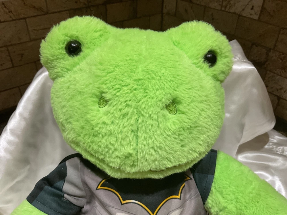 Embrace the whimsy of spring with the Build-A-Bear Workshop's charming 16-inch plush frog, clad in an adorable Batman outfit. This delightful stuffed animal features a vibrant spring green color, complemented by sleek black eyes, capturing the essence of the much-loved character. Crafted from soft, plush material, this frog is a perfect companion for all occasions. It comes complete with clothing, including the Batman costume, and is part of the current 2020-now collection. Whether for play or display, this original, non-antique Build-A-Bear creature is a unique treasure for collectors and fans alike.