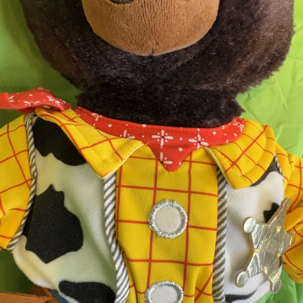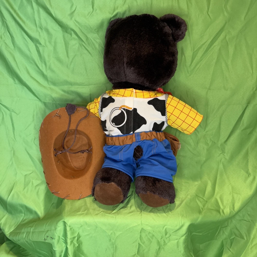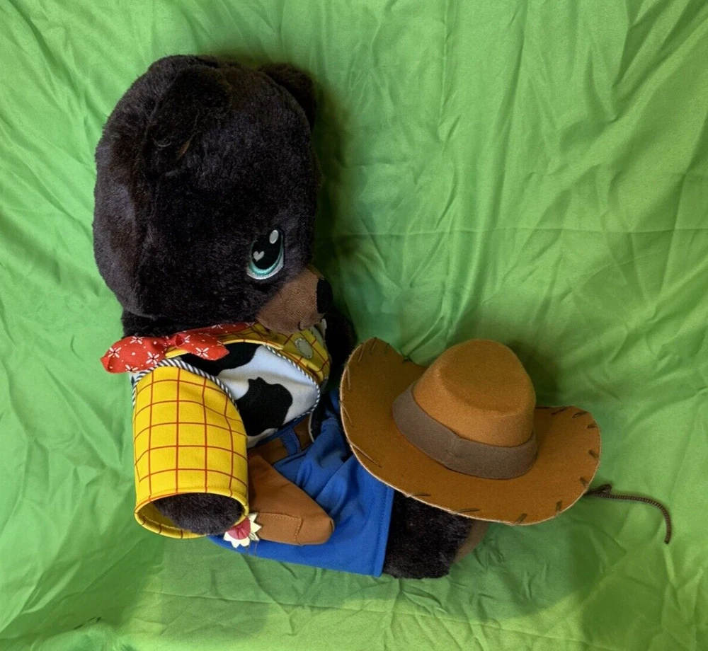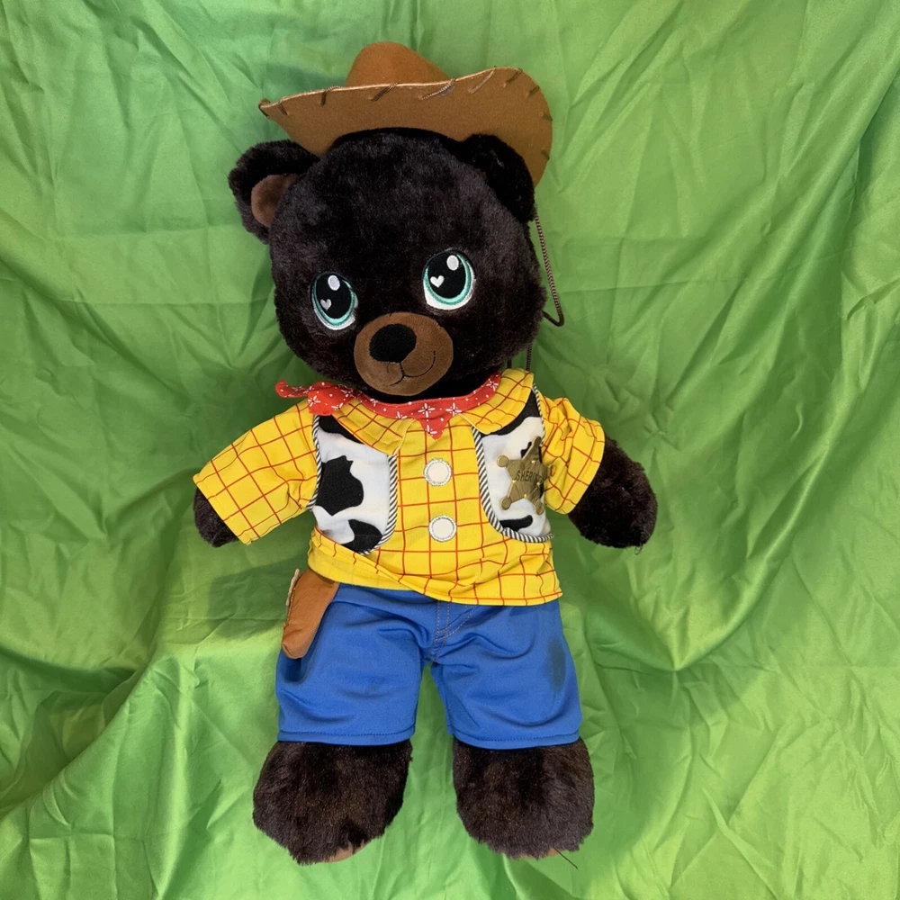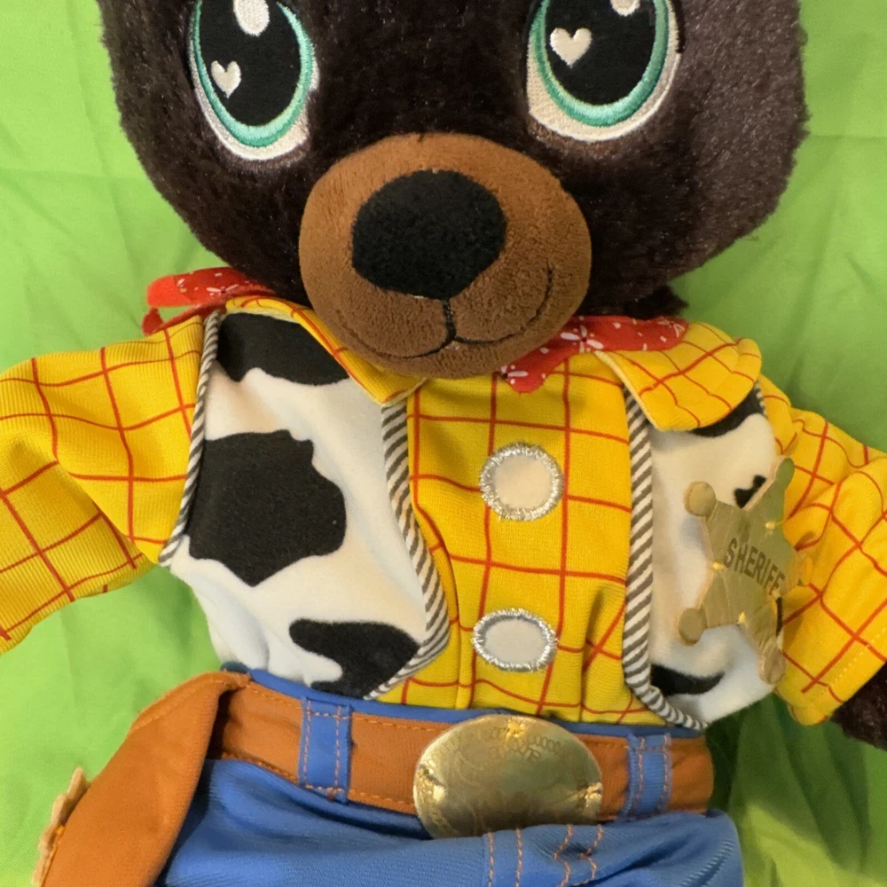 This is a 16-inch Build-A-Bear Workshop plush toy featuring Sheriff Woody from the Disney Pixar Toy Story franchise. The bear is brown and includes clothing and accessories such as a shirt, pants, hat. The set also includes a custom bundle of items and is recommended for children ages 3 and up. The plush toy was manufactured in 2016 and is an original licensed reproduction.