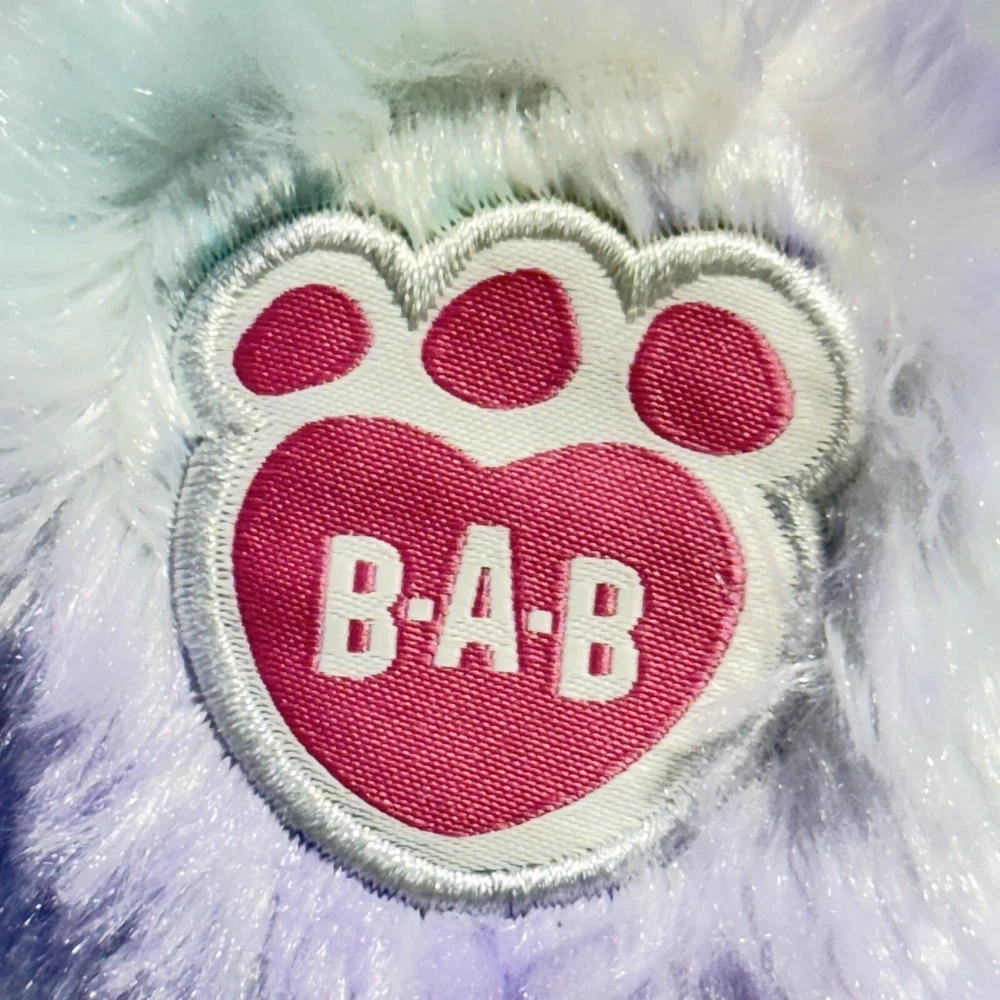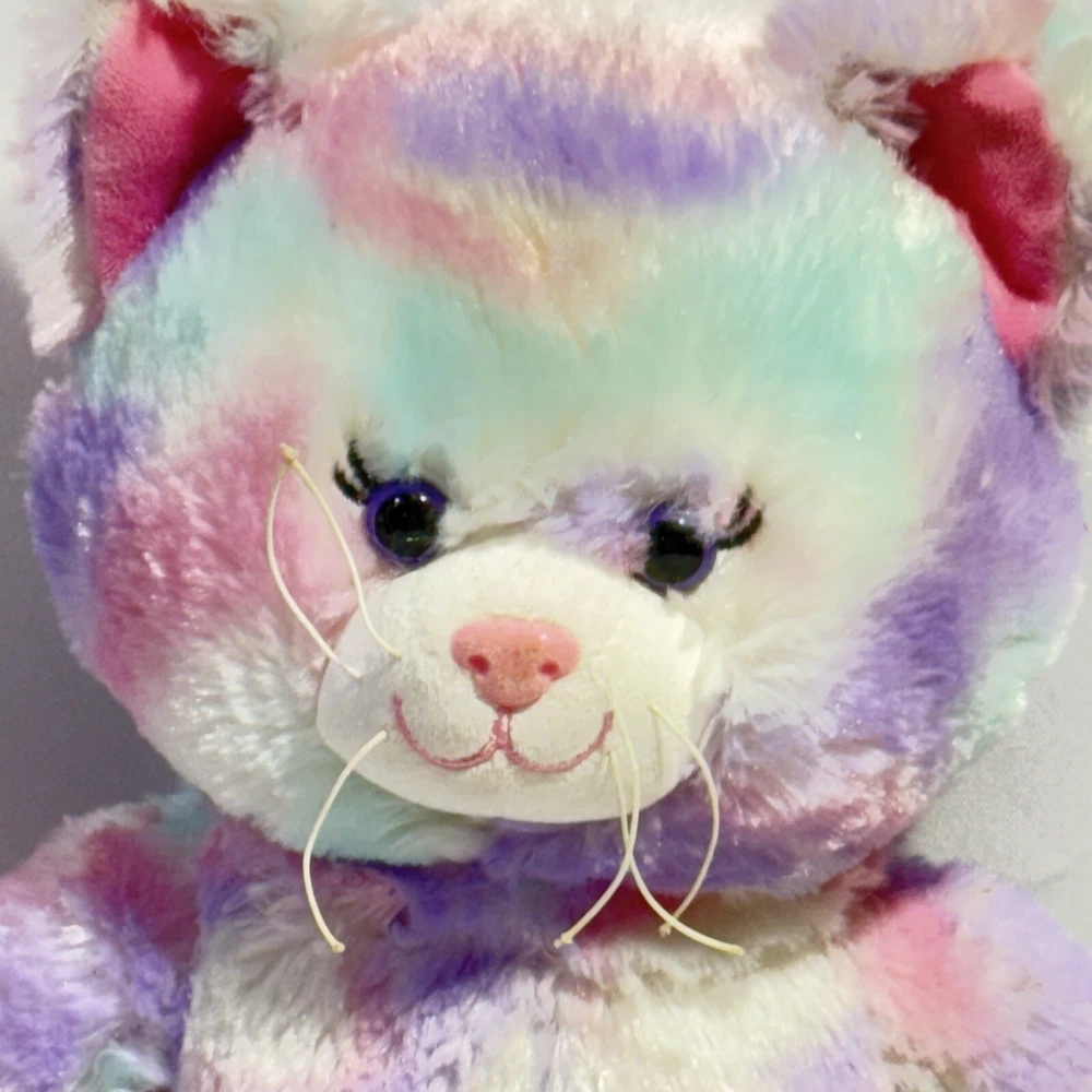 This is a 17-inch Build-A-Bear Workshop stuffed animal cat with pastel tie-dye pink and purple swirl plush. It has purple eyes and is retired from the Rainbow collection. The cat is made of plush material and is an original, licensed reproduction from Build-A-Bear. It is without packaging and was manufactured in 2017 in the United States.