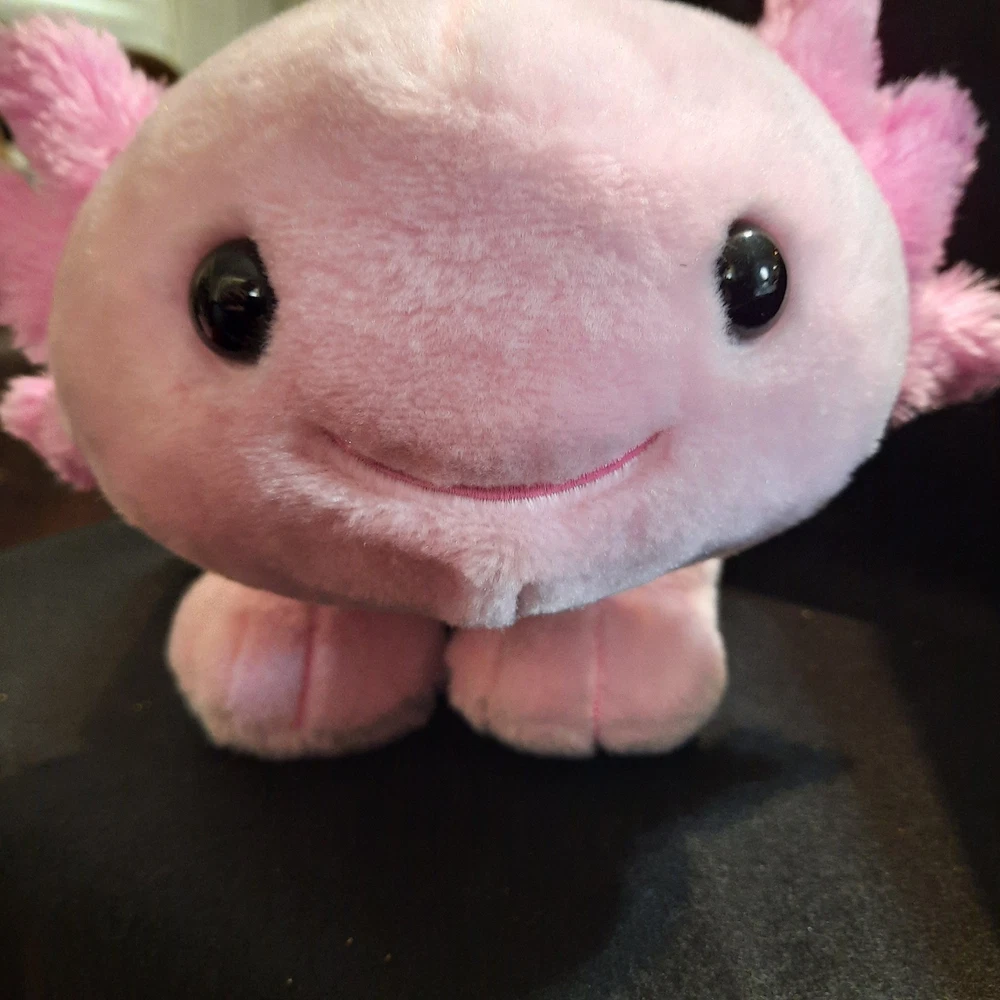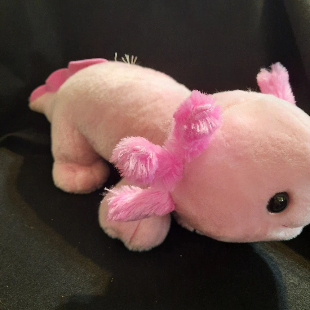This Build-A-Bear stuffed animal is a limited edition bubblegum pink axolotl plush. It is 16 inches in size and weighs 1 pound. The plush is made of high-quality materials and features black eyes. It is an original item and is part of the Build-A-Bear franchise. This unit is sold as a single unit without packaging and is manufactured in 2021.
