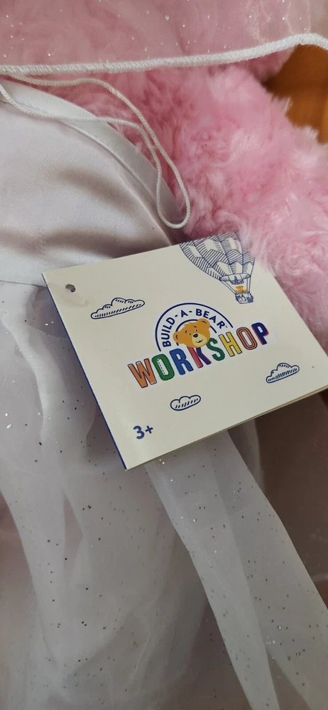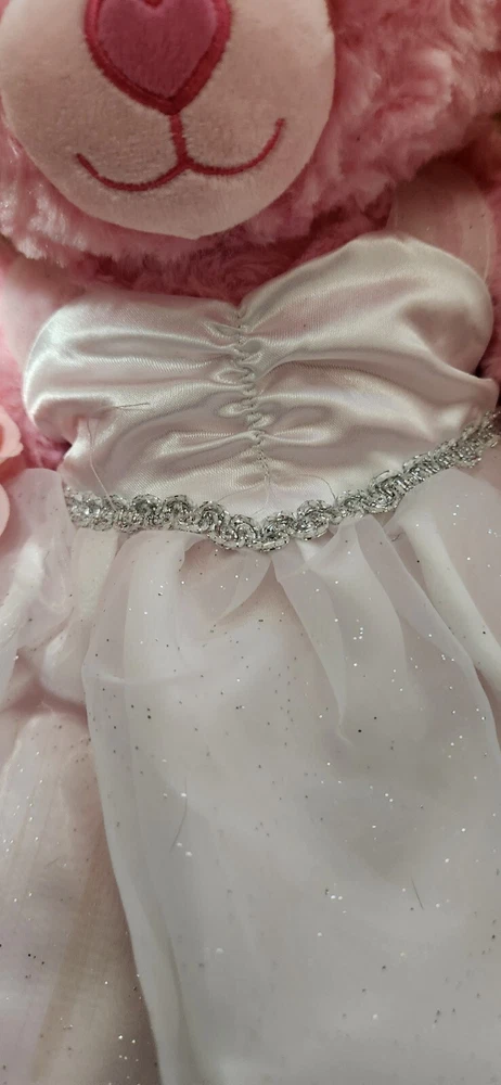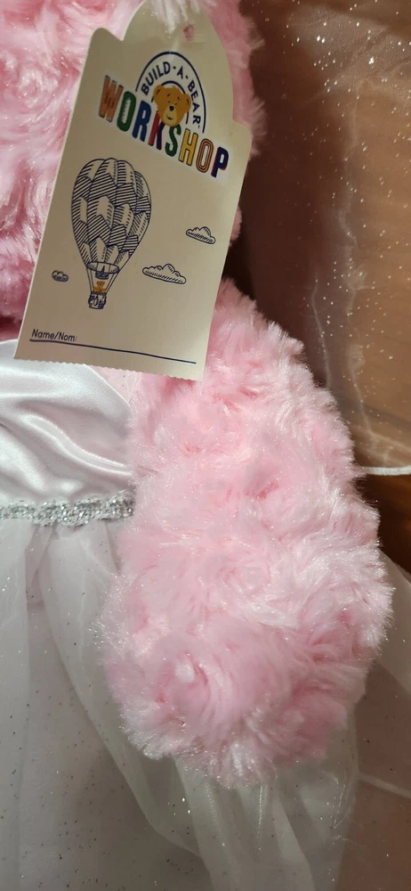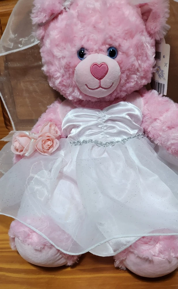 Brand new with tags Pink Cuddles BAB with sound ****plays here comes the bride, the sound chip is older i think so while the music starts out loud and normal, it starts to slow down and fade out after a few bars, still plays the whole song, its just starting to fade out**** Bear is spotless. Wedding dress new with tags Veil and corsage wristie also included
