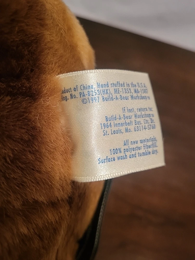 UPC:Does not applyRecommended Age Range:3+ yearsItems Included:JacketUnit of Sale:Single UnitCountry/Region of Manufacture:ChinaAnimal Species:BearType:PlushHandmade:NoFeatures:VintageSize:10in.Vintage:YesBrand:Build-A-Bear WorkshopModified Item:NoCustom Bundle:NoMPN:PL2Occasion:All OccasionEye Color:BlackColor:BrownBear Color:BrownNumber of Items:1Time Period Manufactured:1990-1999Animal:BearYear Manufactured:1997gtin13:Does not applyAntique:No