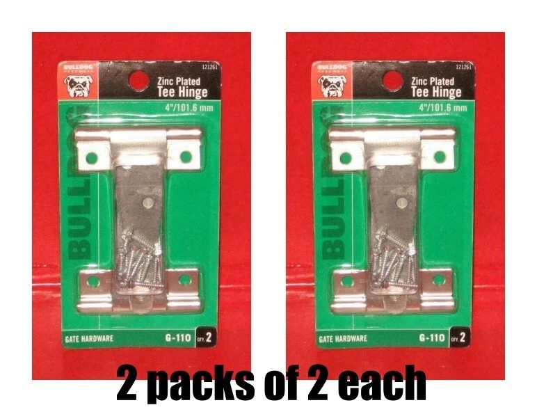 Bulldog Hardware 4" zinc plated tee hinges ( 2 per package 2 packs per order 4 hinges total ) New in original packaging Gate hardware for installing exterior or interior gates. Steel/zinc plated Free Shipping Thank you for taking a look at my listings. Please read the following information. If you have any questions about this information please contact me before shipment. Please do not accept the "guaranteed or estimated delivery date" as the day you will actually receive your items. Ebay and the USPS estimate that date and they are the ones that claim that is the date your items will arrive. Rarely does a package actually arrive on the estimated date of arrival due to many unforeseen circumstances such as weather, truck malfunction, traffic and more. And remember, once the package leaves my office and tracking shows "acceptance" or "distribution center" when tracking, I have no more control over it. If your package arrives damaged by mishandling from the USPS, you will need to go to your local post office and show them the damage so the clerk can file a claim. I sell name brand parts, supplies and health related items. I inspect each item carefully before shipment. All of these items have a manufacturer's contact information. If you need help using your item, or if you find the item doesn't work as you think it should, you will need to contact the manufacturer directly at the phone number or website information on the box. I cannot be held responsible for misuse or damage of the item. If you find the hair care you purchased is not working for you, or not up to the specifications you think it should be, contact the manufacturer. I cannot guide you through the process of using your items. Many items sold are still covered under the manufacturer's warranty. However, you must contact them for information. Listing and template services provided by inkFrog