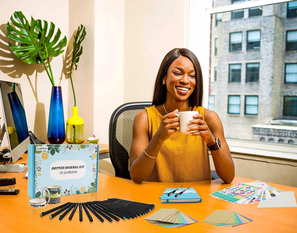 1 Dotted Hardcover Notebook: The faux leather point journal has 192 Numbered pages and size is 5.8”x 8.3”. The premium thick and acid-free dotted paper ensures resistant to bleeding and ghosting. It includes an Elastic Closure,1 Pen Holder Loop,2 Bookmarks,1 Back Pocket with humanized fillet design. 6 Washi Tapes and 10 Mini Envelopes with 10 Insert Card: 6 cute washi tapes in 3 sizes (0.3cm, 0.8cm and 1.5cm), these decorative tapes are perfect for adding color and small element to bullet dotted journal. 10 small envelopes and insert cards makes your journaling lots of fun. 24 Fineliner Pens and 2 Black Pens: 24 unique vibrant colored pens are best for dotted journal drawing, sketching and coloring. 2 black pens (0.5mm) are good for daily writing. 10 Reusable Stencil and 12 Sticker Sheets: 10 reusable journal stencils are durable and flexible, confirm to your A5 dot grid perfectly. 12 beautiful, fun planner stickers ensure your work finishing more attractive. Perfect Dot Journal Kit: The stationary set packed with a elegant box keep your energy active, various accessories support your life more colorful. It's also a best Christmas gift for women and men, teen boys and girls.