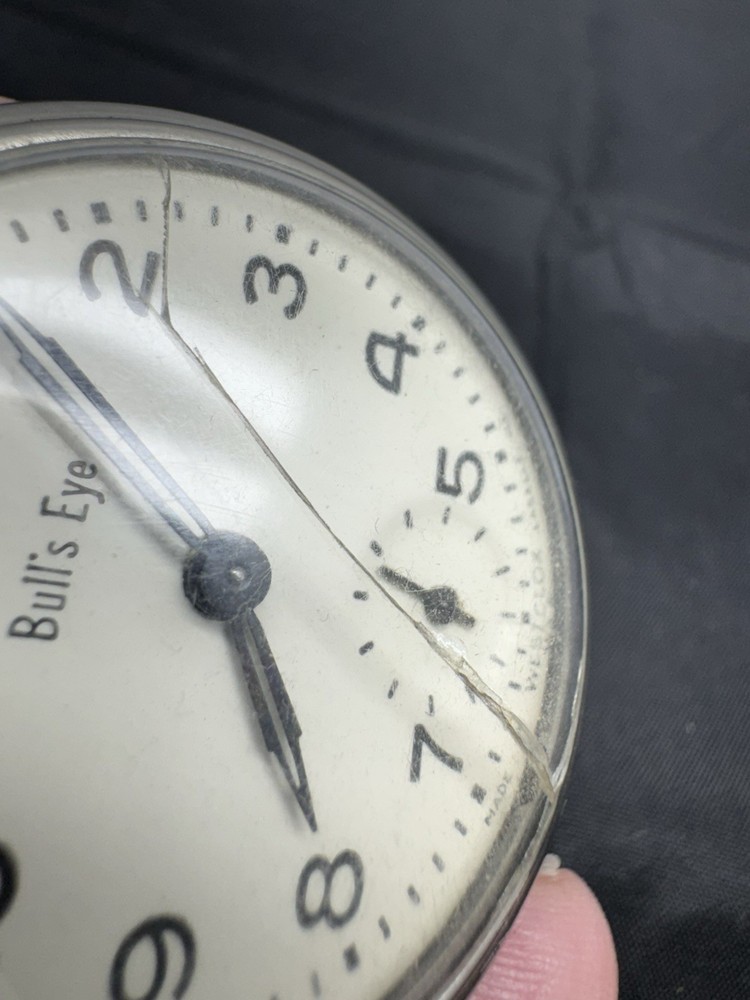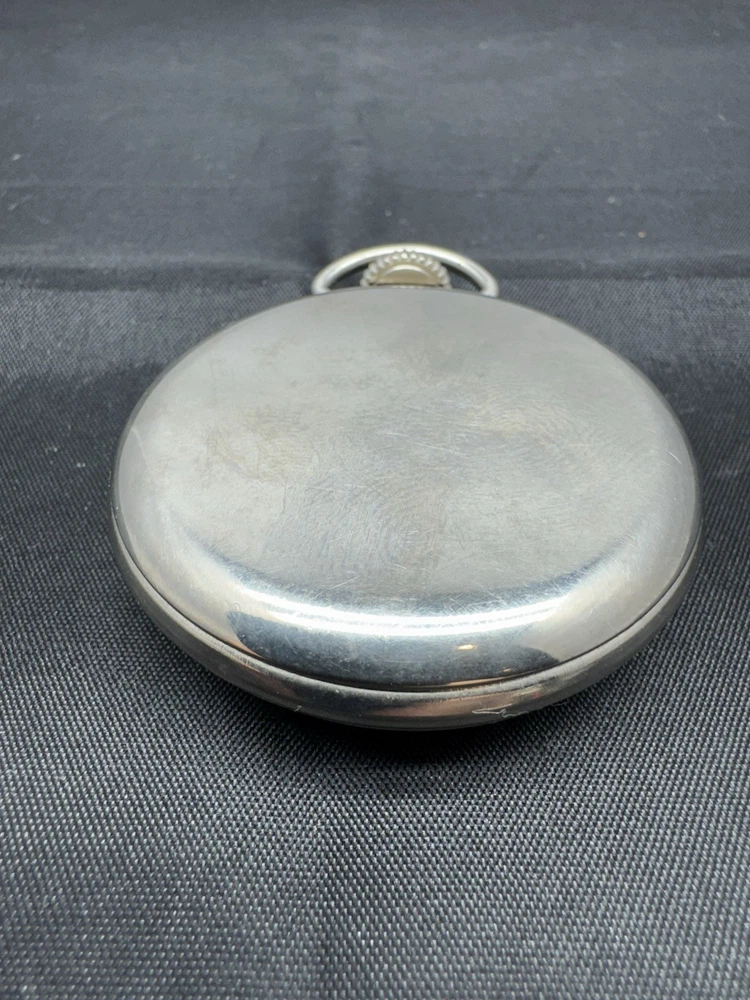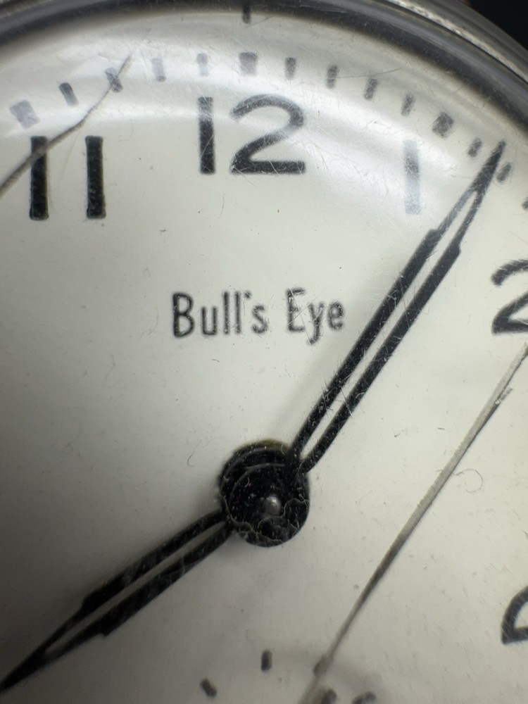 The Bull's Eye Vintage Pocket Watch by Westclox features an open face closure and Arabic numerals on a white dial. This mechanical (manual) watch has a polished silver case with a snap caseback. While it is not currently running, this vintage timepiece is a unique addition to any collection, with a 12-hour dial adding to its charm. Made in the United States, this pocket watch exudes a casual style and is perfect for those interested in classic analog watches.