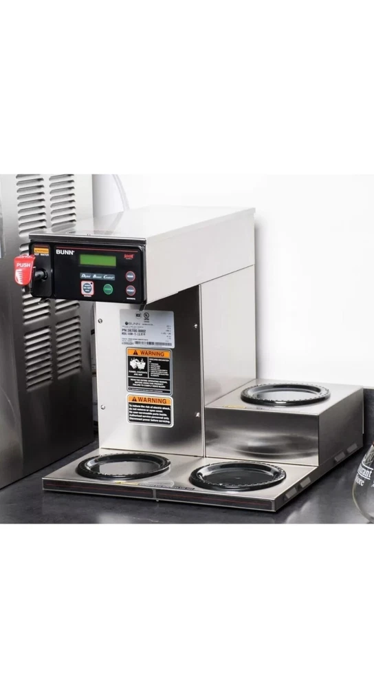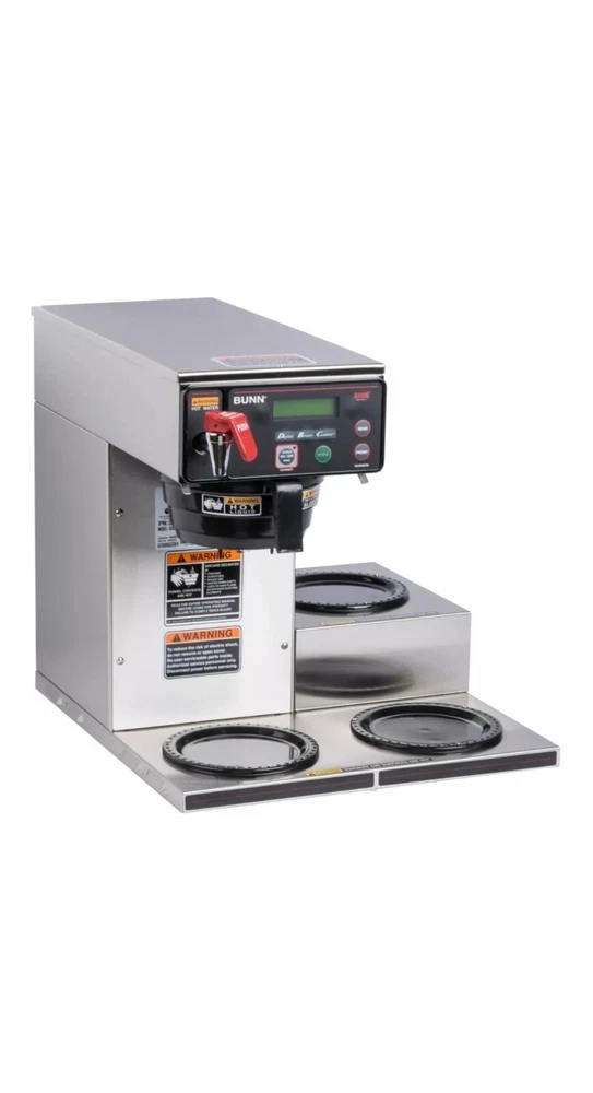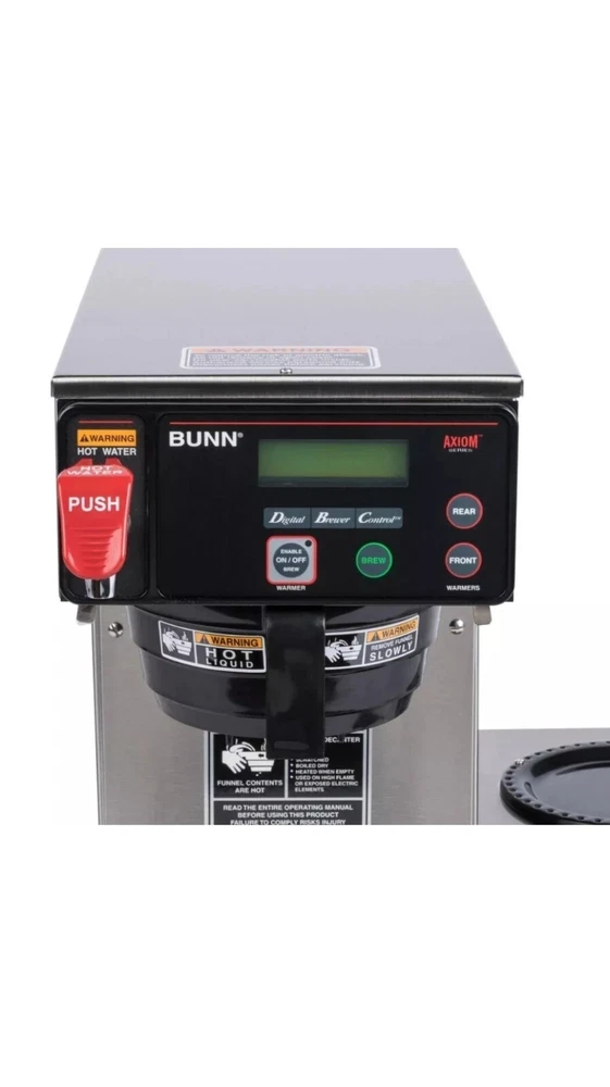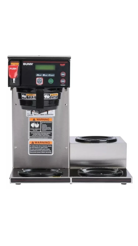 New open box. See all photos Lot 2D48 Bunn 38700.0002 Axiom 15-3 Automatic Coffee Brewer with 3 Lower Warmers - 120V This Bunn Axiom 15-3 automatic coffee brewer features simple, programmable digital controls and an LCD display. Its control system allows you to set brew levels, tank temperature, and pulse settings quickly and easily from the front of the brewer. The Bunn Axiom 15-3 automatic coffee brewer has a 120V, 15 amp, 1800 watt electrical rating. The Bunn Axiom 15-3 automatic coffee brewer can brew up to 4.2 gallons per hour into standard, 64 oz. decanters or Bunn 1GPR one gallon coffee servers! Its large 200 oz. water reservoir tank gives you the ability to brew back-to-back batches. This reliable machine has room to hold three decanters (sold separately) of coffee at once to ensure you always have a supply of hot coffee for your customers. Brews up to 4.2 gallons of coffee per hour 3 lower warmers with automatic shut-off Adjusts automatically to varying water pressures Energy-saver mode reduces tank temperature during idle periods Electronic diagnostics and built-in tank Separate hot water faucet for soups & other hot drinks Integrated SplashGard funnel prevents burns Amps: 15 Amps Hertz: 60 Hertz Voltage: 120 Volts Wattage: 1,800 Watts Brewer Type: Decanter Coffee Filter Size: 9 3/4" x 4 1/4"-4 1/2" Control Type: Digital Features: Hot Water Faucet NSF Listed Pourover Option Number of Warmers: 3 Output: 4 1/5 Gallons Per Hour Plug Type: NEMA 5-15P Power Type: Electric Style: Single Type: Coffee Brewers Water Source: Direct Connection\aisle 3