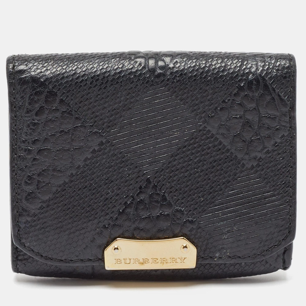 Burberrys card case is a wonderful accessory to pick as an everyday style essential. It is crafted with care and finished with a branded metal clasp.Certified by The Luxury Closet - This item has gone through a detailed authentication process overseen by our experts. We offer a lifetime guarantee of authenticity on all our items. Import duties, taxes and charges are not included in the item price. These charges are the buyers responsibility. Please check with your country’s customs office to determine what these additional cost will be prior to buying. Our eBay Store About Us Contact Us Add to Favorite Sellers Burberry Black Embossed Check Leather Flap Card Case $327.8 Burberrys card case is a wonderful accessory to pick as an everyday style essential. It is crafted with care and finished with a branded metal clasp. Product Details Brand Color Black Dimensions Height: 8.5 cm, Width: 2 cm, Length: 11 cm Material Leather Size Outsole Width Outsole Length Heel Height Includes The Luxury Closet Packaging Certified by The Luxury Closet This item has gone through a detailed authentication process overseen by our experts. We offer a lifetime guarantee of authenticity on all our items. How We Check The in-house team of experts at The Luxury Closet is highly trained to verify the authenticity and the condition of the luxury products. They ensure that only 100% authentic items are put on sale.The evaluation process is unique with its own mix of assessment criteria and differs according to the category. Each item is evaluated based on the following combination of hallmarks, hardware, stitching, symmetry, material, craftsmanship, stamping, codes, hologram stickers, and packaging. Our authenticators also check if the items have been modified or amended (e.g., aftermarket diamonds, replaced batteries, repaired bags, etc.) International Buyers Import duties, taxes and charges are not included in the item price. These charges are the buyers responsibility. Please check with your country’s customs office to determine what these additional cost will be prior to buying.