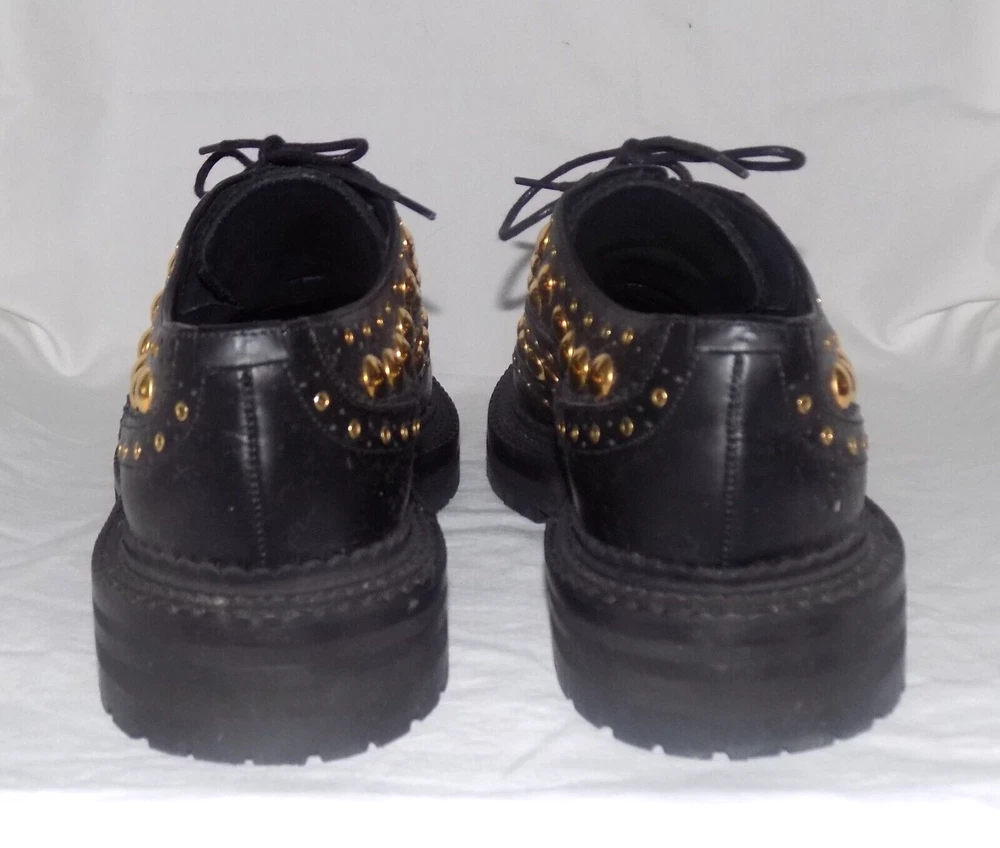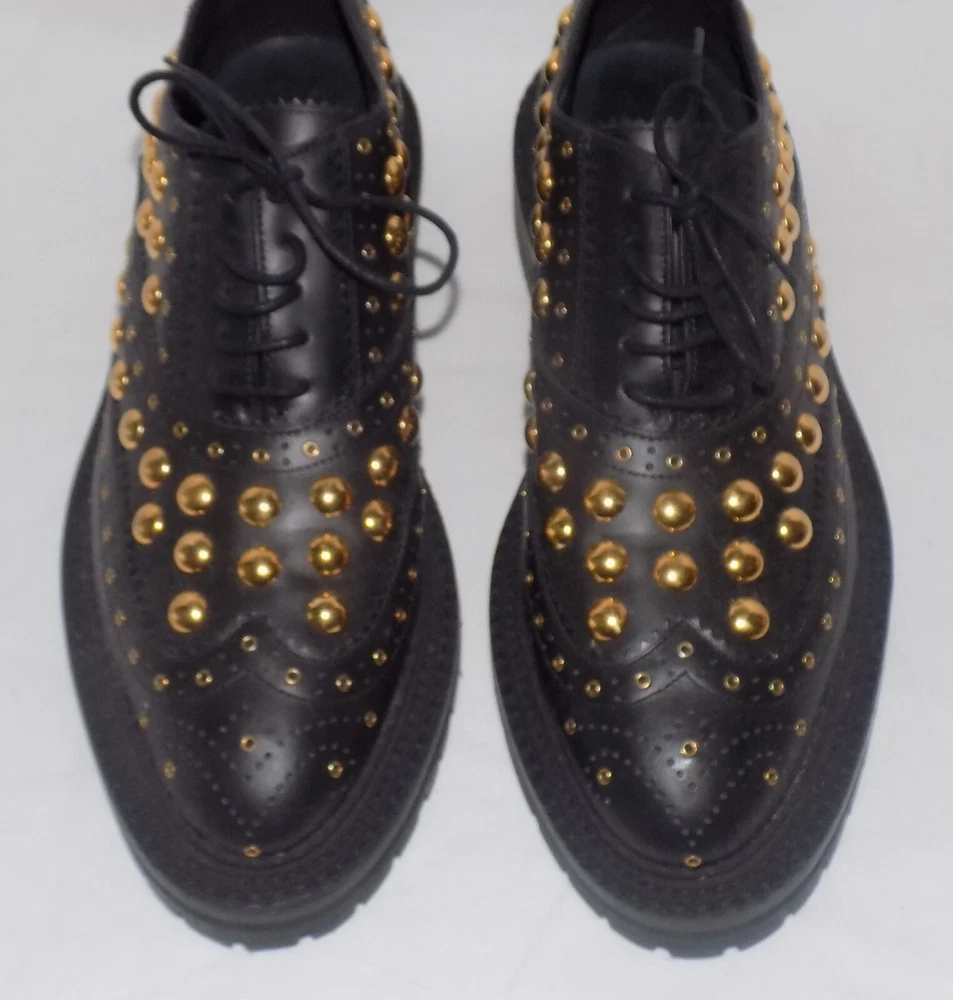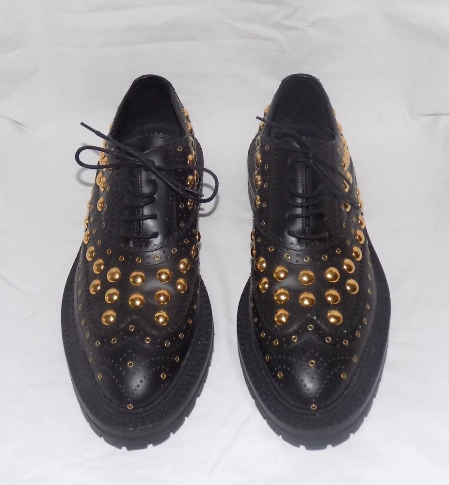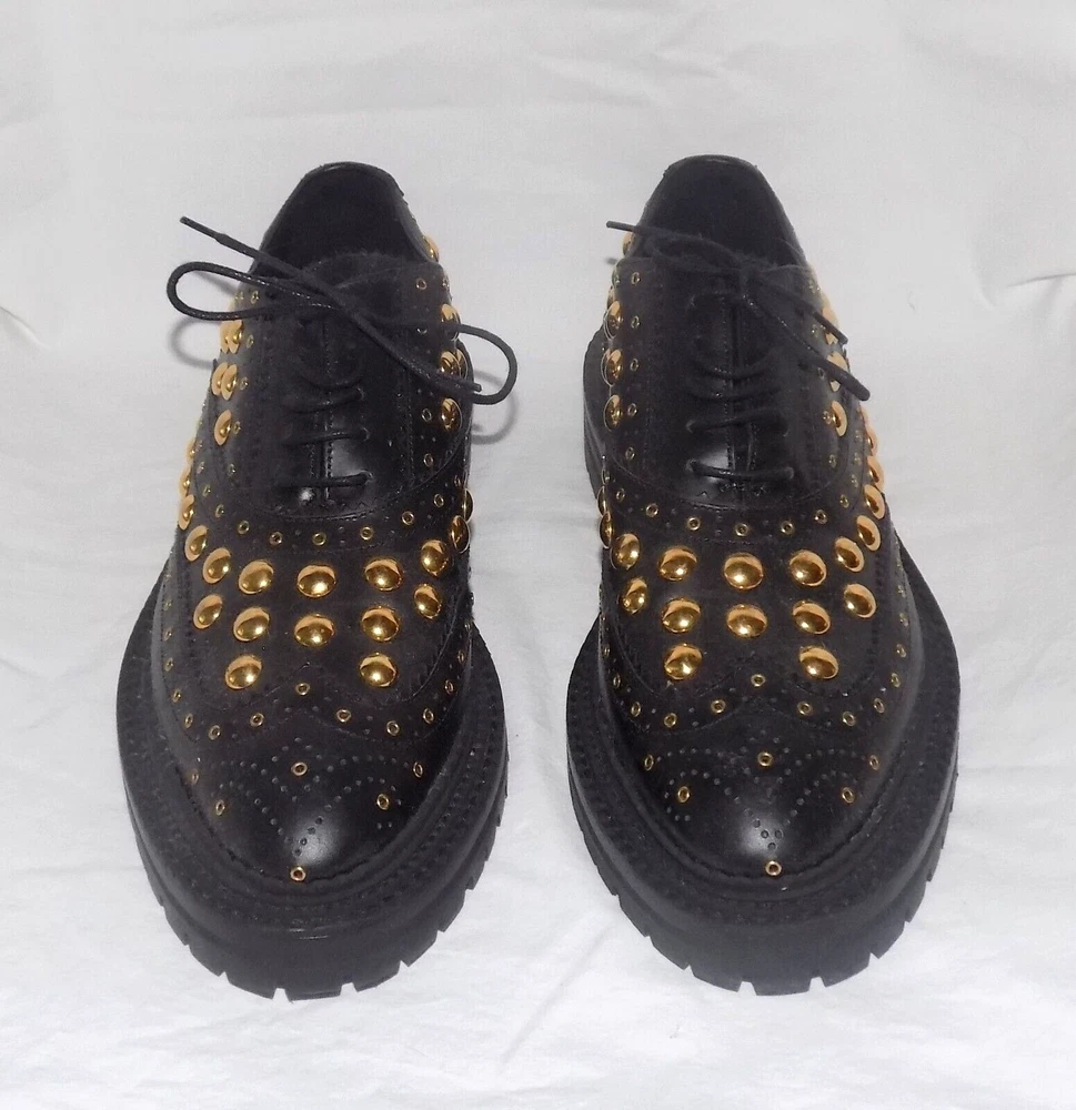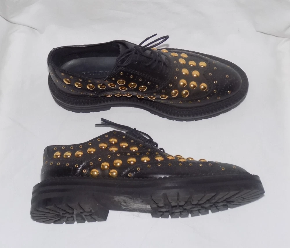 24 - If you are interested in having us sell your nice designer items on eBay, please contact us for information! CONSIGN WITH US NOW You are Bidding on a Gorgeous Pair of Burberry Studded Brogue Leather Platform Wingtip Oxford Dress Shoes Style Name - "Dearborn" Size 39 EUR / 9 US / 6 UK Color is Black Leather Uppers Embellished w/ Large Gold Tone Round Dome-Shaped Studs & Tiny Gold Tone Eyelets Throughout Oxford / Derby Style Tonal Lace-Up Self-Tie Closure Wingtip Almond Toe Perforated Brogue Detail & Serrated Edges Platform Design Low-Height Block Heel Leather Lining Chunky Lug-Style Treaded Rubber Sole Made in Italy Insoles Measures Approximately 10" in Length Heel Measures Approximately 1.25" in Height Sorry, No Box or Dust Bag In Excellent Pre-Owned Condition Check Out My Other Items! We combine shipping! Import duties, taxes and charges are not included in the item price or shipping charges. These charges are the buyer’s responsibility. Please check with your country’s customs office to determine what these additional costs will be prior to bidding/buying. These charges are normally collected by the delivering freight (shipping) company or when you pick the item up – do not confuse them for additional shipping charges. We do not mark merchandise values below value or mark items as gifts’ - US and International government regulations prohibit such behavior. We would like to sell your items for you! We specialize in higher end designers and are always looking for men's and women's clothing and accessories. Why take your fine items to a resale store when you can have access to million’s of people that shop on eBay? Why donate when you can get cash back? If you are interested, please e-mail us and we will forward the information to you. Look at our feedback. We are honest sellers and have sold thousands of designer items. PLEASE EMAIL US WITH ANY QUESTIONS WE RESERVE THE RIGHT TO RELIST ANY ITEM AFTER 2 DAYS IF THERE IS NO COMMUNICATION BETWEEN BUYER AND SELLER OR IF YOUR FEEDBACK IS 5 OR LESS. WE HAVE HAD MANY NON PAYERS AND WE REPORT ALL TO EBAY. WE SHIP MONDAY THROUGH FRIDAY AND ALL OF OUR ITEMS SHIP THE DAY AFTER WE RECEIVE PAYMENT UNLESS THE SHIPPING DAY FALLS ON A WEEKEND OR A HOLIDAY OUR SHIPMENTS ARE MAILED USING USPS PRIORITY MAIL UNLESS A DIFFERENT CARRIER IS SPECIFIED IN THE LISTING. WHEN WE ARE PAYING FOR SHIPPING WE RESERVE THE RIGHT TO SHIP WITH ANOTHER CARRIER. SIGNATURE CONFIRMATION WILL BE REQUIRED ON ALL SHIPMENTS OF $300.00 OR HIGHER. INTERNATIONAL SHIPMENTS WILL BE SHIPPED ON THE SAME SCHEDULE AS DOMESTIC SHIPMENTS. WE WILL ONLY SHIP INTERNATIONAL SHIPMENTS PRIORITY MAIL OR EXPRESS MAIL VIA USPS. WE WILL NOT FALSIFY CUSTOMS FORMS SO PLEASE DO NOT ASK US TO MARK AS A GIFT OR LOWER THE VALUE. WE PLACE THE VALUE ON THE CUSTOMS FORM AT THE PRICE THE ITEMS WERE PURCHASED FOR. WE WILL COMBINE SHIPPING FOR MULTIPLE PURCHASES ON OUR LISTINGS AS LONG AS THEY ARE PAID IN THE SAME TRANSACTION. WE WILL ONLY SHIP TO THE ADDRESS EBAY PROVIDES AT THE TIME OF THE PAYMENT TRANSACTION. PLEASE MAKE SURE THE ADDRESS YOU HAVE ON FILE WITH EBAY IS ACCURATE PRIOR TO PAYMENT. OUR ITEMS MAY HAVE CUT AND/OR MARKED TAGS. THIS IS DONE AT THE RETAIL LEVEL TO PREVENT RETURNS. THANKS FOR BIDDING! 1 Be sure to add us to your favorites list ! SZC627 K a: %%),%%),%_%,%)),%)),