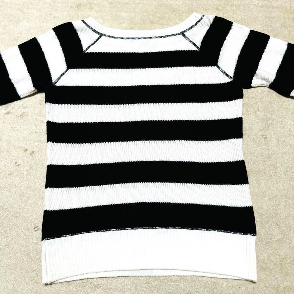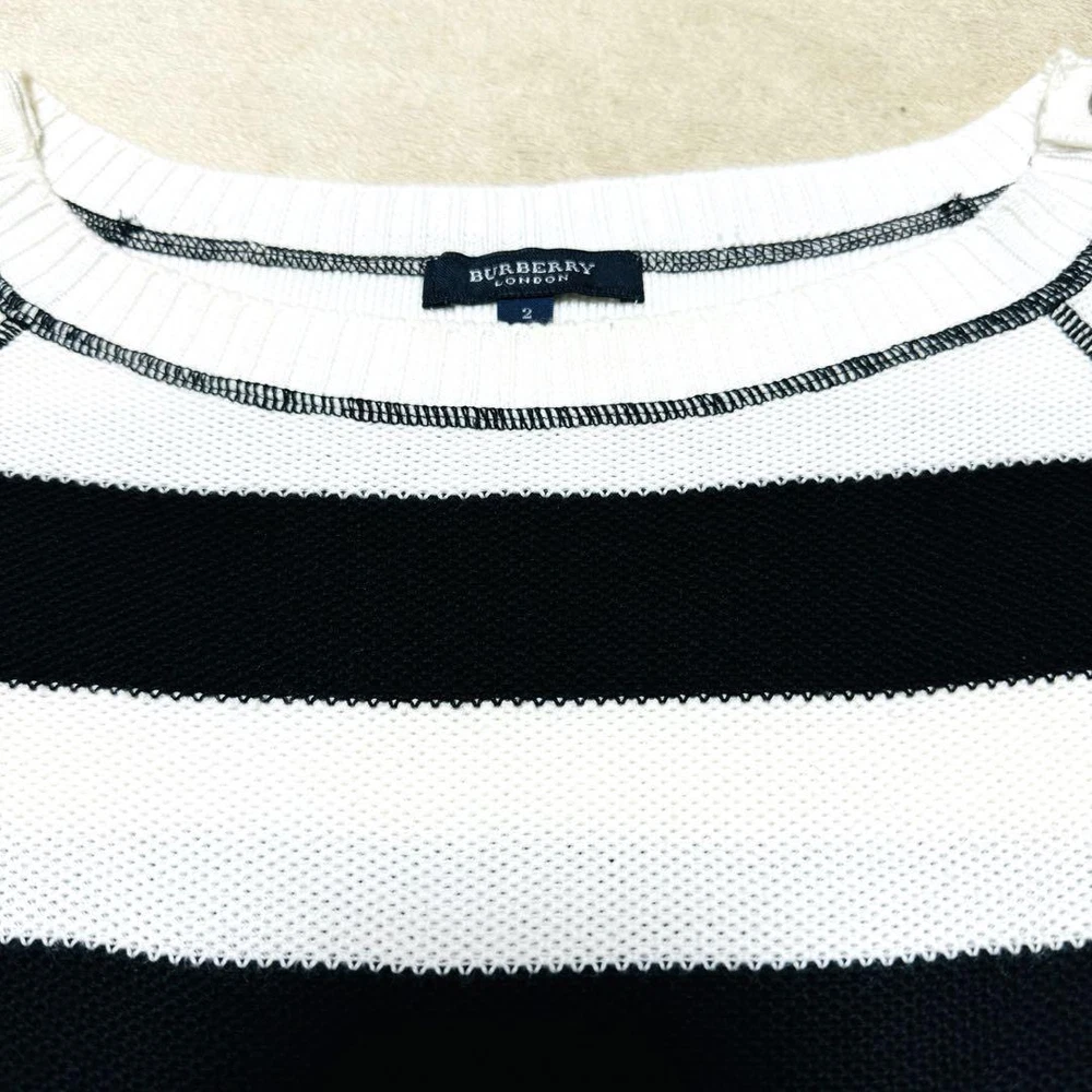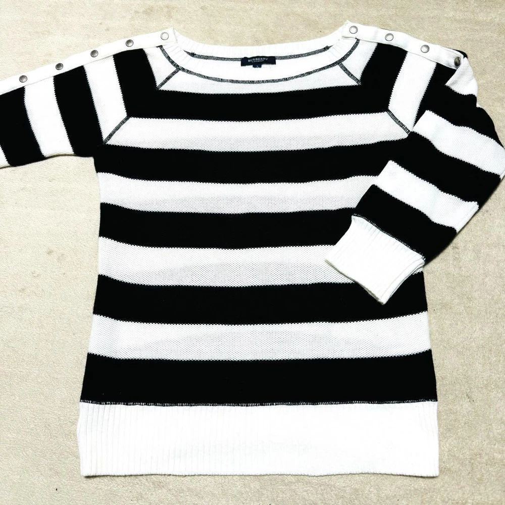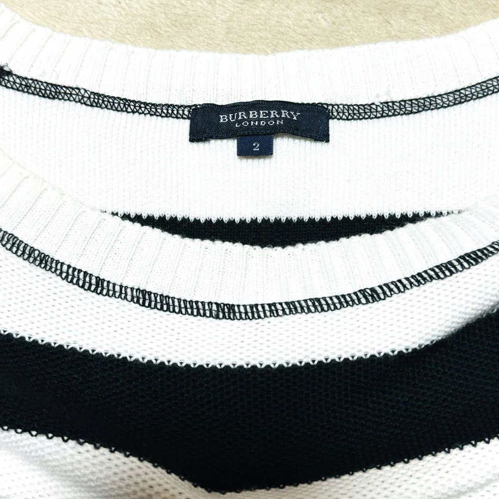 Burberry Blue Label Knit Sweater White & Black Stripe Thin M Size B Key Features **BURBERRY BLUELABEL Women's Knit Sweater** - **Brand:** BURBERRY BLUELABEL - **Product Type:** Knit Sweater - **Color:** White and Black - **Design:** Striped with Metal Buttons - **Size:** M (Size 2) - **Measurements:** - Length: 66 cm - Width: 46 cm - Body Length: 56 cm - Hem Width: 40 cm - **Condition:** B Rank - Slight signs of use, but overall in good condition with no noticeable damage or stains. - **Details:** - Lightweight design, perfect for spring and autumn wear. - From a smoke-free and pet-free environment, suitable for allergy sufferers. - Please note that folding may cause minor wrinkles. This stylish Burberry London striped knit is a versatile addition to your wardrobe! Specifications Brand Burberry London Country Japan Product Description Item Title Burberry London Border Knit Sweater Thin Metal Button 7 Sleeves M Payment Supports managed payments Please pay within 5 days after auction is finished. About Us We are located in Japan. It's our pleasure to make you happy by proposing our recommend item. If you have any questions or request about items, please feel free to ask us. International Buyers - Please Note: -Import duties, taxes, and charges are not included in the item price or shipping charges. These charges are the buyer's responsibility. -Please check with your country's customs office to determine what these additional costs will be prior to bidding/buying. -These charges are normally collected by the delivering freight (shipping) company or when you pick the item up - do not confuse them for additional shipping charges. -We do not mark merchandise values below value or mark items as - gifts - The US and International government regulations prohibit such behavior. Thank you for your understanding.