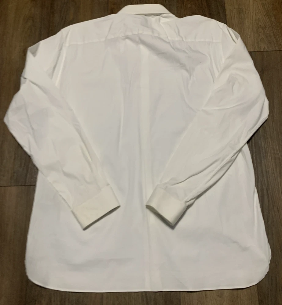 The Burberry London White Button Up Shirt is a stylish and sophisticated men's dress shirt designed for formal occasions. Made in Tunisia, this shirt features a solid white color and a classic fit with a collared neckline, long sleeves, and button closure. The light fabric wash and blended fabric of polyamide and cotton ensure comfort and durability. With its designer brand and London theme, this shirt exudes a timeless and elegant style perfect for weddings, business meetings, or any formal event. The size 17-43 and regular size type make it a versatile option for any man's wardrobe.