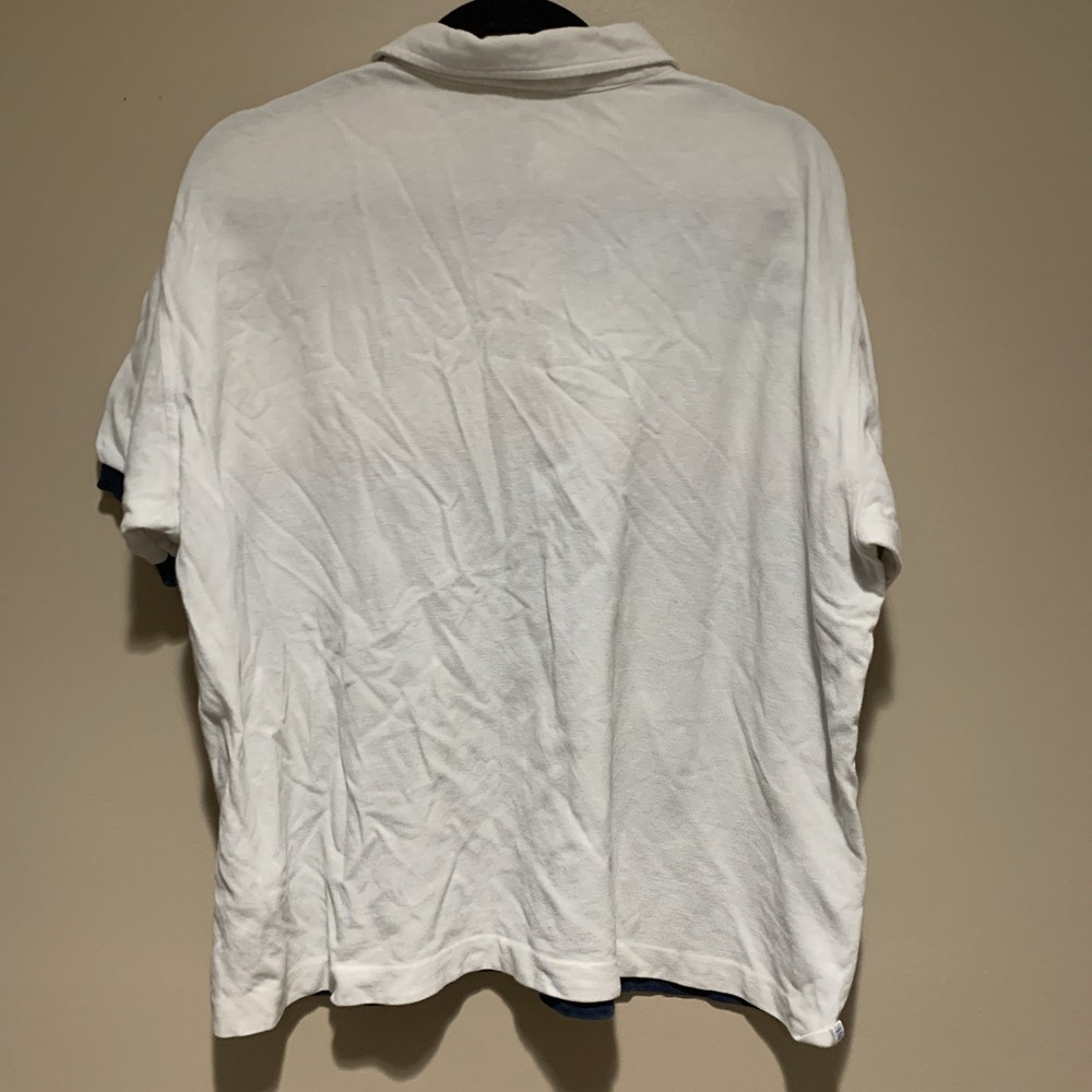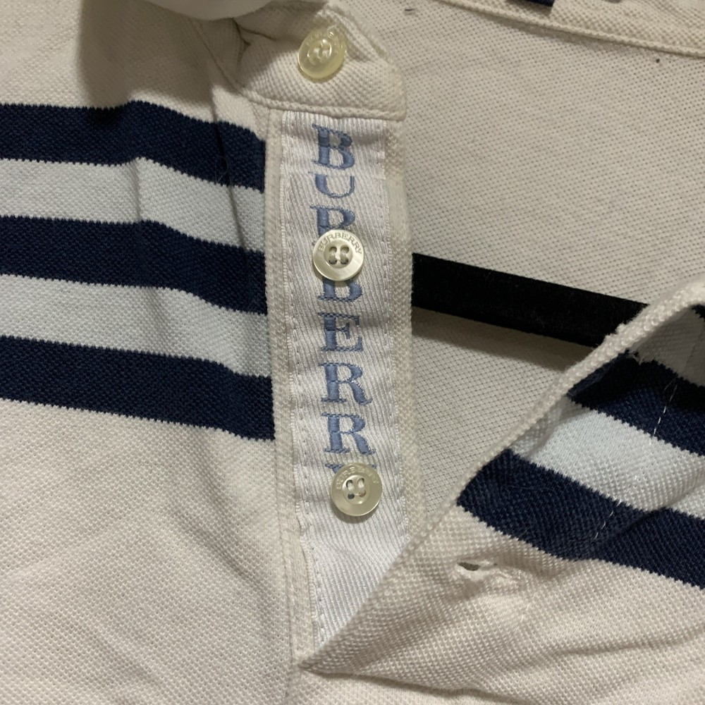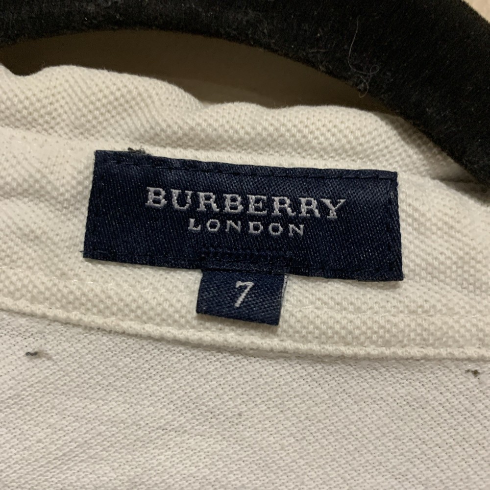 The Burberry London Men's Polo Shirt in size 7 features a classic collared neckline with a button closure. Made from cotton material, this short sleeve polo shirt is perfect for casual occasions in the summer, fall, or spring. The white, navy blue, and orange stripes add a stylish touch to the shirt, which is machine washable for easy care. The Burberry logo accentuates the regular fit of this timeless piece from the Burberry Brit product line.