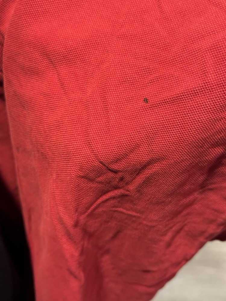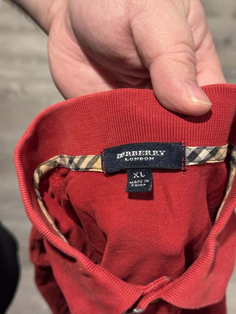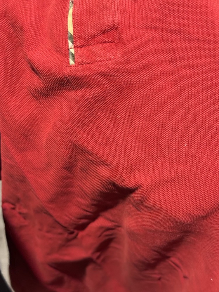 This Burberry Men's red polo shirt in size Large features a solid pattern with a collared neckline and short sleeves, making it a versatile and stylish choice for casual or business occasions. Made from 100% cotton, this regular fit polo is comfortable and durable, perfect for all seasons including winter, summer, fall, and spring. With the iconic Burberry brand, this shirt adds a touch of luxury to any wardrobe, capturing the essence of classic British style. Stains, selling as-is
