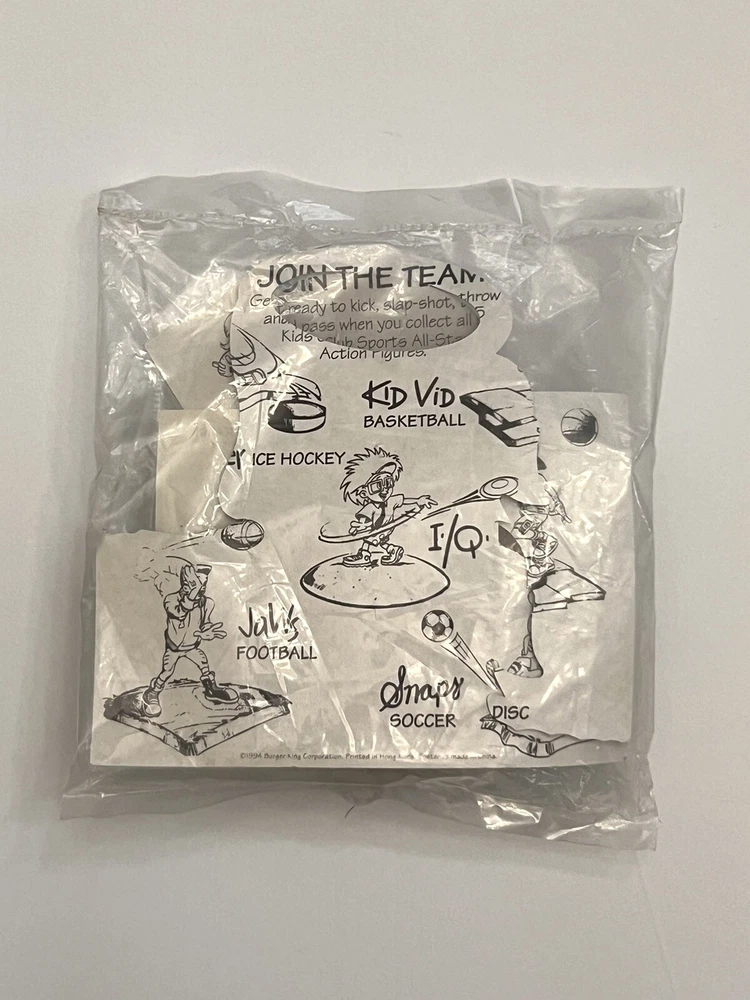 1994 All Star Sports Kids Burger King Kid's Meal Toy I.Q. Kid Throwing Frisbee. Note: the insert has come loose; shown in photo! Thank you for stopping by!