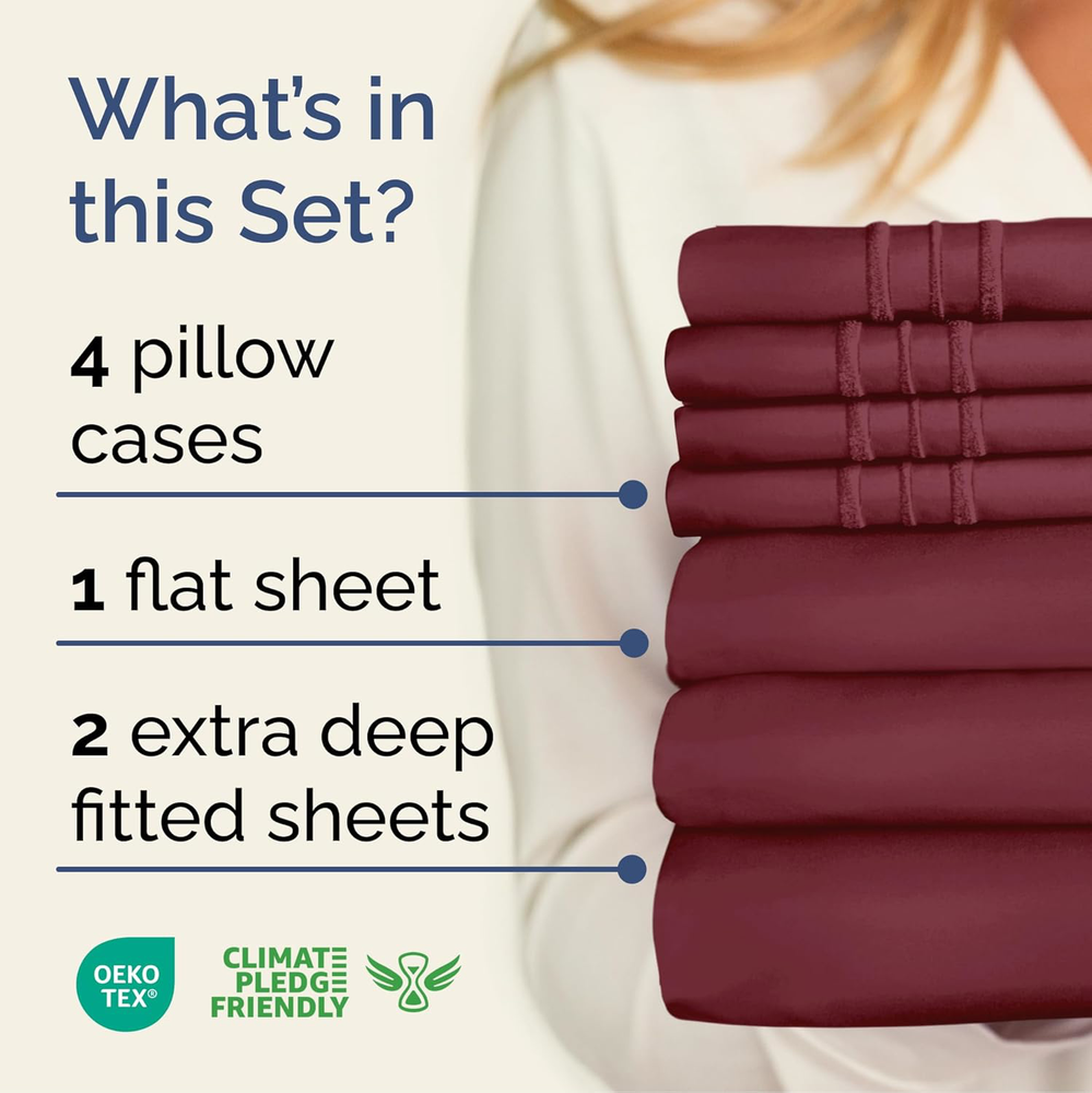 Fast Shipping Great Customer Support Satisfaction Guaranteed DESCRIPTION Shipping Shipping Shipping All domestic packages are shipped for Free (Unless other shipping method was selected during the checkout) Most items ship and arrive much sooner than the estimate delivery date. Usually within 2-3 days from payment. However, we have longer estimates to compensate for the occasional delay or supply chain breakdown. We do not accept P.O. BOXES - PLEASE PROVIDE A PHYSICAL ADDRESS Return Return Return In the event that you would like to return your purchase, we allow returns that are processed within the defined return date (the return date is to be found in the return policy/shipping and handling section) Please contact us for a return authorization and the return shipping address. Payment Payment Payment PayPal is our preferred method of payments it's the quickest, easiest and most secure way to pay for your goods or services online. PayPal offers buyer and seller protection should there be a problem. If you do not have a PayPal account, to get started and buy your first item with us is very easy. Simply click on the 'Buy It Now' button and follow the eBay checkout steps. Select PayPal as the payment method you then will be given the chance to enter your card details in to PayPal's secure checkout in order to pay for your order. Once the payment has been made, you will then be given the opportunity to make your own PayPal account to make paying for your items in the future very easy. Should there be a problem with payment please do let us know. Feedback Feedback Feedback Customer satisfaction is very important to us. If you have any problem with your order,please contact us and we will do our best to make you satisfied, please do not leave a negative feedback before we resolve your problem. We guarantee that your issue will be solved quickly. As long as you are happy with your purchase of , please leave us a positive feedback. Your feedback is very important to us it affects our search placement on eBay. We will leave a positive feedback for you in return automatically once we receive your feedback. Contact Us Contact Us Contact Us If you have any queries, please contact us via ebay. We usually respond within 24 hours on weekdays. Thank you for visiting our ebay store! EXTRA DEEP POCKET SPLIT KING SHEETS / EXTRA DEEP FITTED SPLIT KING SHEETS: These bed sheets are for very deep pocket mattresses. They fit any mattress with pockets that are 18, 20, 21, 22 and 24 inches deep. There's stretchable elastic around the extra deep fitted sheet which stretches for a nice tug around your mattress. Perfect for extra tall & large mattresses. Rest assured these oversized sheets will stay on tight & stay in place! 7 PIECE SHEET SET: This bed sheet set comes with 4 pillowcases total all with beautiful decorative embroidery design on each pillow case. The pillow cases have enclosure designs. This bedding set will accommodate your extra thick mattress perfectly. GREAT FOR DOUBLE PILLOW TOP MATTRESS: These bed sheets are perfect for mattresses with a 3 inch or 4 inch topper on top, memory foam toppers, big mattress pads, pillow tops, foam toppers, big foam toppers, pillow top mattresses and memory foam. These sheets will not come off. MICROFIBER: These are the softest type of microfiber bed sheets we have created. Super soft with a light feel. Not crisp like cotton. If you're accustomed to cotton sheets and you've never tried microfiber sheets we recommend you give these a try. They're even softer than cotton! DIMENSIONS & SIZES: Flat Sheet 113 wide and 102 long. Fitted sheet 39 wide and 80 long with 21 inch pockets (has elastic so it can stretch). All four pillow cases are oversized 20 x 40 inch. Burgundy Extra Deep Split King Sheet Set 7 Piece Cooling Wrinkle Free Click here to see description Fast Shipping Great Customer Support Satisfaction Guaranteed DESCRIPTION Shipping All domestic packages are shipped for Free (Unless other shipping method was selected during the checkout) We ship within two business days of payment, usually sooner Standard FREE shipping takes between 3-5 business days Expedited shipping takes between 2-3 business days Overnight shipping takes between 1-2 business days We do not accept P.O. BOXES - PLEASE PROVIDE A PHYSICAL ADDRESS We Ship Globally using ebay's GSP, the item is sent to a logistic center in KY and shipped from there to the rest of the world. International customers are responsible for all duties and taxes Contact your local authority for questions related to the amount of duties or taxes you will be responsible for Return In the event that you would like to return your purchase, we allow returns that are processed within the defined return date (the return date is to be found in the return policy/shipping and handling section) Please contact us for a return authorization and the return shipping address. Please contact us for a Return Merchandise Authorization (RMA) number. We advise you to use a reputable carrier service when returning your goods. Please pack all returns appropriately. We ship globally Via eBay's global shipping program (GSP). Thus we don't cover returns for items shipped globally. Buyers returning such items will be refunded ONLY for the item's cost and not for the shipping. please check the Voltage information and make sure it matches the one in your country. In case it's not stated in the description, do ask us. Payment PayPal is our preferred method of payments it's the quickest, easiest and most secure way to pay for your goods or services online. PayPal offers buyer and seller protection should there be a problem. If you do not have a PayPal account, to get started and buy your first item with us is very easy. Simply click on the 'Buy It Now' button and follow the eBay checkout steps. Select PayPal as the payment method you then will be given the chance to enter your card details in to PayPal's secure checkout in order to pay for your order. Once