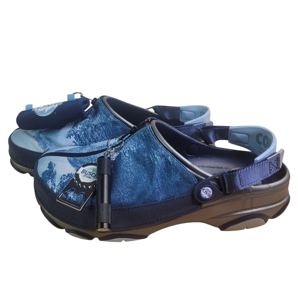 Busch Light Beer x Crocs Men's 11 All Terrain Clogs Bottle Opener Light Koozie These Crocs x Busch Light collaboration clogs are designed for men in a size 11. They feature a solid blue color with a slip-on closure and a bottle opener and light koozie accent. Ideal for casual occasions, these limited edition clogs are lightweight and comfortable, with an adjustable strap for a secure fit. Perfect for outdoor activities, they showcase the iconic Busch Light logo and are suitable for wearing in the summer, fall, and spring seasons. Made with rubber outsole material, these USA-themed clogs are a fun and functional choice for fans of Busch Light beer.