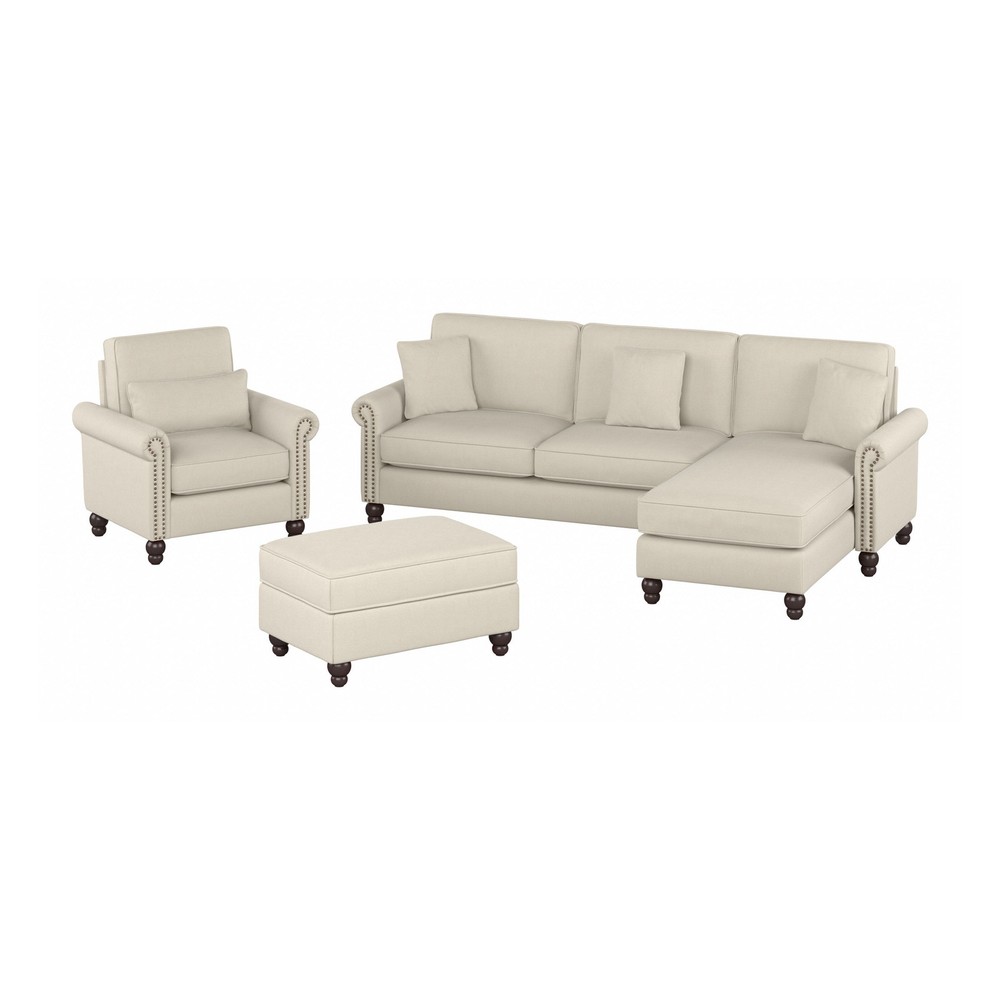 The Bush Furniture Coventry 102W Sectional Couch with Reversible Chaise Lounge, Accent Chair, and Ottoman boasts remarkable quality and durability to match its classic style. Conveniently packaged for easy movement into and around any room or tight-fitting corridor, this ready-to-assemble living room set with matching pillows offers a practical solution for furnishing a small apartment, large home and everything in between. Enjoy the company of friends and family or take a moment to relax by yourself on a sofa and chair set with high-density foam cushioning and pocket coil seat springs that maintain their shape and feel for years of comfort. Reversible seat and back cushions feature kid and pet-friendly StainGard(TM) fabric that repels dirt, oil, water and other liquids to prevent Free Shipping Over $49.99* Details Bush Furniture Coventry 102W Chaise Couch with Armchair and Ottoman Product Description: The Bush Furniture Coventry 102W Sectional Couch with Reversible Chaise Lounge, Accent Chair, and Ottoman boasts remarkable quality and durability to match its classic style. Conveniently packaged for easy movement into and around any room or tight-fitting corridor, this ready-to-assemble living room set with matching pillows offers a practical solution for furnishing a small apartment, large home and everything in between. Enjoy the company of friends and family or take a moment to relax by yourself on a sofa and chair set with high-density foam cushioning and pocket coil seat springs that maintain their shape and feel for years of comfort. Reversible seat and back cushions feature kid and pet-friendly StainGard(TM) fabric that repels dirt, oil, water and other liquids to prevent unsightly blemishes. The sturdy metal and wood framework includes a quiet sinuous spring design with cross supports that won't sag or shift over time. Espresso-stained rounded bun feet, rolled armrests and nailhead trim reflect a sophisticated style that perfectly complements French country, farmhouse, coastal and traditional decor. Keep blankets, reading materials and more in the Storage Ottoman while resting your feet on its padded surface. This living room set has been rigorously tested for safety, durability and stain resistance and is backed by a 1 Year Warranty. Bundle includes102W Sectional Couch with Reversible Chaise Lounge, Accent Chair with Arms, Storage Ottoman, Set of 3 Pillows, Lumbar Pillow Reversible Chaise Lounge can be set up on whichever side you prefer for a custom sofa configuration PFAS-free performance fabric with StainGard(TM) protects against spills, blemishes, and abrasions; perfect for homes with children and pets Improved cushion design features pocket coil seat springs and medium-firm foam casing to maintain a consistent shape and feel Chaise Sofa has a weight capacity of 825 pounds while the Armchair supports up to 275 pounds Durable framework includes a quiet sinuous spring design with cross supports that won't sag or shift over time Upholstered Ottoman provides a comfortable footrest; internal storage organizes blankets, reading materials and more Living room set's Espresso-stained rounded bun feet have felt padding to avoid scratching non-carpeted surfaces Cushions are reversible for even wear over time; cushion covers can be removed and washed for extra tough messes Meets ANSI/BIFMA standards for safety and performance; backed by the Bush Furniture 1 Year Manufacturer's Warranty