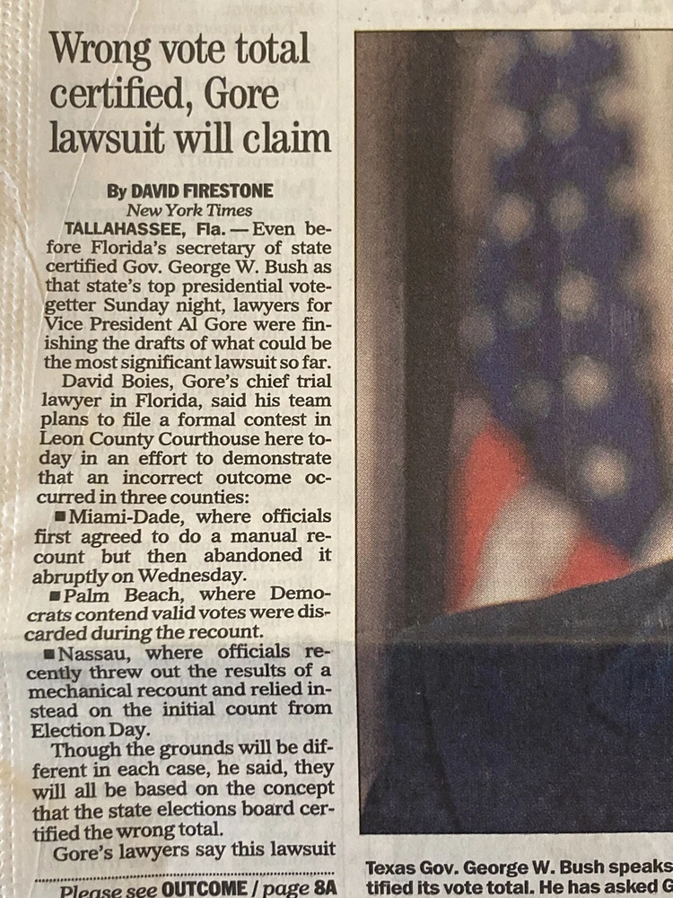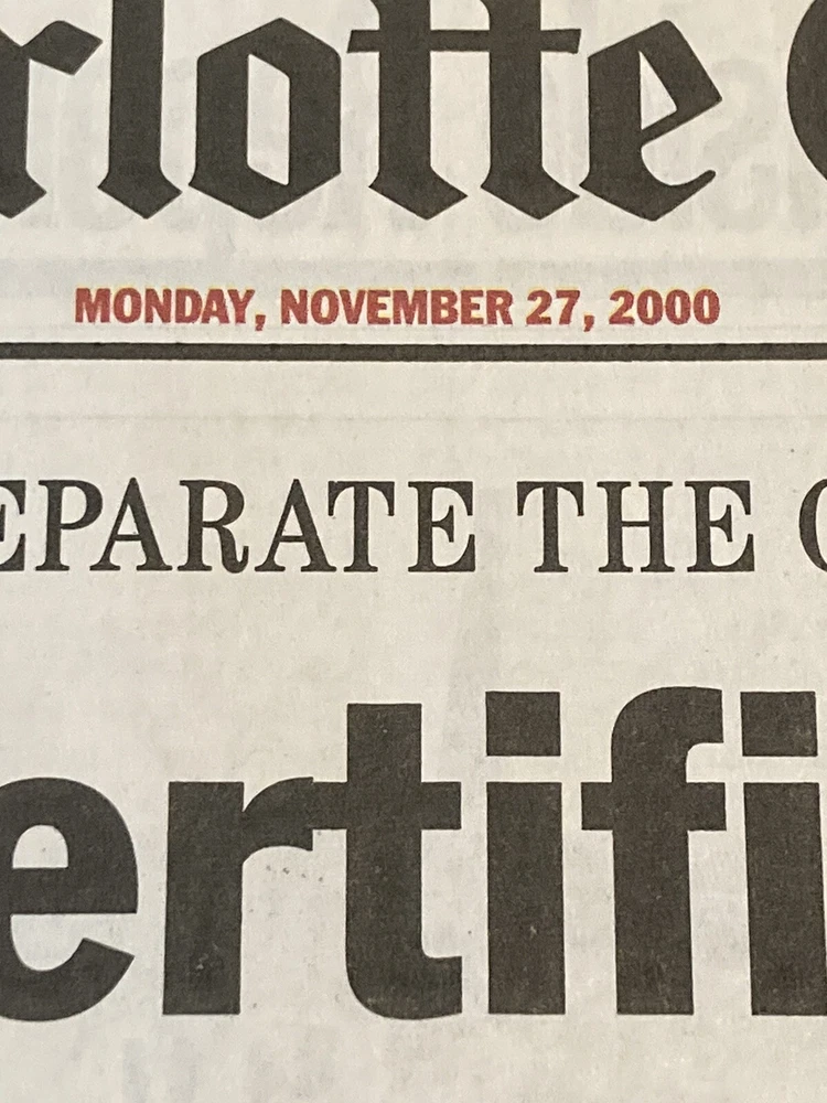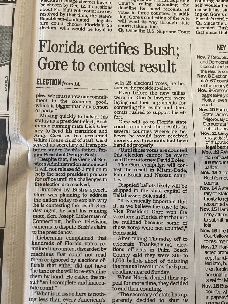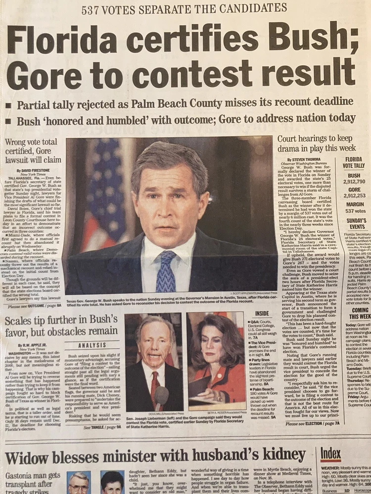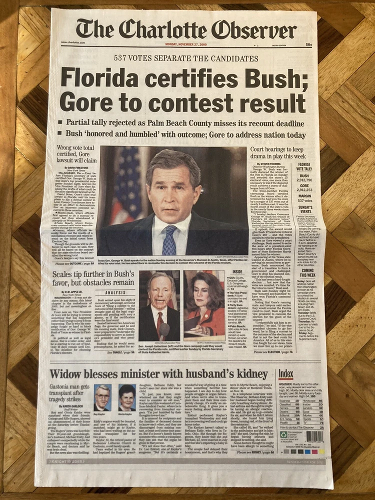 Bush v. Gore Florida Certifies 2000 Election Result November 27 2000 Historic Collectible Newspaper The Charlotte Observer Do not miss out on your chance to own or gift a unique piece of history! Bush v. Gore Florida Certifies 2000 Election Result published in the Monday, November 27 2000 The Charlotte Observer (Charlotte, NC USA) newspaper. Headline: Florida certifies Bush; Gore to contest result - 537 Votes Separate The Candidates. Front section with headline, photos and articles covering the historic events! The 2000 United States presidential election in Florida took place on November 7, 2000, as part of the nationwide presidential election. Florida, a swing state, had a major recount dispute that took center stage in the election. The outcome of the 2000 United States presidential election was not known for more than a month after balloting because of the extended process of counting and recounting Florida's presidential ballots. After an intense recount process and the United States Supreme Court's decision in Bush v. Gore, Bush won Florida’s electoral votes by a margin of only 537 votes out of almost six million cast and, as a result, became the president-elect. The process was extremely divisive and led to calls for electoral reform in Florida. 12 pages original. Size is approximately 12.5"x24". No significant imperfections or damage observed. Small imperfections are not necessarily uncommon given the age of the piece. Overall, this piece is in Very Good condition and will absolutely be an impressive display or archive item for any collector, enthusiast, or historian. Great for framing. A unique gift. Most printed items are often from my personal collection. I have been an enthusiast for over 25 years. Unfortunately, I just cannot keep them all. Each is a unique pre-loved vintage, historic, and/or collectible piece. Obvious imperfections or damage are noted in the description and photographed. Typically this kind of item is gently rolled with protective plastic to limit moisture and shipped in a document tube or equivalent. Send a message if you have questions. Adam
