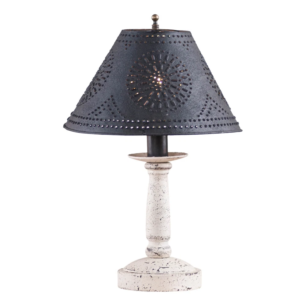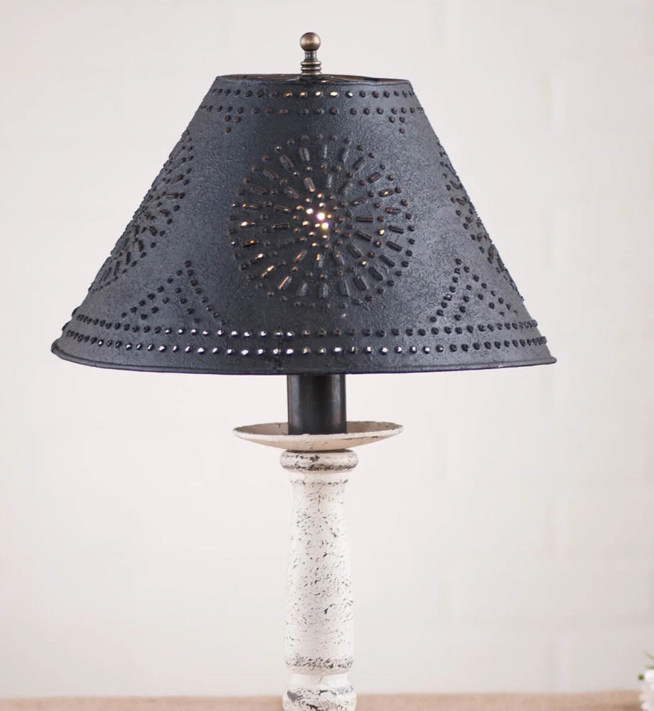 The Butcher's Lamp Base is a smaller sized lamp that is perfect as an accent lamp or a bedside lamp. One E26/Medium (Standard) socket, 150 watts max. Textured and slightly distressed white body color. Handcrafted in Pennsylvania. Includes a 12-Inch Textured Black Flared Shade #925-1CBK. Lamp base without shade and alternate shade options are shown under related items below. Our eBay Store About Us Add to Favorite Sellers Butcher's Lamp in Americana White with Shade Measures 18.75-Inch high and 12.5-Inch diameter Has a 7-foot cord and line switch; Plugs into wall outlet; Standard socket, 1 x 150 watts maximum watts. UL listed for dry locations Textured vintage white paint finish; Black textured shade is included Lamp Base is made in the USA, Shade is Imported The Butcher's Lamp Base is a smaller sized lamp that is perfect as an accent lamp or a bedside lamp. One E26/Medium (Standard) socket, 150 watts max. Textured and slightly distressed white body color. Handcrafted in Pennsylvania. Includes a 12-Inch Textured Black Flared Shade #925-1CBK. Lamp base without shade and alternate shade options are shown under related items below. Product Details Color White Height 18.75 Length 12.5 Weight