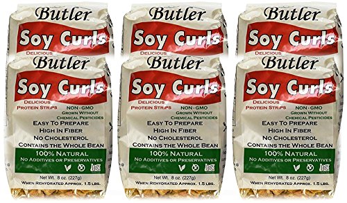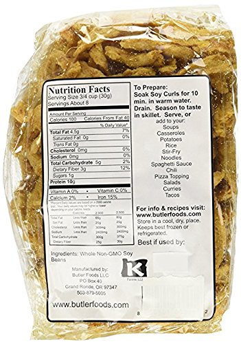Gluten Free Vegan Non GMO Contains the Whole Soy Bean 100% Natural It has been recommended that diets low in saturated fat and cholesterol that include 25 grams of soy protein a day may reduce the risk of heart disease. What luck, because one serving of these new Soy Curls from Butler Foods provides 10 grams of all-natural soy protein! Very versatile and can be incorporated into all kinds of recipes to add natural protein and fiber. Simply soak for about 10 min. in warm water to rehydrate, and they're ready to add to your favorite dish. As they are unflavored, they can take on any flavor you wish them to. Contain all the fiber and protein of select whole soybeans. All natural, no preservatives or additives, and no chemicals used in processing. Soy Curls make a great addition to soups, casseroles, potatoes, rice, stir-fry, noodles, spaghetti sauce, chili, pizza topping, salads, curries, enchiladas, and much more! 8 oz bag (makes 1.5 lbs when rehydrated). Directions: Soak Soy Curls for 10 minutes in warm water. Drain. Season to taste in skillet. Serve.